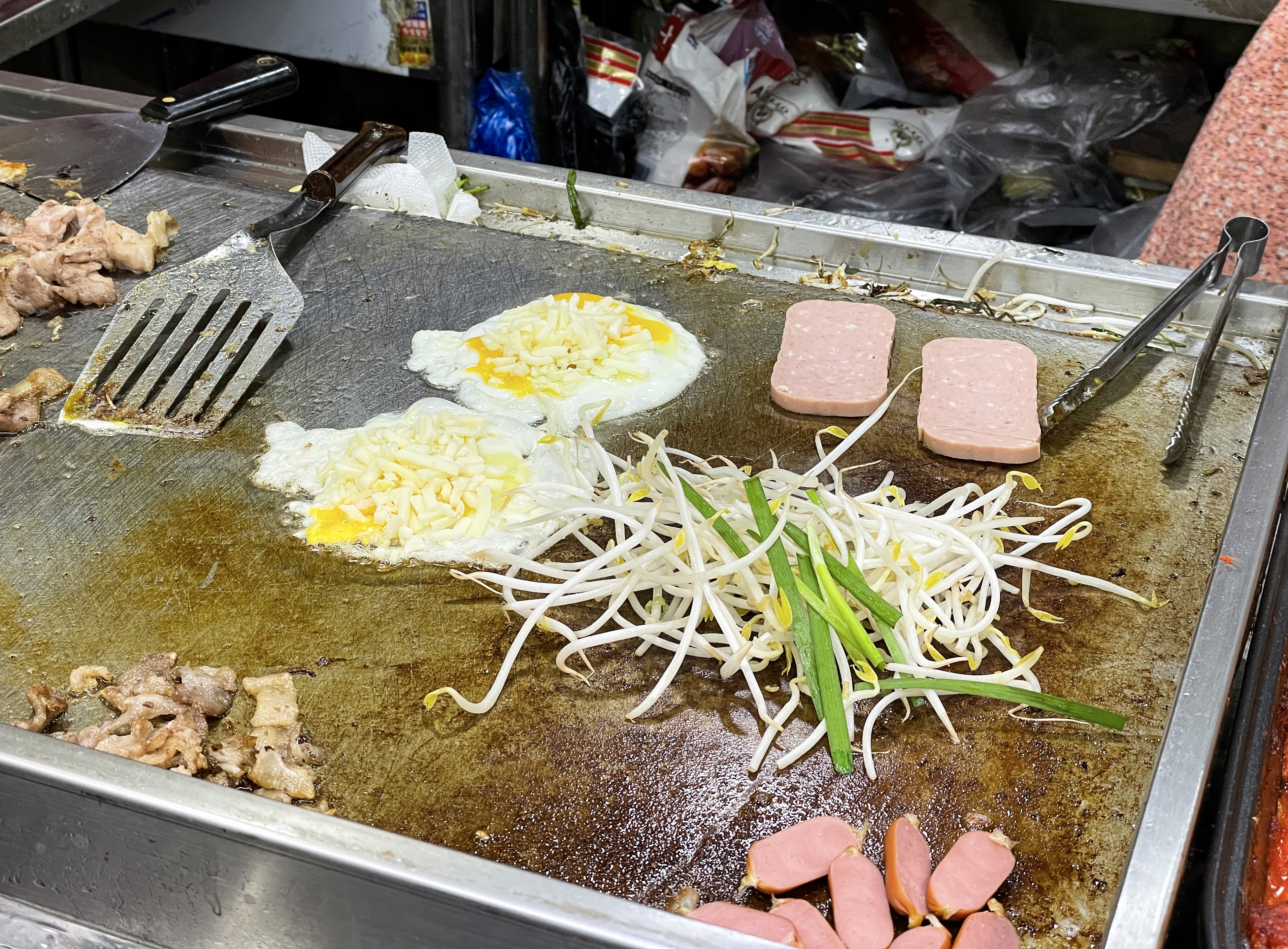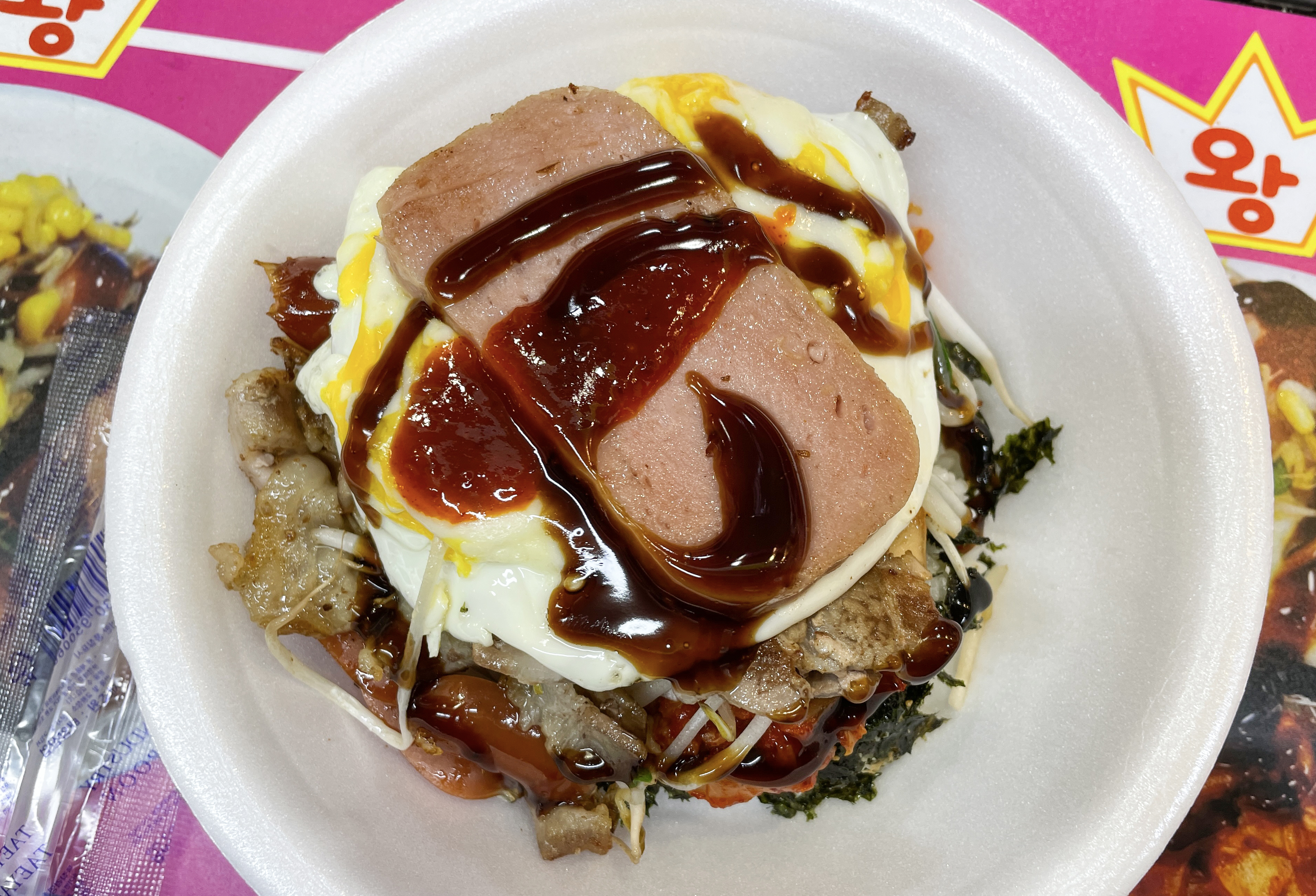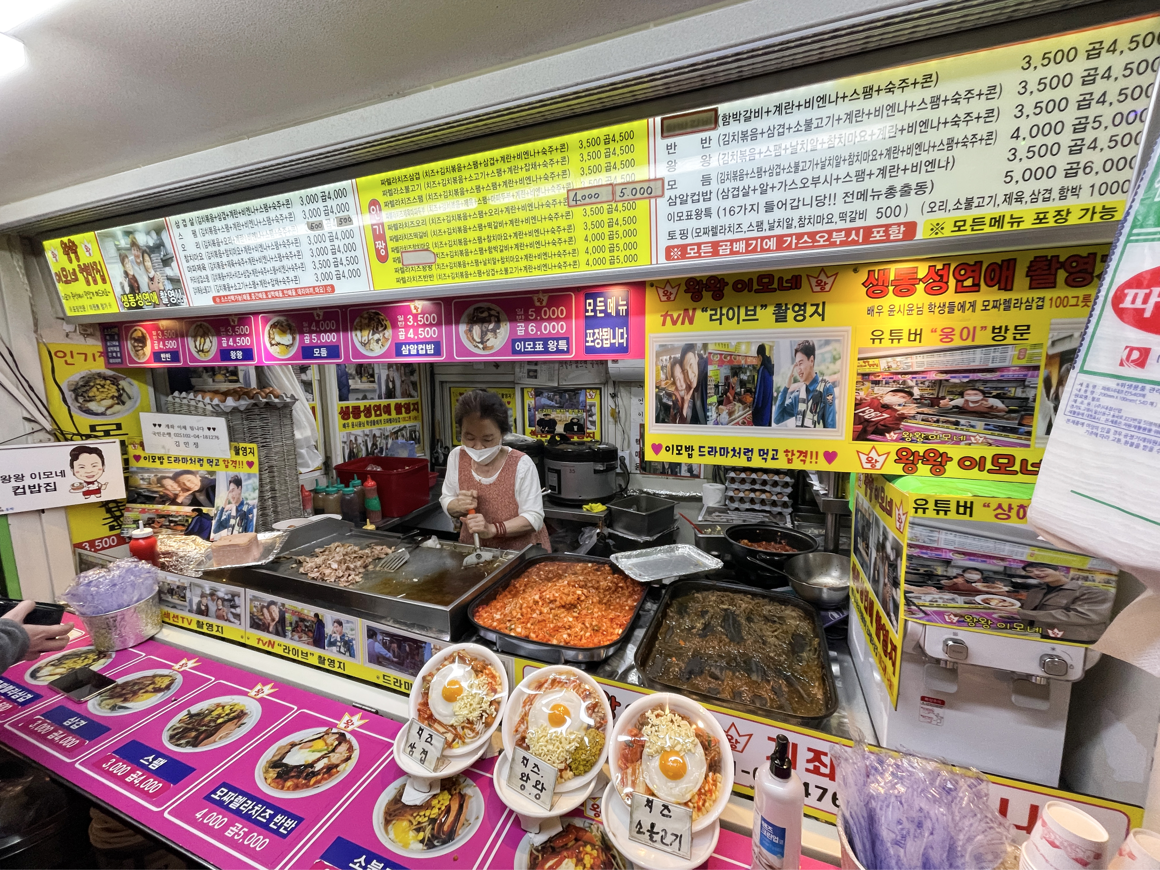 왕왕 이모네 컵밥에 들어가는 기본적인 재료는 미리 만들어져 있지만, 달걀프라이나 스팸 같은 경우에는 자리에서 직접 불판에서 익혀주시더라고요. 컵밥 1개에 3,500원인데 김치볶음도 들어가고, 치즈와 스팸, 삼겹살, 계란, 비엔나소시지, 숙주, 콘까지 들어가니 꽤 배불리 먹을 수 있겠더라고요.