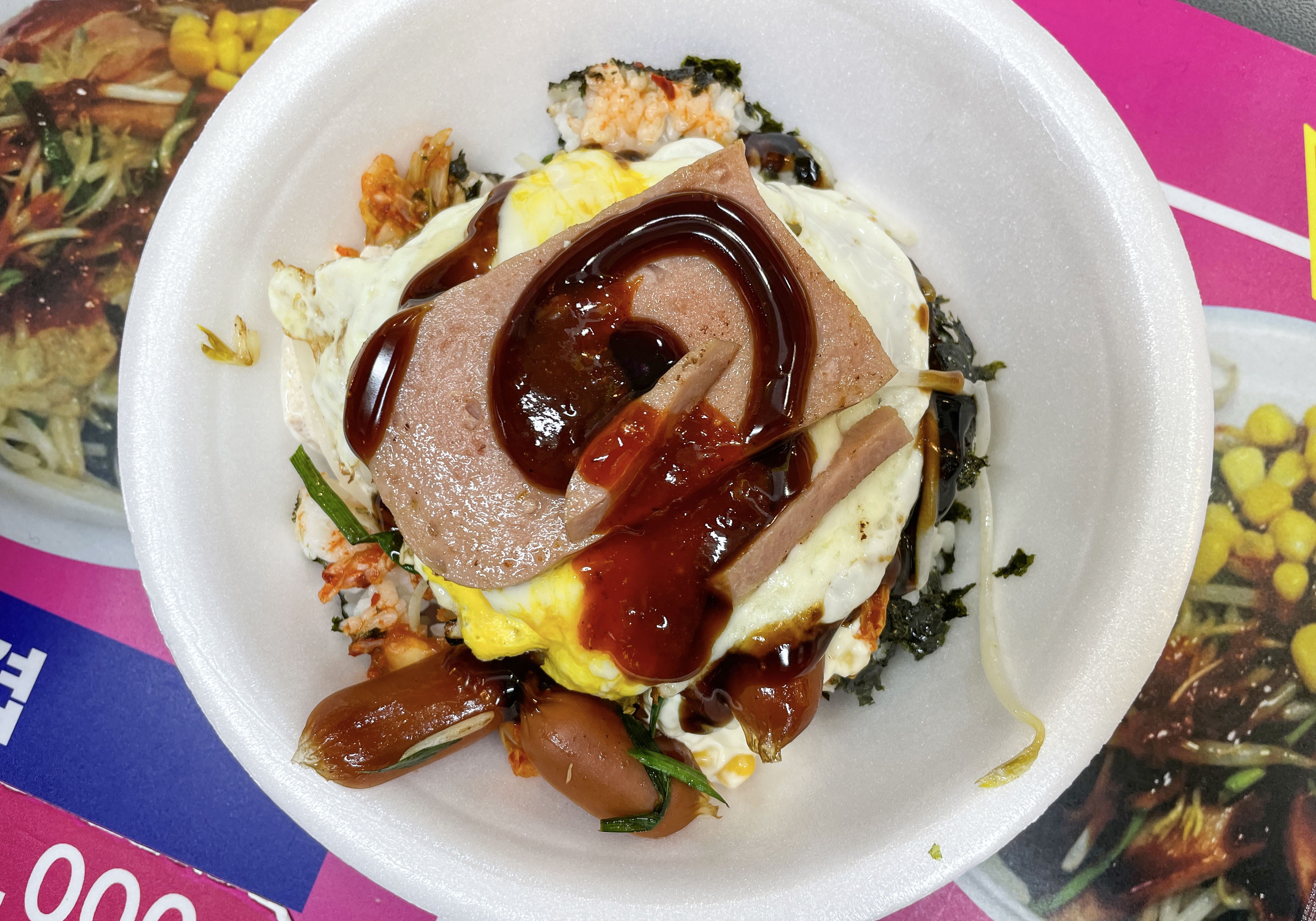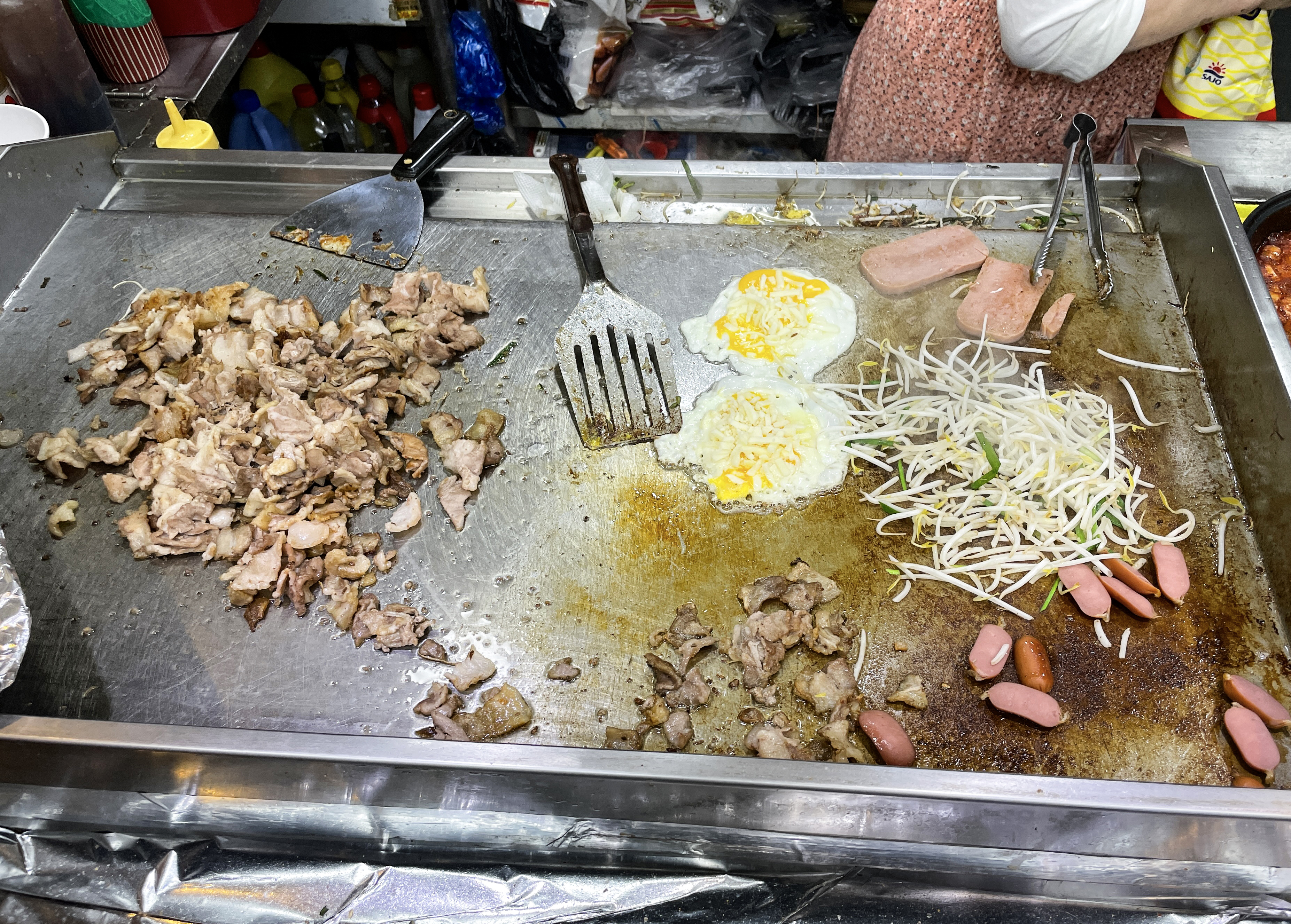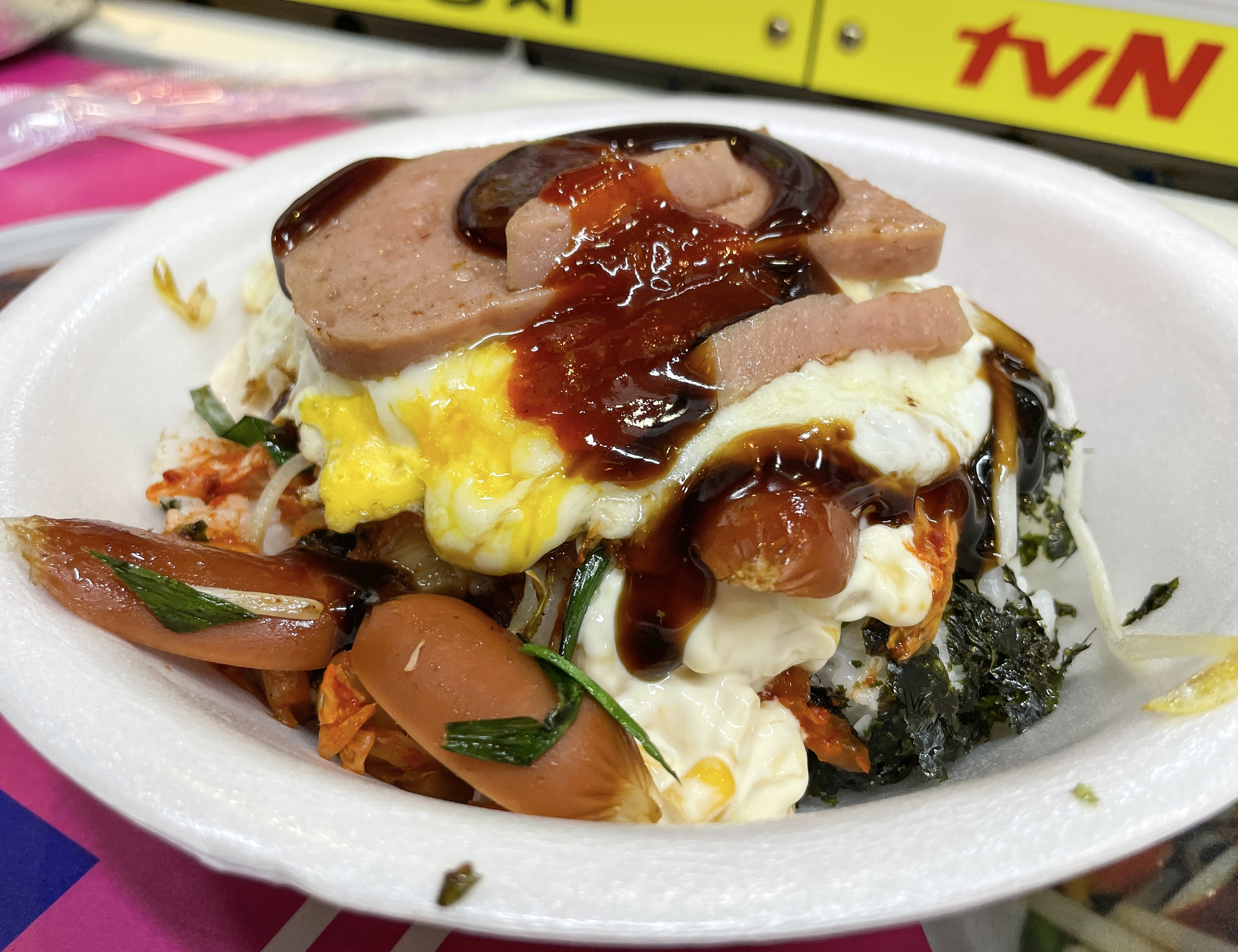 왕왕 이모네 컵밥에 들어가는 기본적인 재료는 미리 만들어져 있지만, 달걀프라이나 스팸 같은 경우에는 자리에서 직접 불판에서 익혀주시더라고요. 컵밥 1개에 3,500원인데 김치볶음도 들어가고, 치즈와 스팸, 삼겹살, 계란, 비엔나소시지, 숙주, 콘까지 들어가니 꽤 배불리 먹을 수 있겠더라고요.