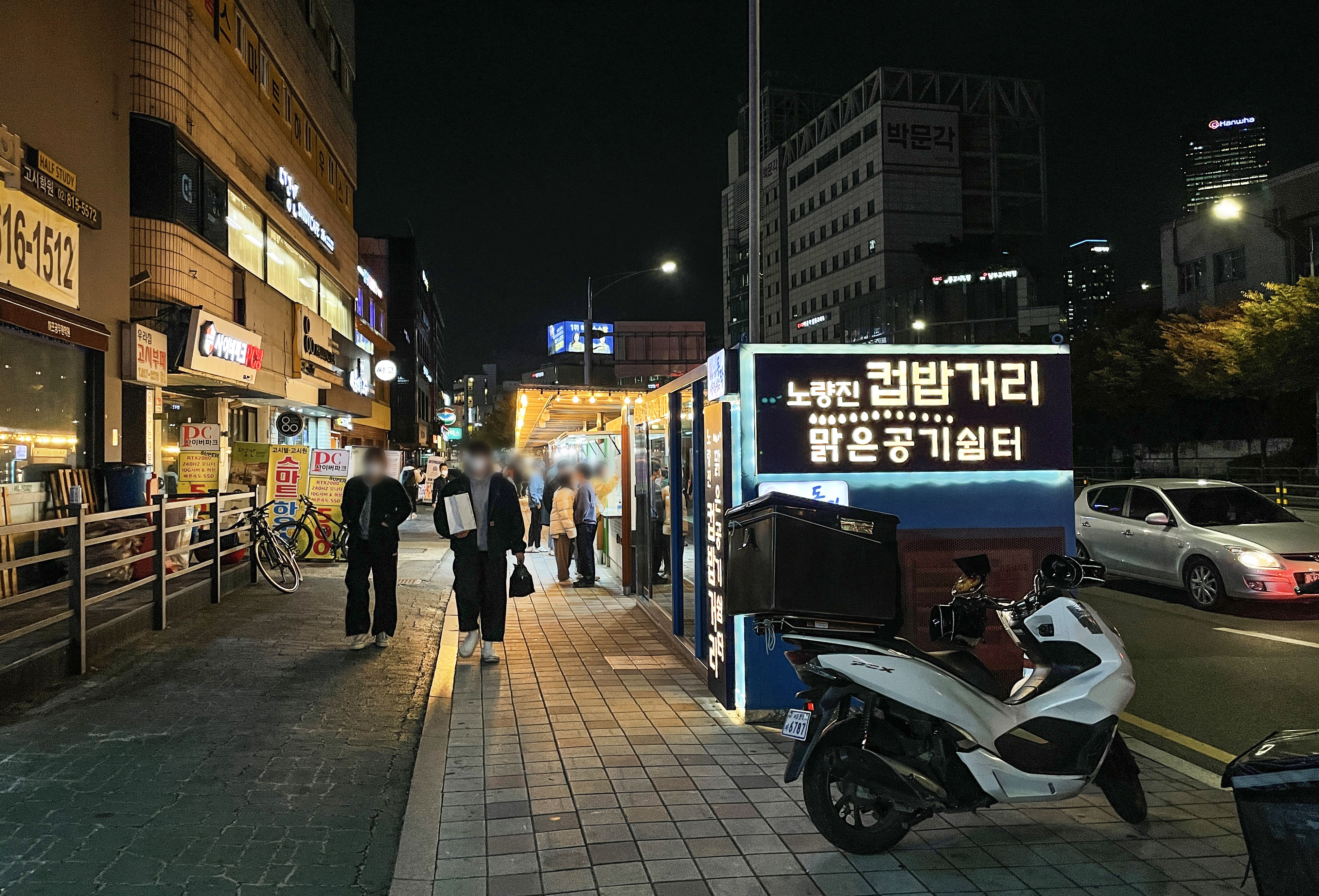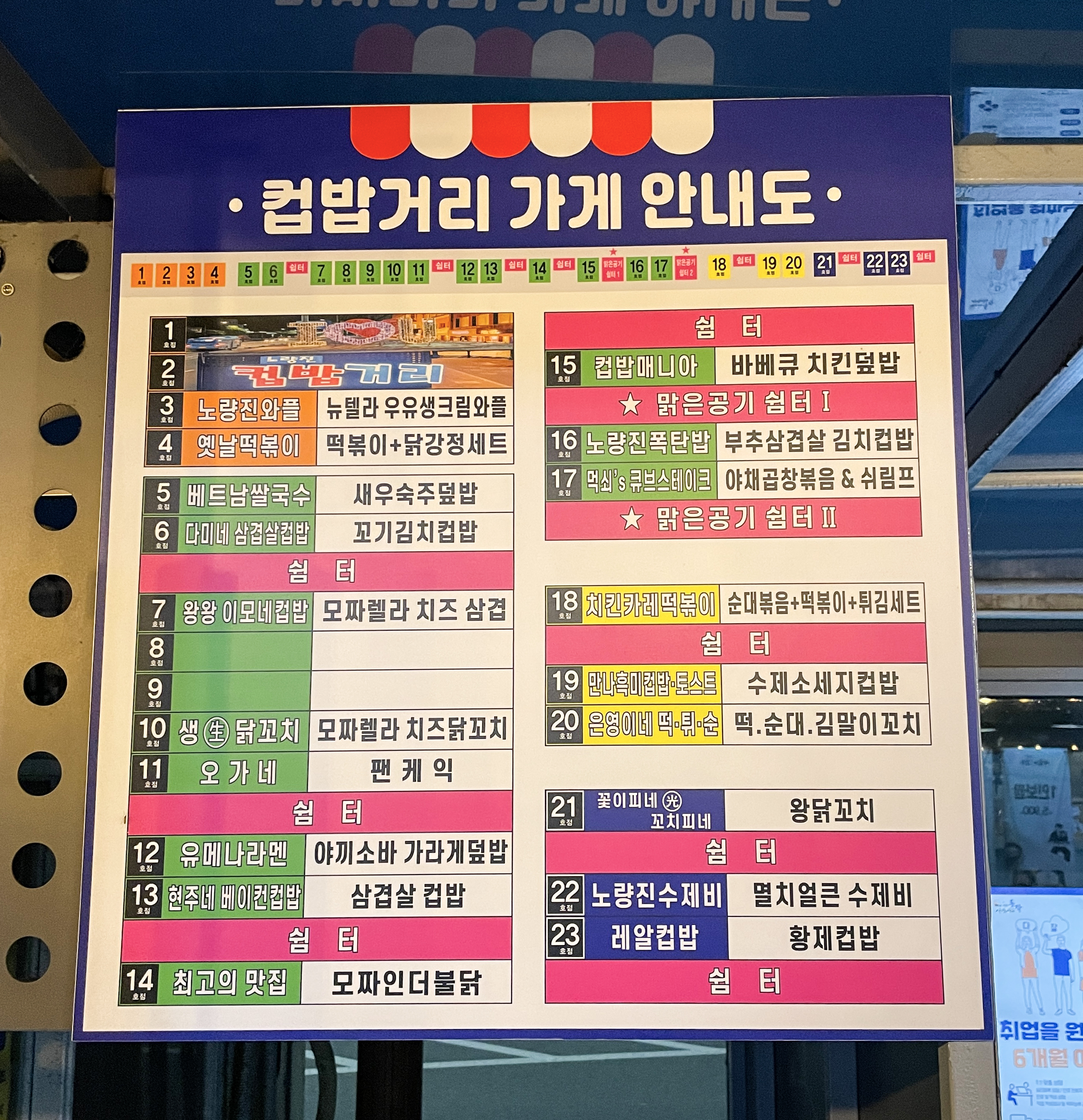 노량진 컵밥 거리에 가면 컵밥 전문점 <왕왕 이모네컵밥> 을 포함한 23개 점포가 있는데, 컵밥도 있고 닭꼬치, 라멘, 떡볶이, 곱창볶음, 수제비, 쌀국수 등이 있었습니다.