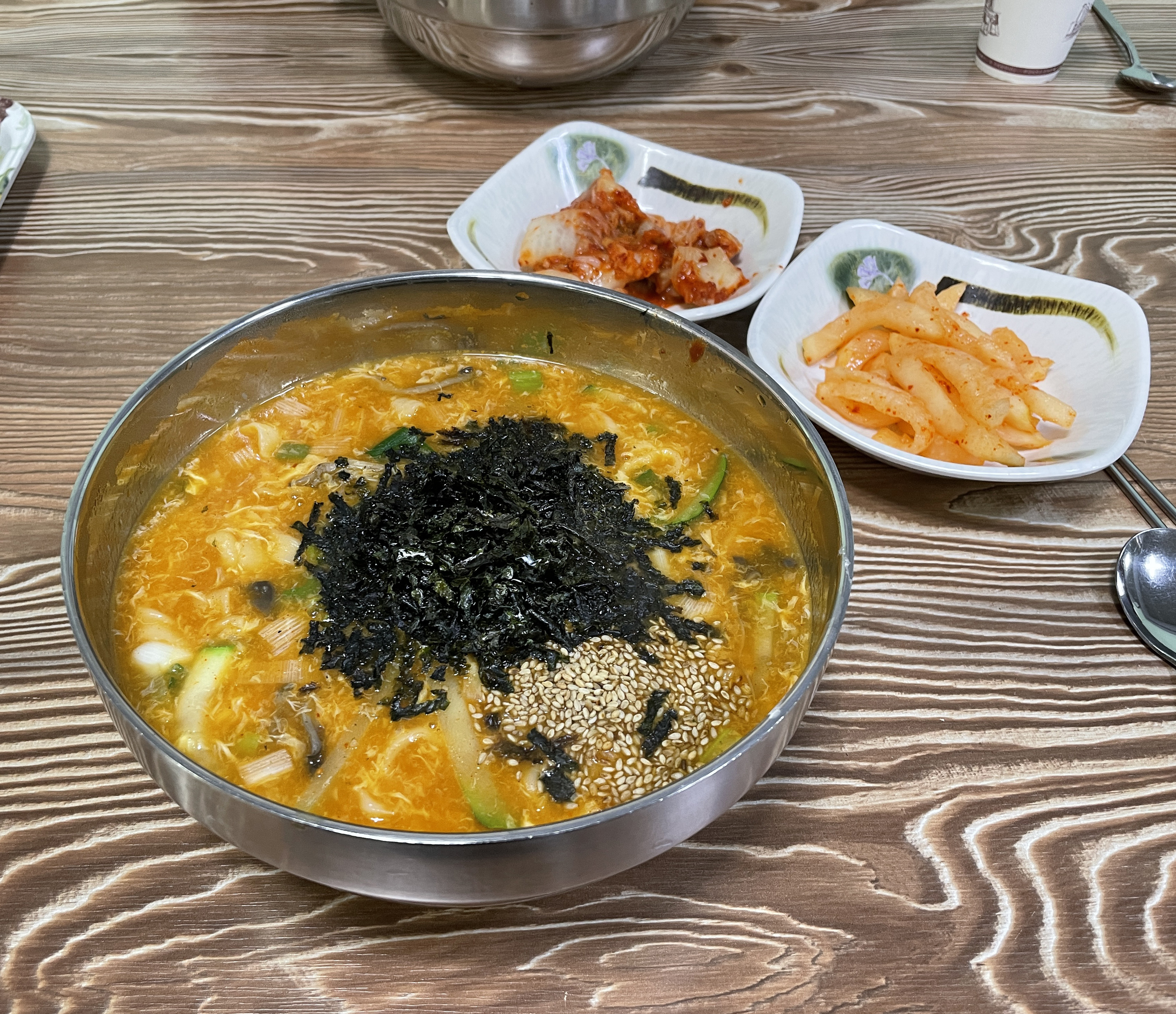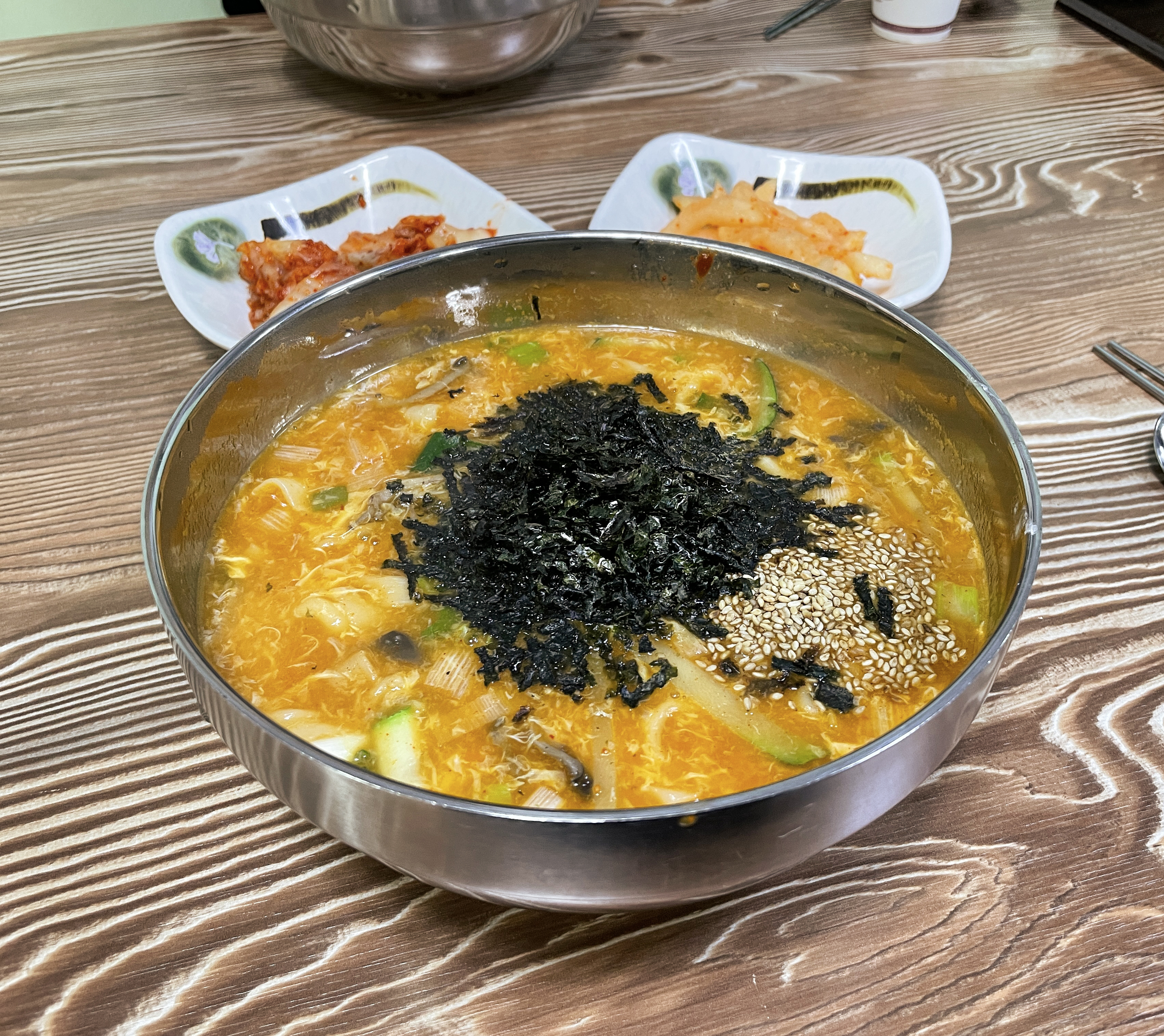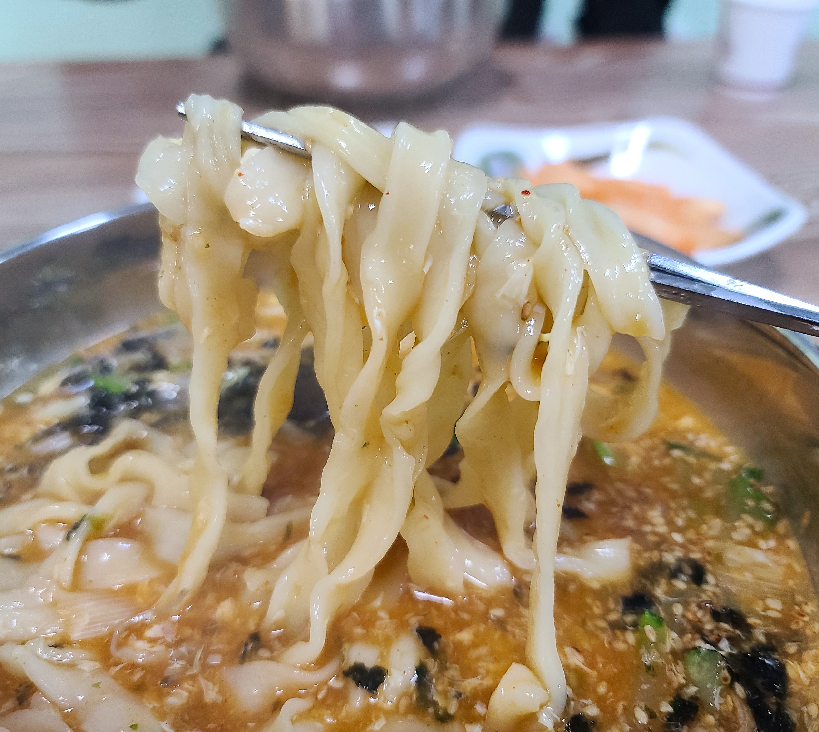 곧이어 반찬과 장칼국수가 나왔습니다. 반찬은 배추김치와 무생채가 나왔습니다. 칼국수집이지만 배추김치는 중국산 김치를 쓰는지 맛있지 않더라고요. 그나마 무생채는 먹을만했습니다. 장칼국수는 먹음직스러운 구수한(?) 냄새가 났고 색깔은 얼큰해 보였습니다.