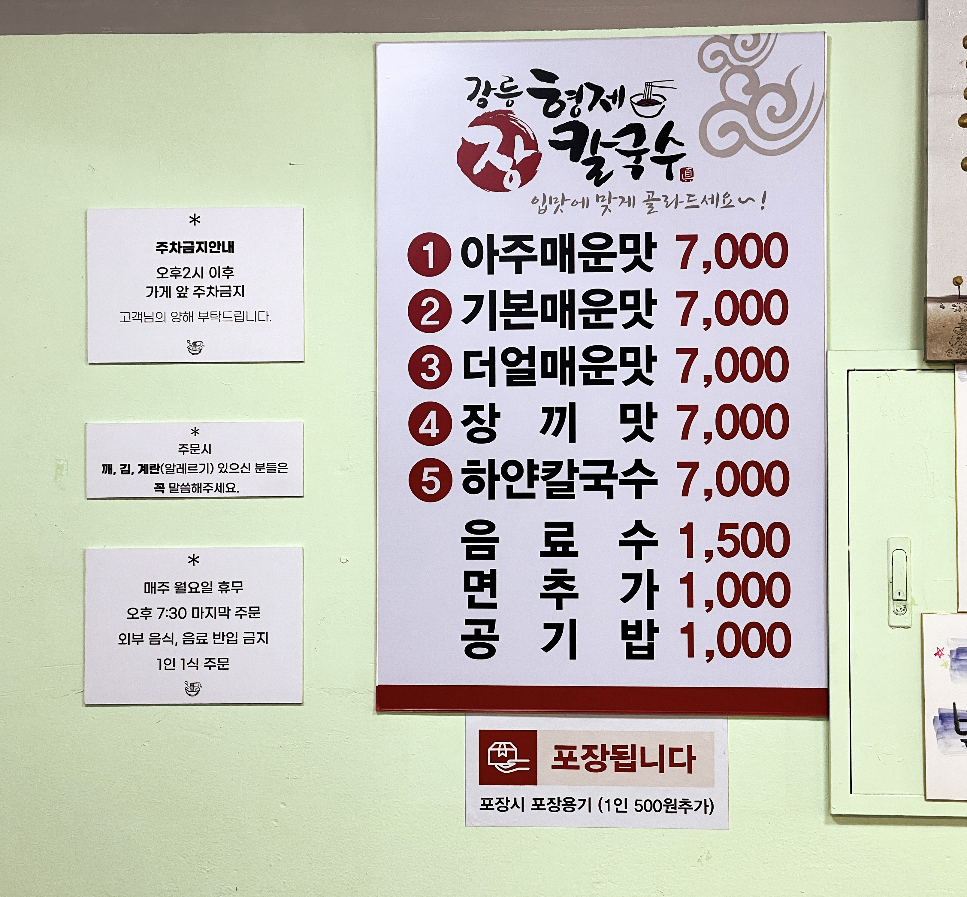 신림동 강릉형제장칼국수 메뉴는 아주매운맛, 기본매운맛, 더얼매운맛, 장끼맛(안매운맛), 하얀칼국수 등이 있었습니다. 가게에서 식사하는 손님도 많았지만 식사하는 도중에 포장하는 손님들도 많이 있더라고요. (저는 장칼국수 덜 매운맛과 같이 간 지인은 기본 매운맛으로 주문했습니다.)