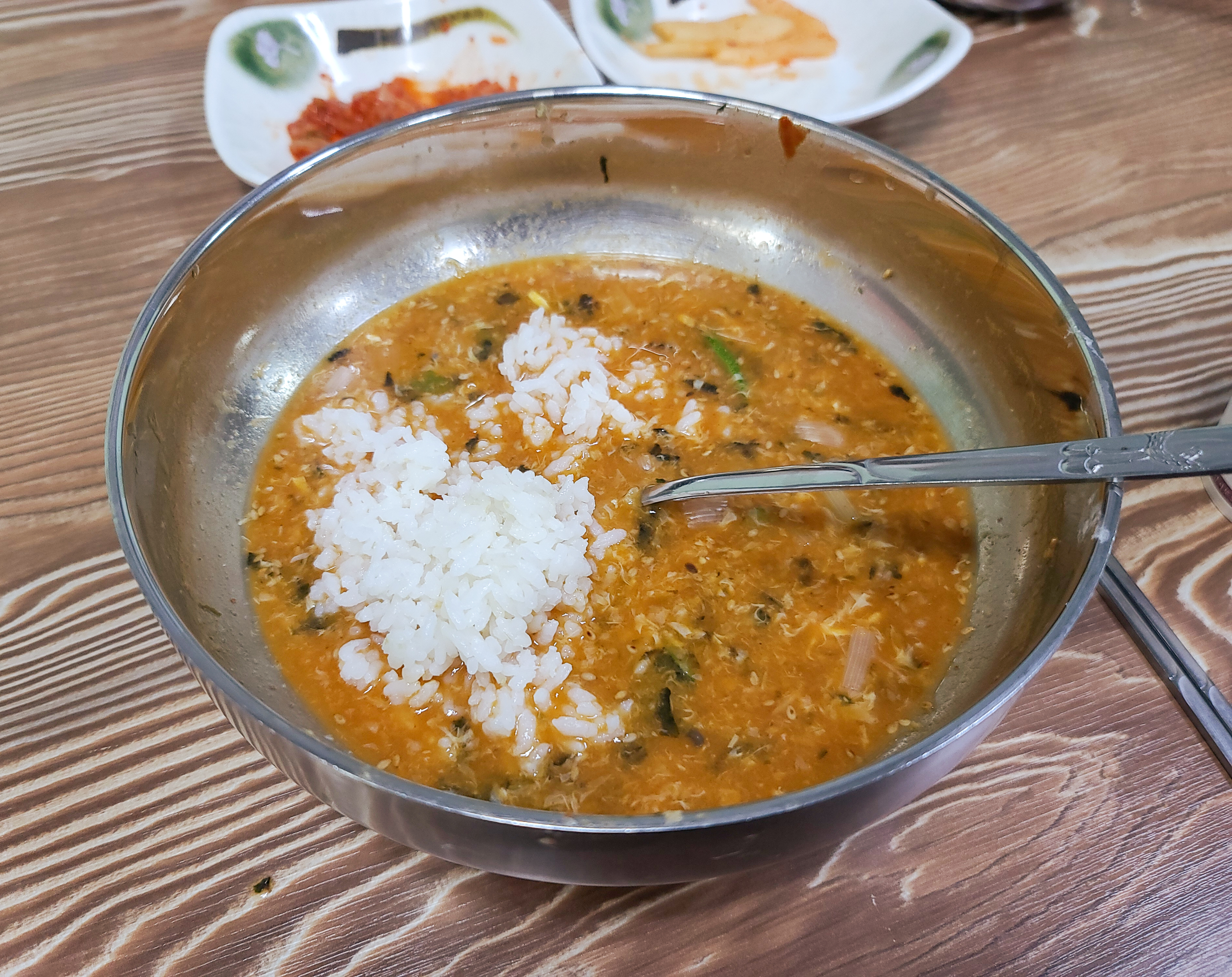칼국수를 먹다가 국물이 맛있어서 밥도 주문해서 지인과 반씩 나눠서 밥을 말아서 먹었습니다. 남은 칼국수 국물에 밥을 말아서 먹으니 든든하고 배부르게 식사할 수 있었습니다.