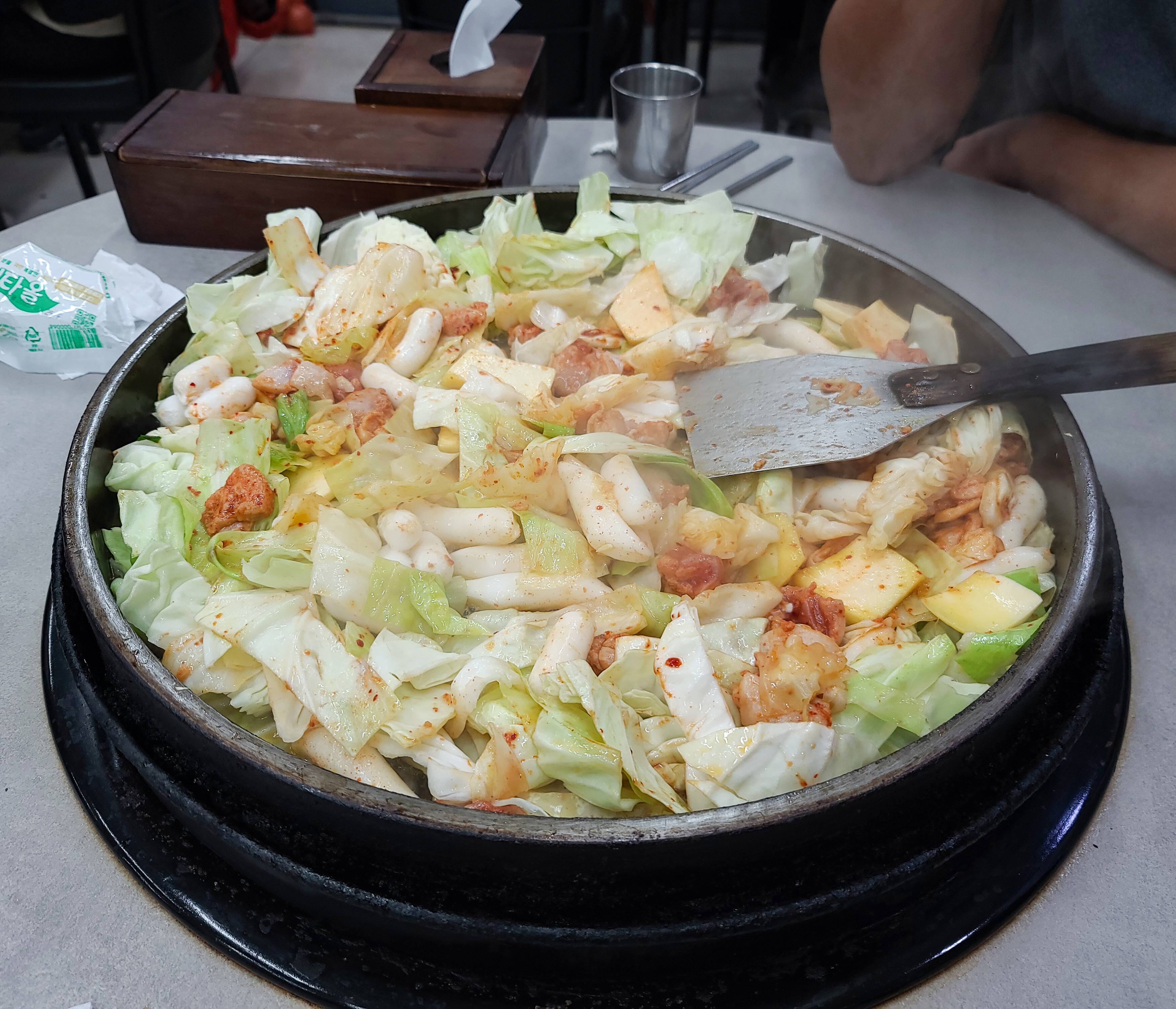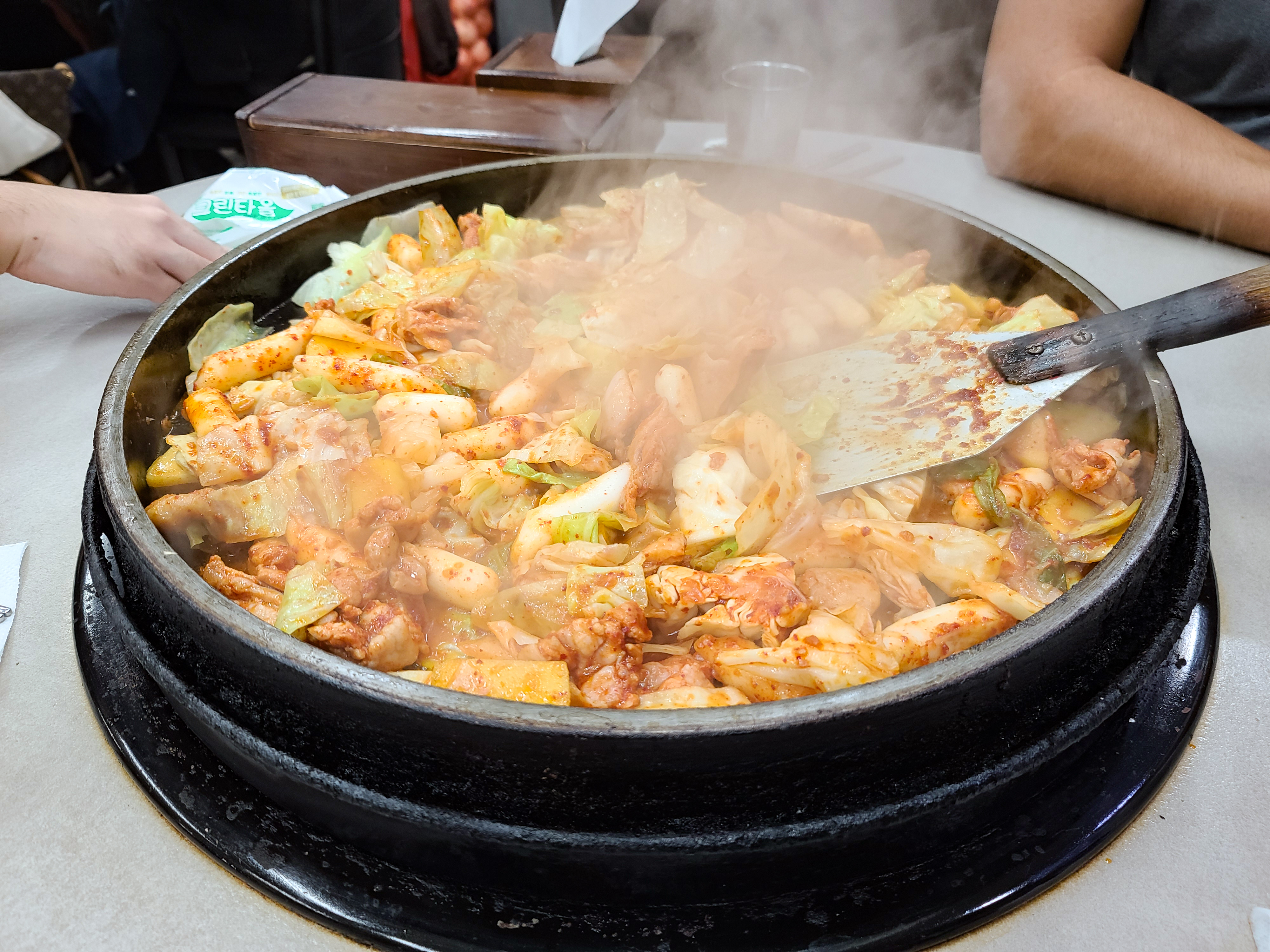 처음에는 채소 위주로 볶아줘서 닭갈비의 색이 우리가 흔히 알던 것과 달라서 이상하게 느낄 수 있지만, 나중에 추가로 양념장과 깻잎 등 채소를 볶아주어 원래 우리가 알던 색깔의 닭갈비를 볼 수 있었습니다. 닭갈비가 볶아지는 동안 기름이 튀길 수 있습니다. (가게에 앞치마가 없는 것 같더라고요.)