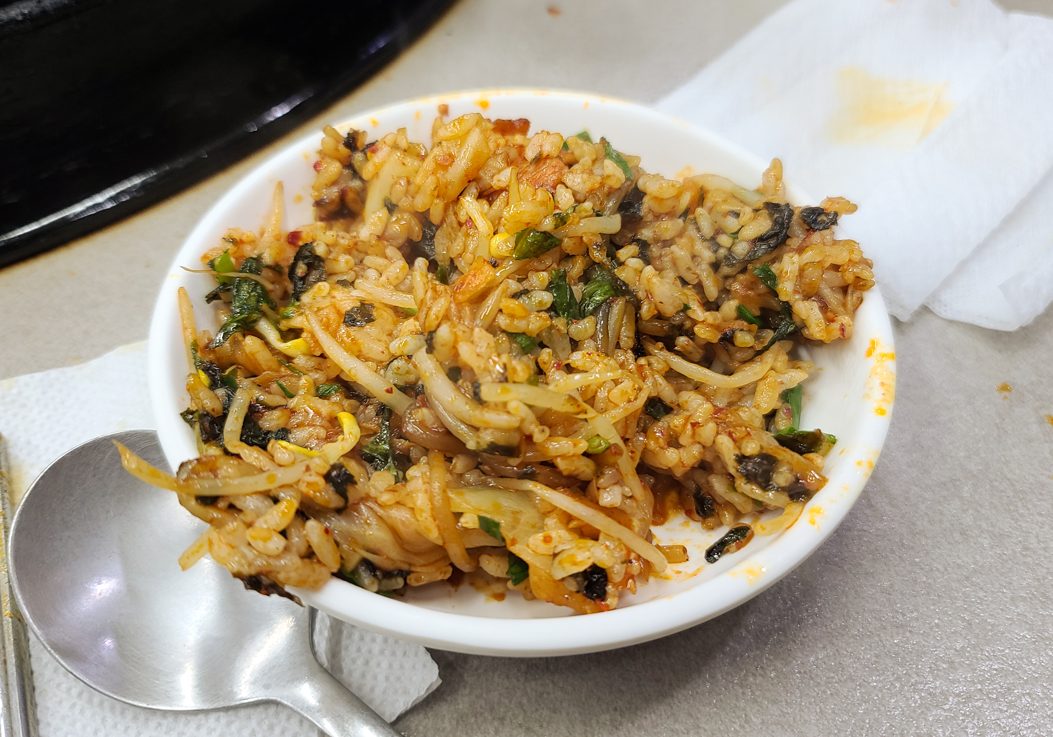 닭갈비와 쫄면 사리는 잘 어울렸고, 떡도 추가해서 그런지 먹기 좋았습니다. 닭갈비는 양파와 같이 곁들여 쌈을 싸 먹었는데 느끼하지 않고 담백했습니다. 비빔 막국수도 추천하시던데 배가 어느 정도 찬 시점이라 비빔막국수 대신 볶음밥을 시켜서 나눠먹기로 했습니다.