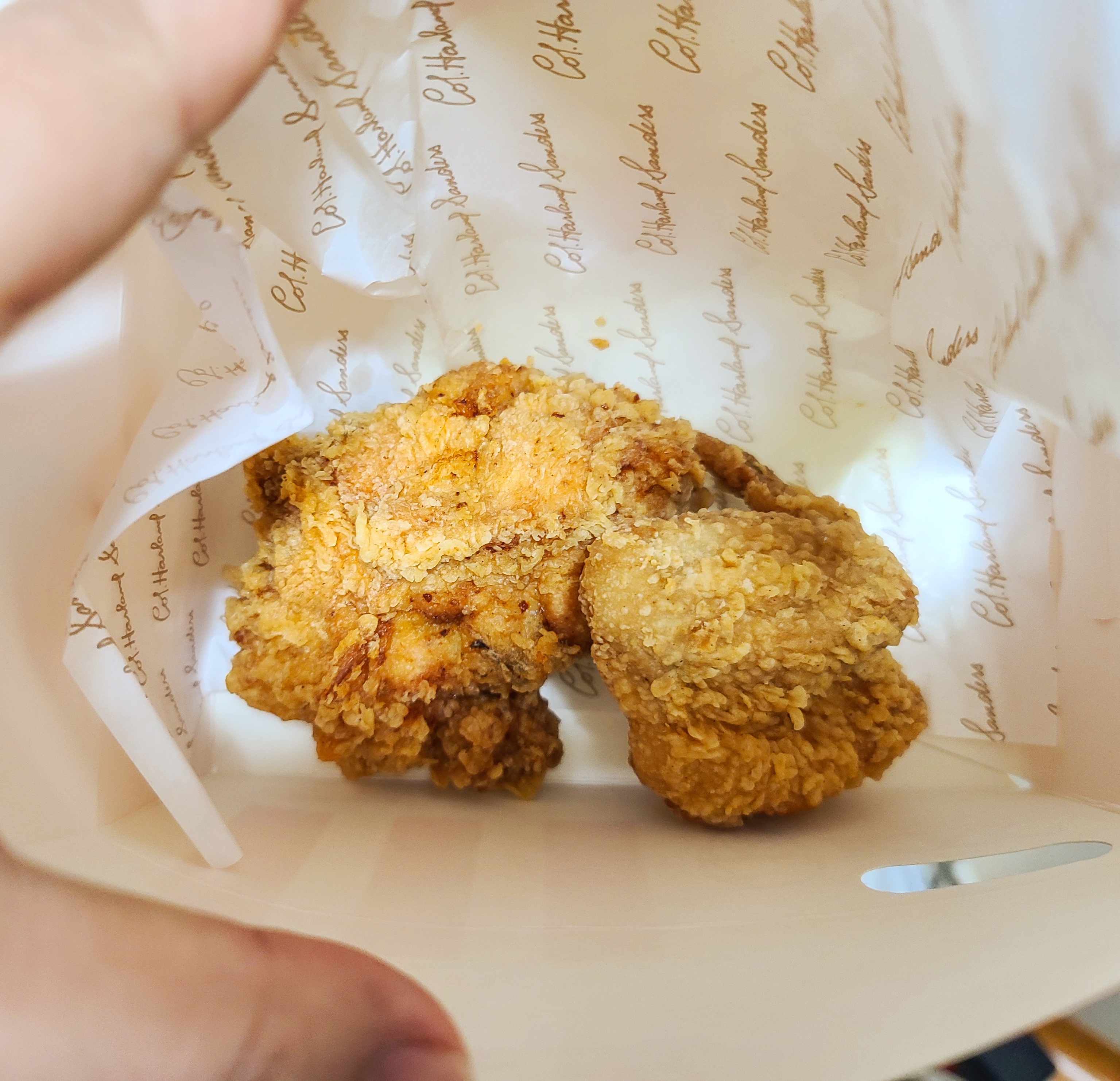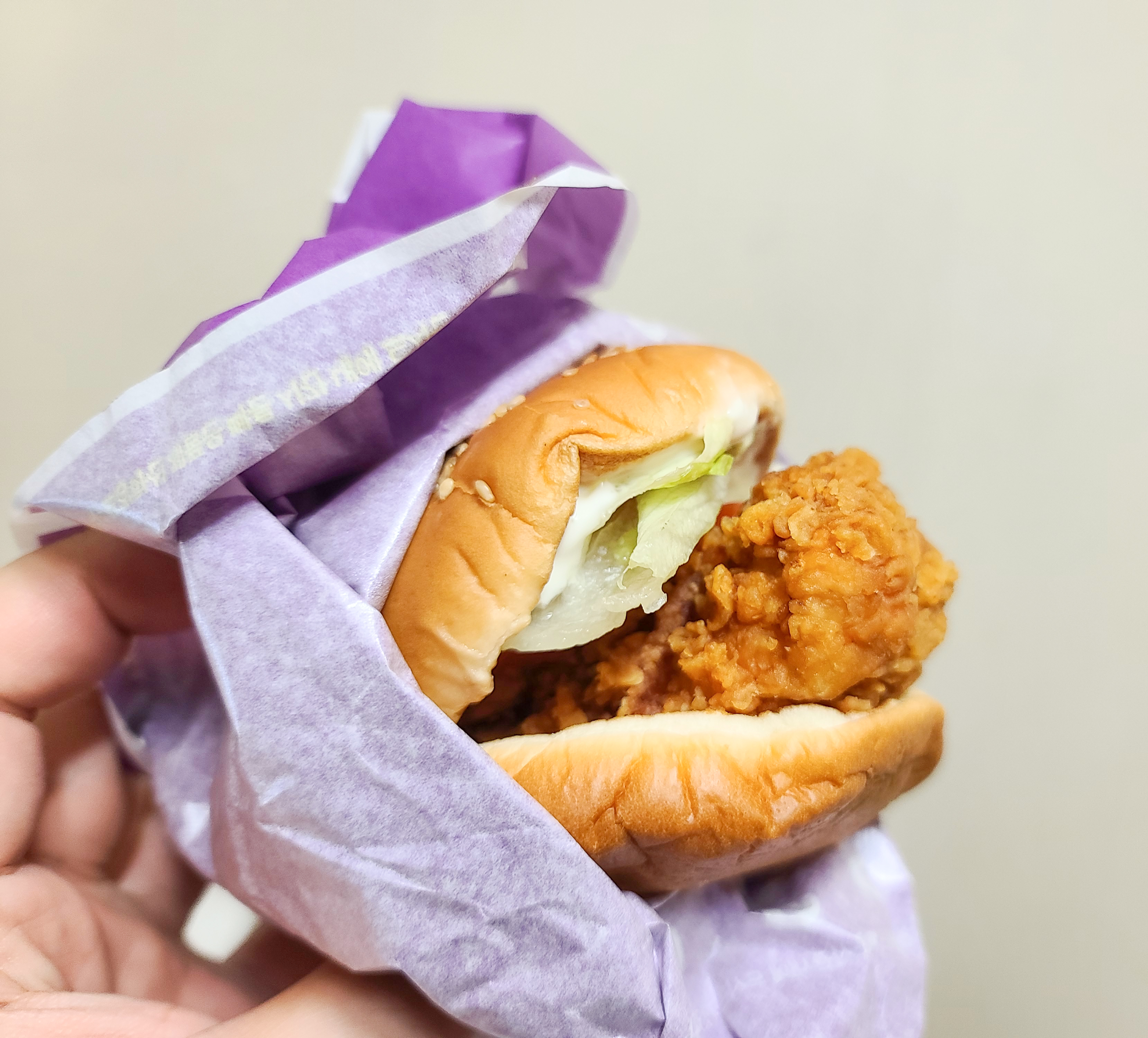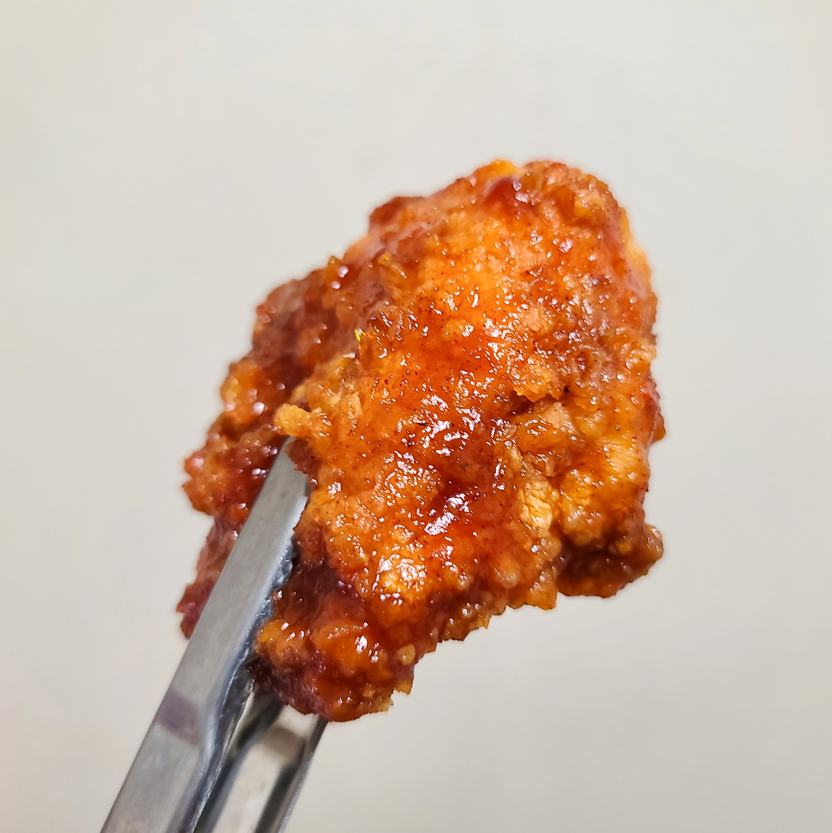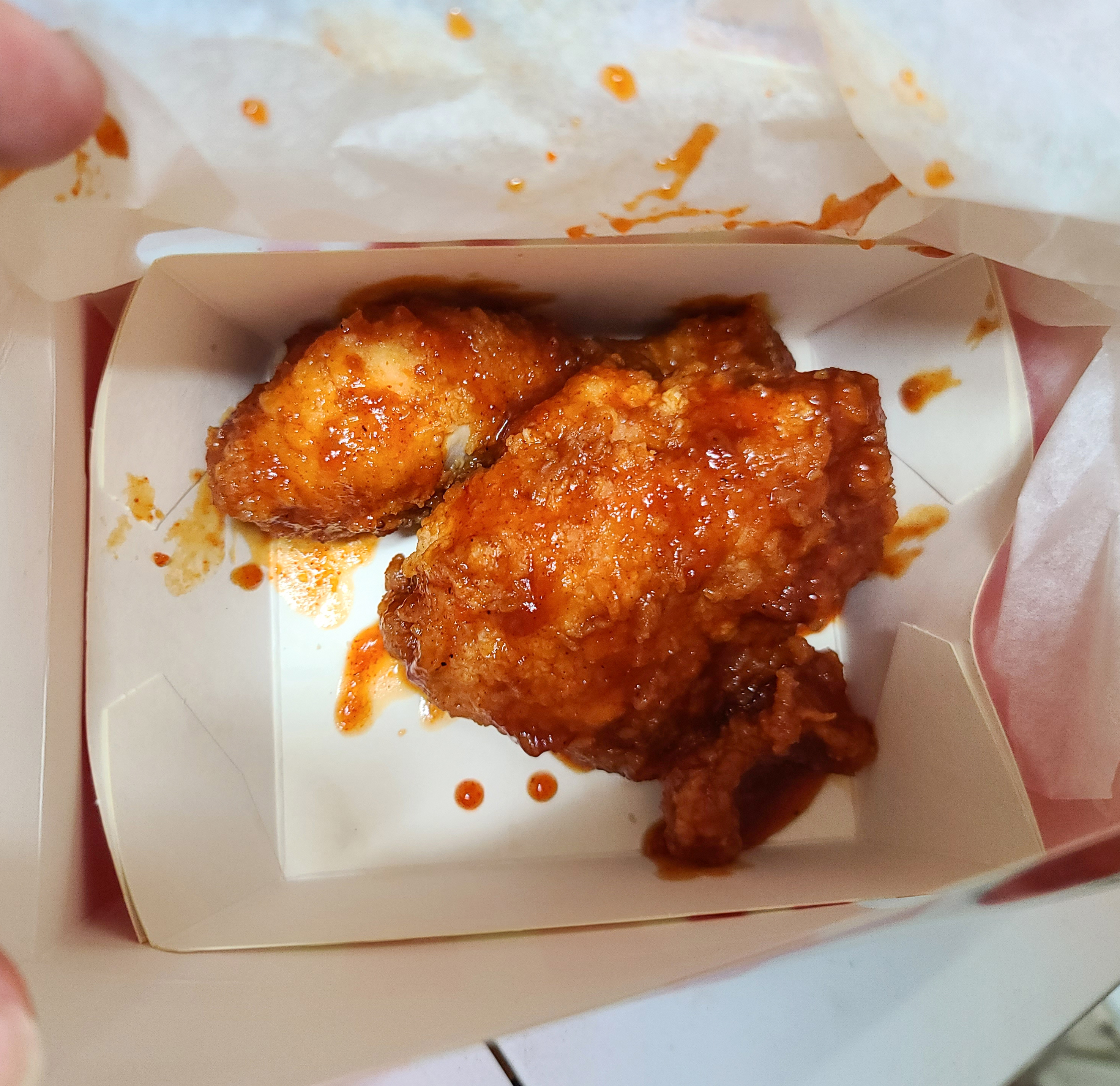햄버거와 함께 온 갓양념치킨 2조각과 핫크리스피치킨 2조각의 모습입니다. 핫크리스피는 자주 먹는 메뉴이다 보니 갓양념치킨을 따로 들고 찍어보았습니다. 우리가 흔히 알고 있는 양념치킨 맛인데 약간 더 진한(?) 짠맛이 강한 양념치킨이었습니다.