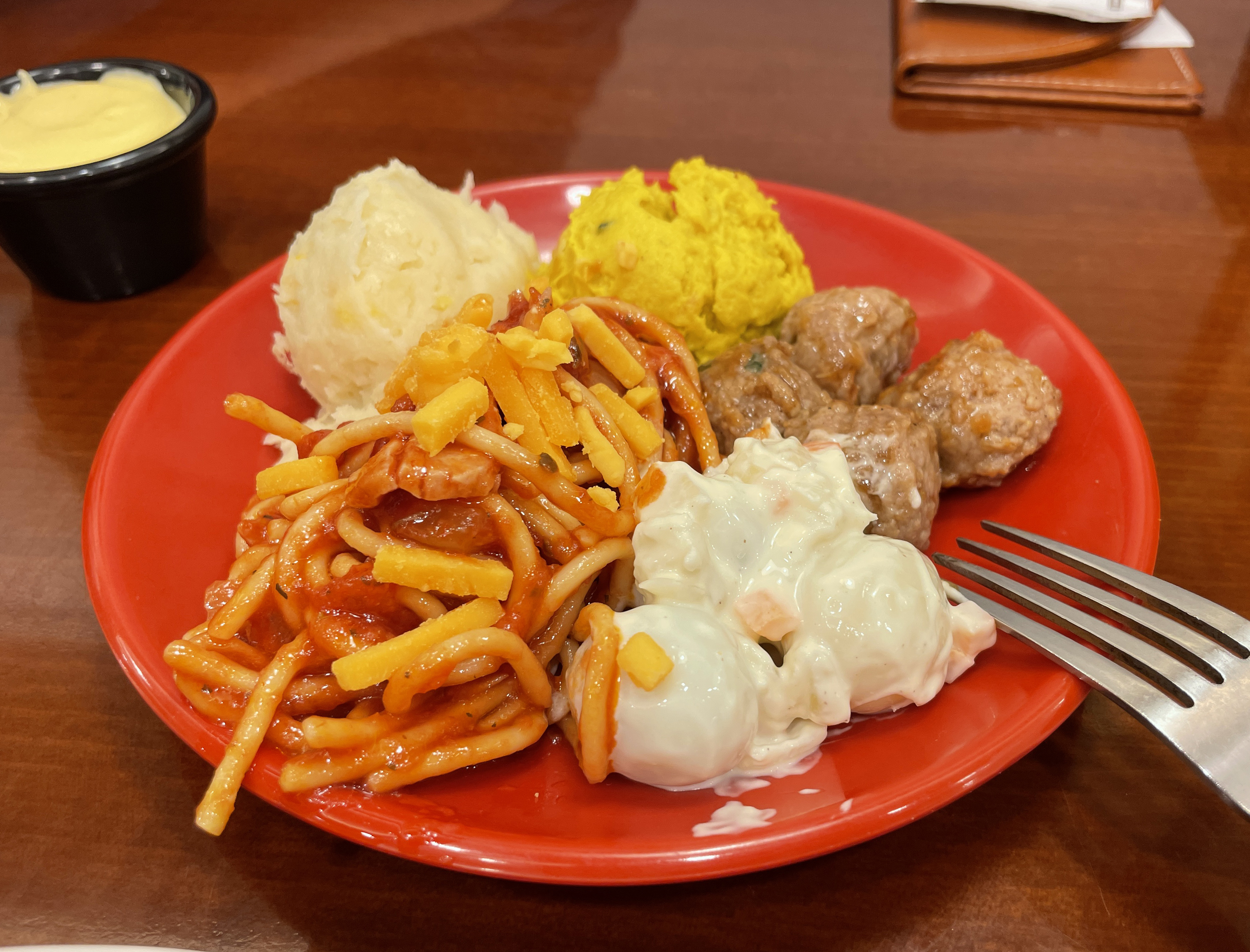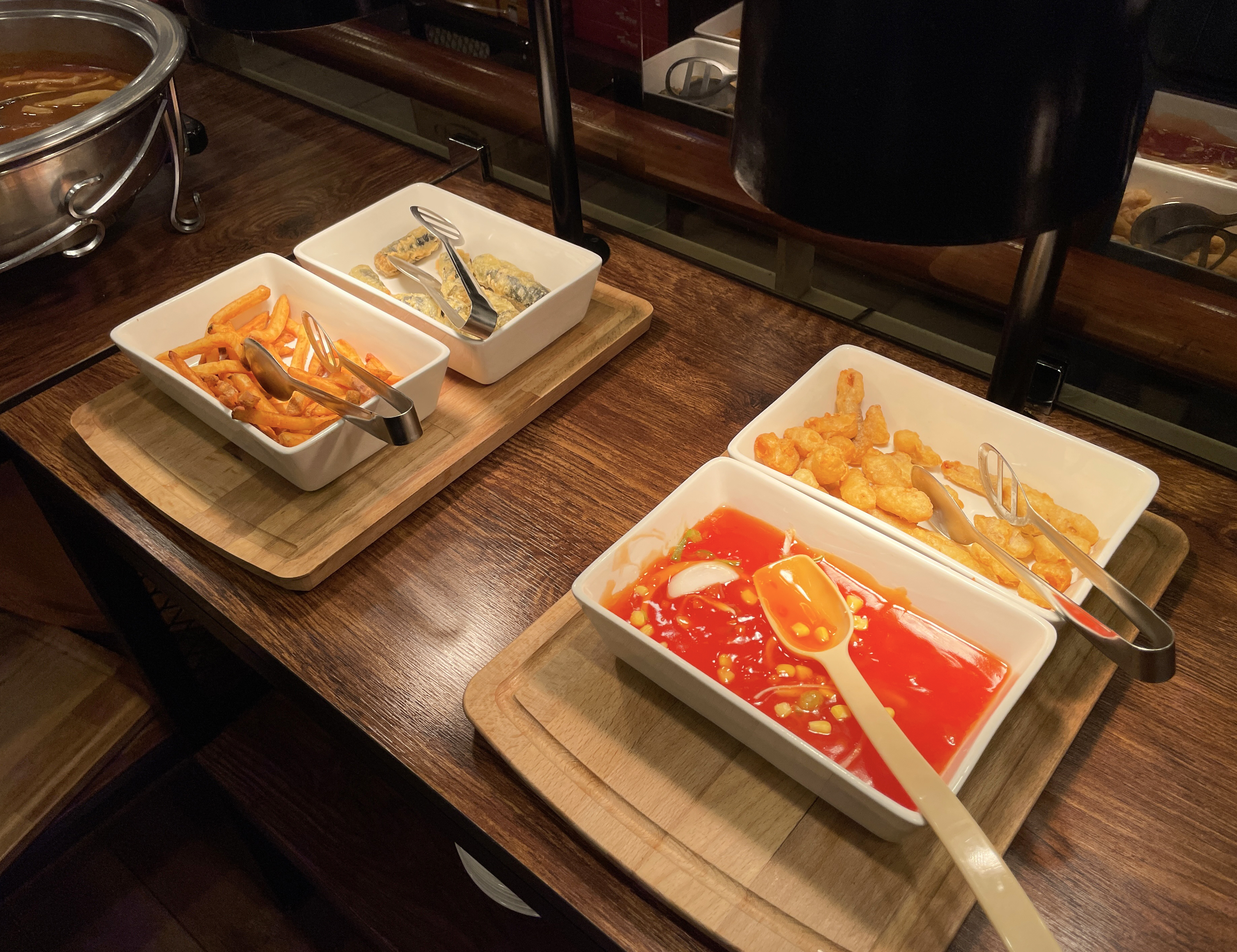 뷔페는 가짓수가 엄청 다양하거나 하지는 않았지만, 나름대로 피자 몇 가지와 샐러드, 과일, 튀김 그리고 떡볶이 까지 가격에 맞는 서비스를 하고 있었습니다. 샐러드바의 재료들은 피자 위에 올라가는 토핑이나, 시판용 샐러드가 있었고, 통조림 과일이나 푸딩도 있었습니다.
