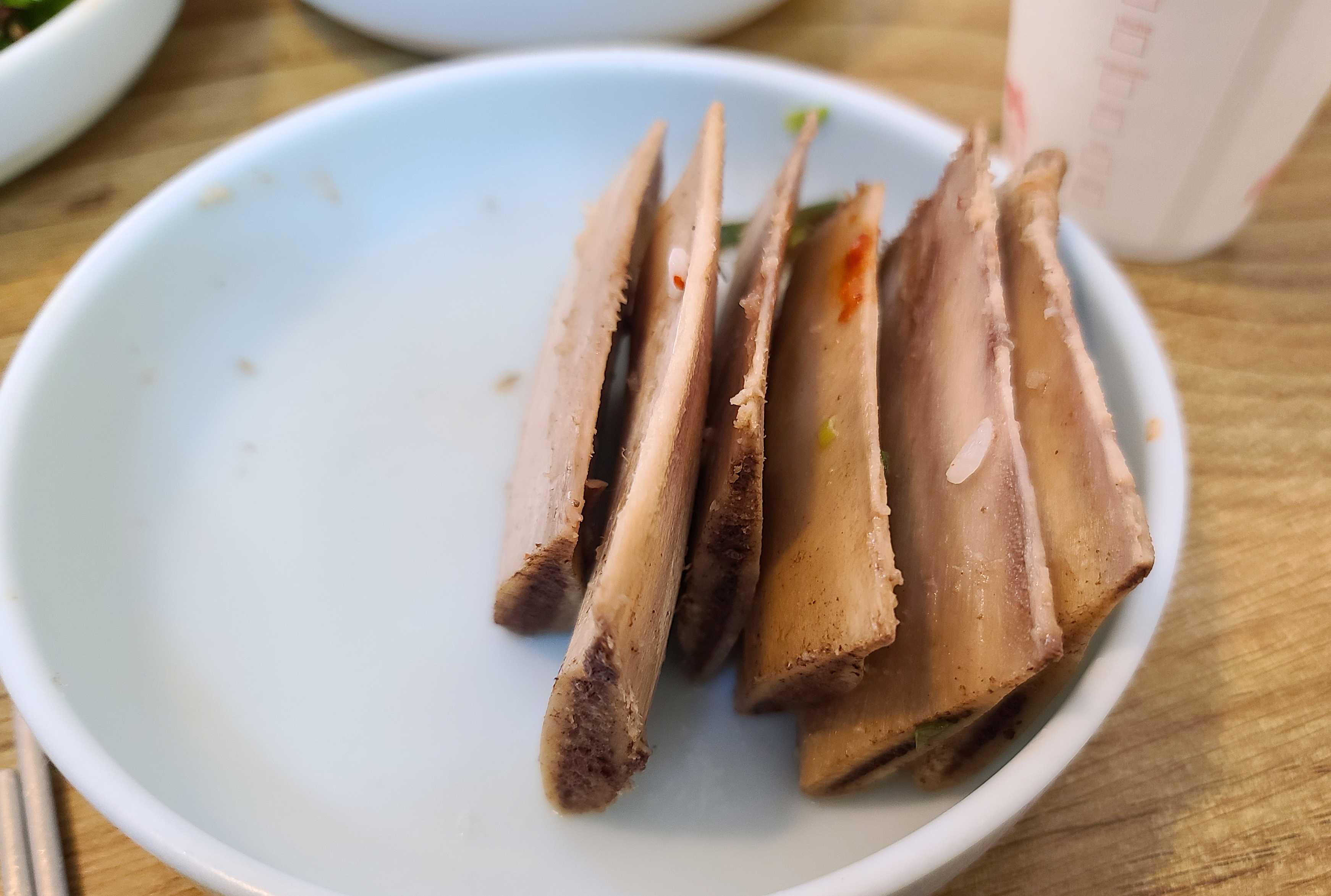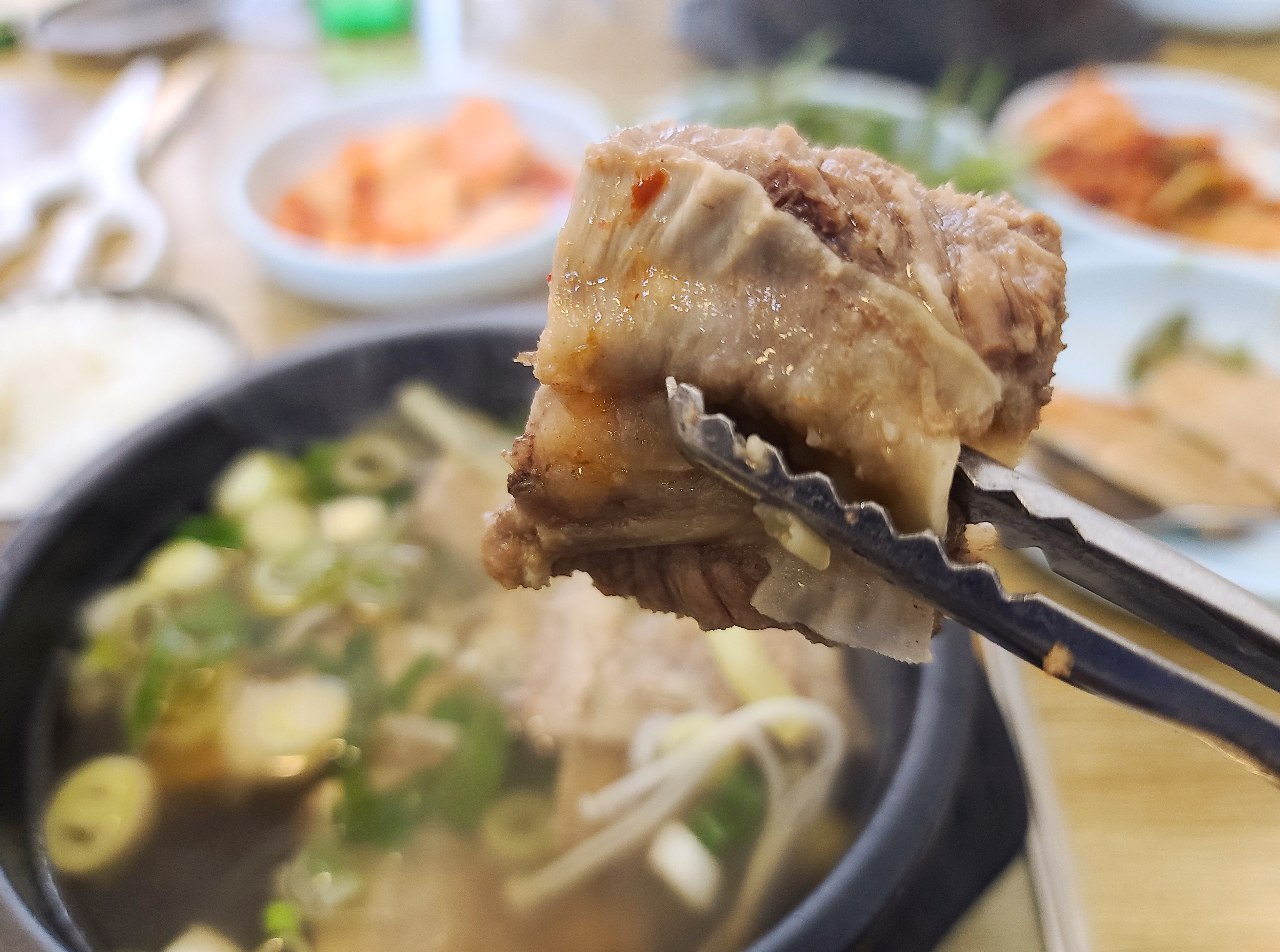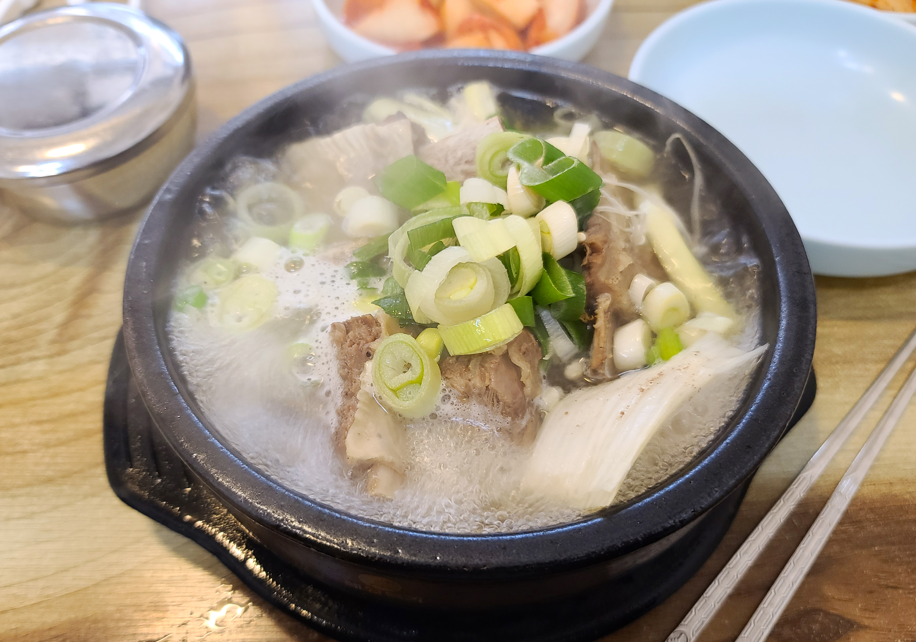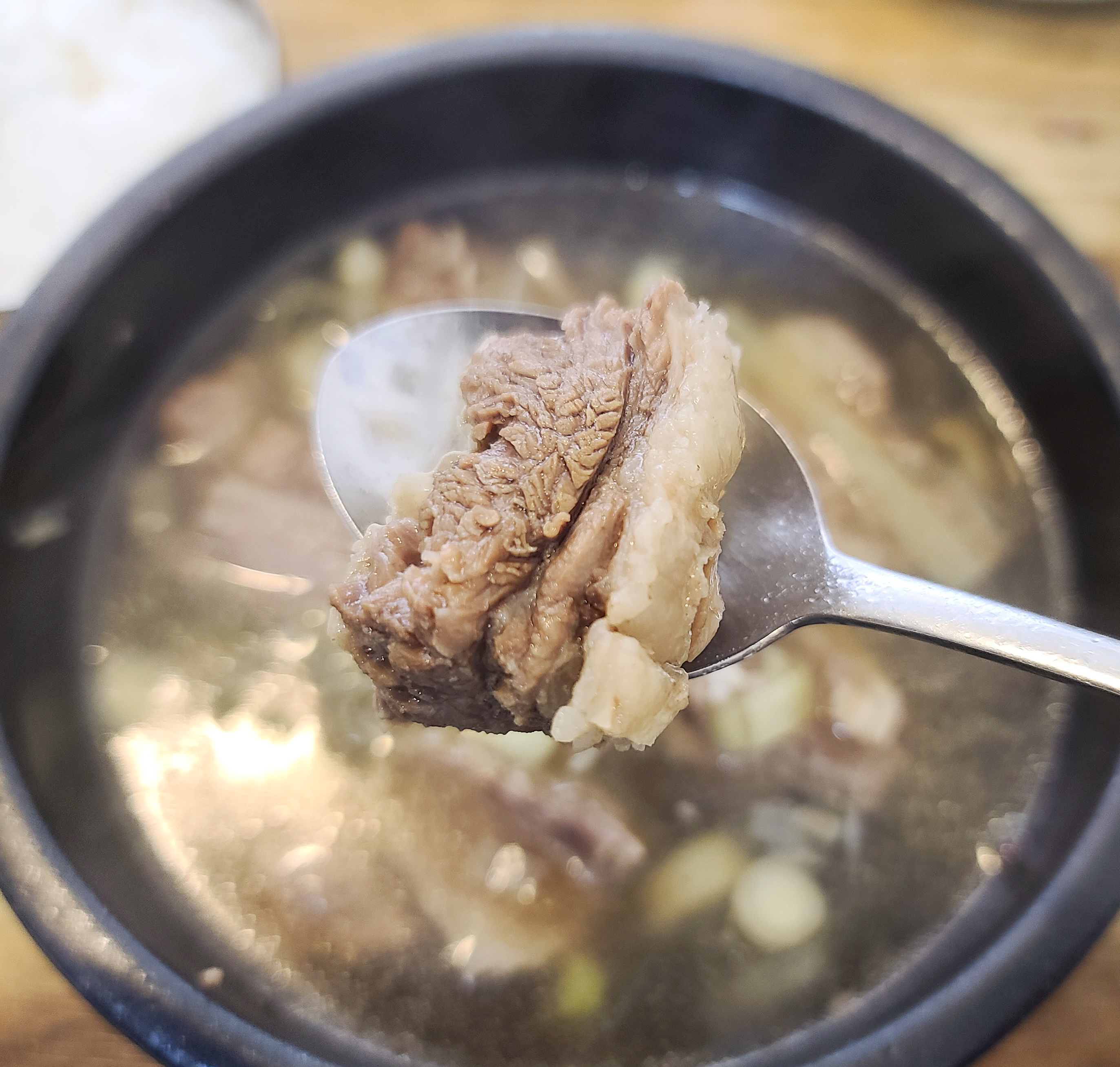 기대했던 갈비탕은 깔끔한 맛이었습니다. 여러 재료가 들어가지 않고 순수하게 갈비와 파, 팽이버섯만 들어간 갈비탕이었습니다. 그래도 갈비가 여러 개 들어있어 갈비 뜯는 맛이 있었고, 고기는 적당히 탄력이 있었습니다. 가위로 뼈와 고기 사이를 잘라주니 먹기 편했고, 소고기 특유의 육향과 함께 고소한 맛이 있어서 먹기에 좋았습니다.