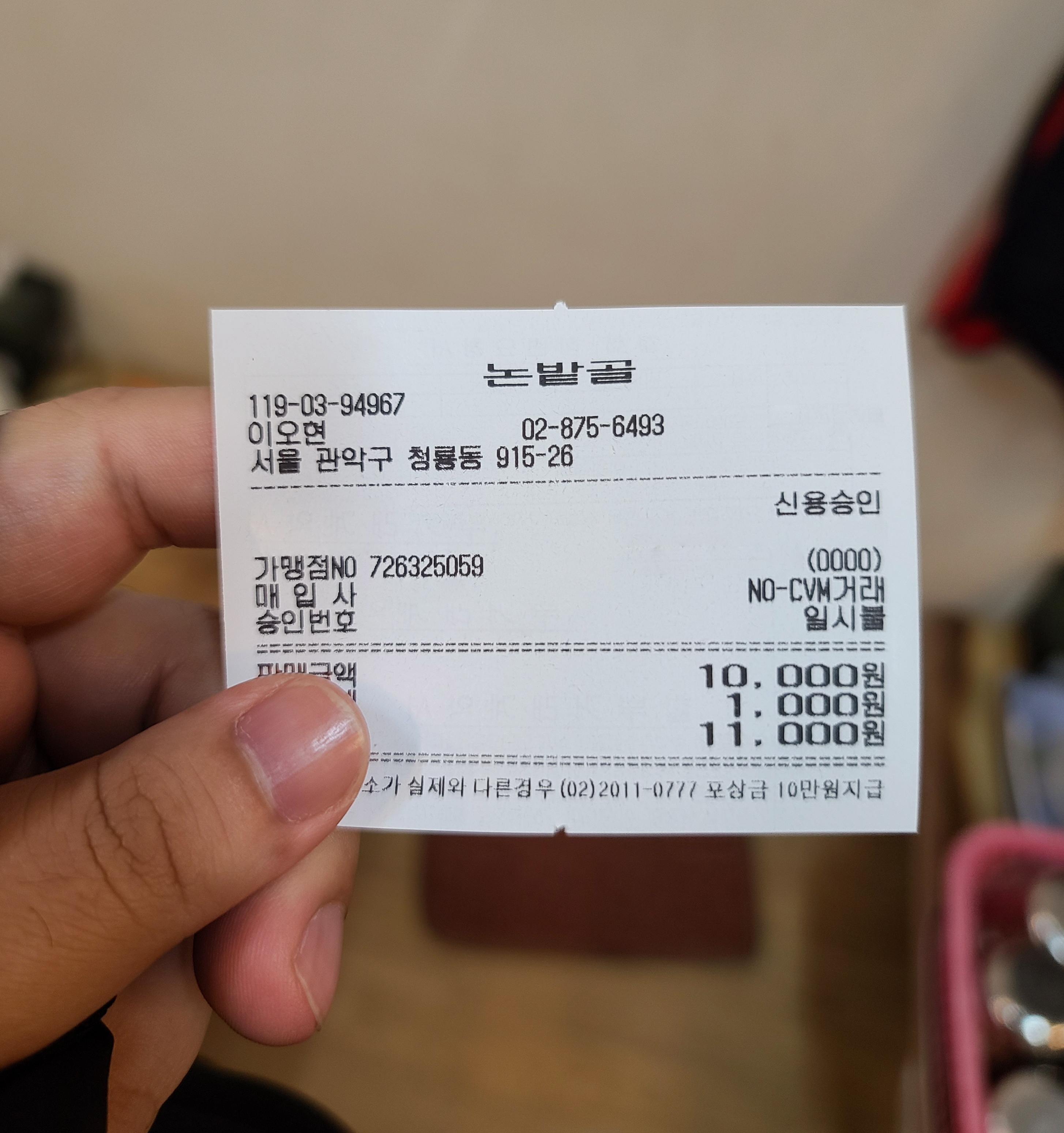 갈비탕 1그릇 가격이 11,000원 이니까, 점심식사 비용으로는 조금 부담스럽기도 하고요. 논밭골의 갈비탕 가격은 타 갈비탕 전문점과 비슷한 정도였고, 갈비만 좀 더 푸짐하게 주는 것 같습니다. 그밖에 갈비탕집에서 흔히 보는 대추나 은행을 넣어주는 것도 아니고 그저 갈비 양이 푸짐할 뿐이라 크게 매력은 못 느끼겠더라고요. 관심이 있으신 분은 방문하셔도 좋겠지만, 굳이 찾아가서까지 먹을 필요는 없다고 생각합니다.(ㅋㅋ)