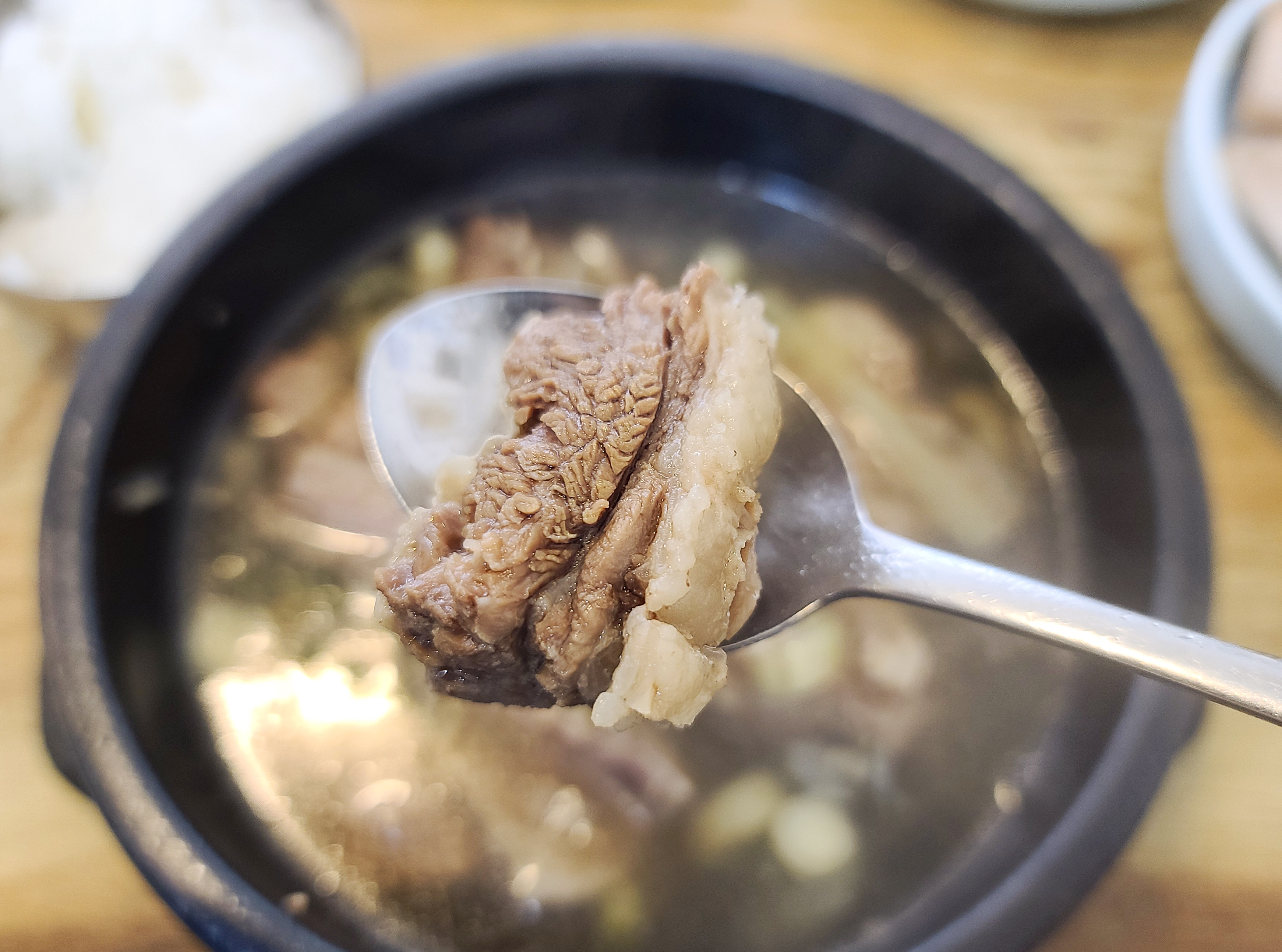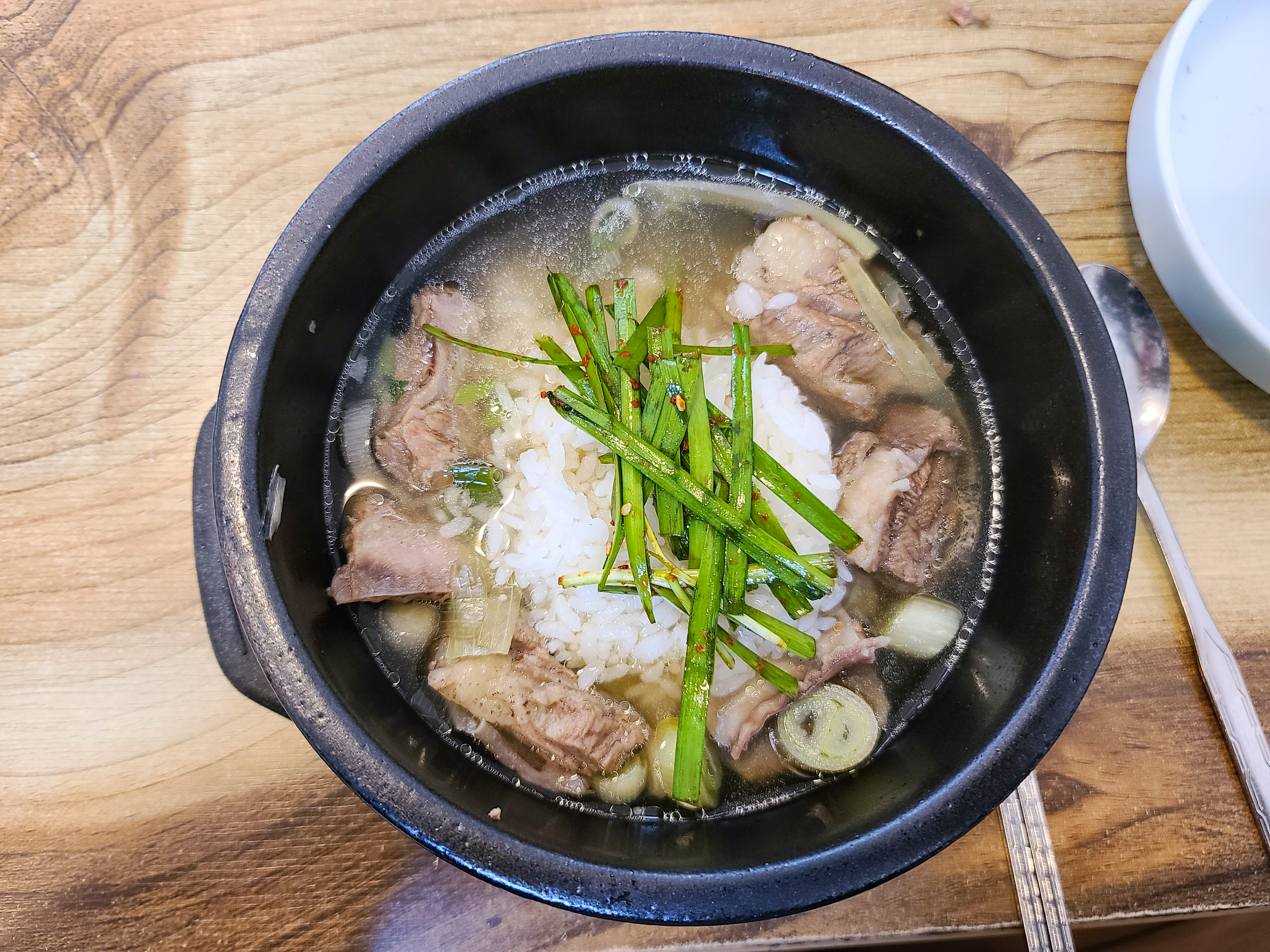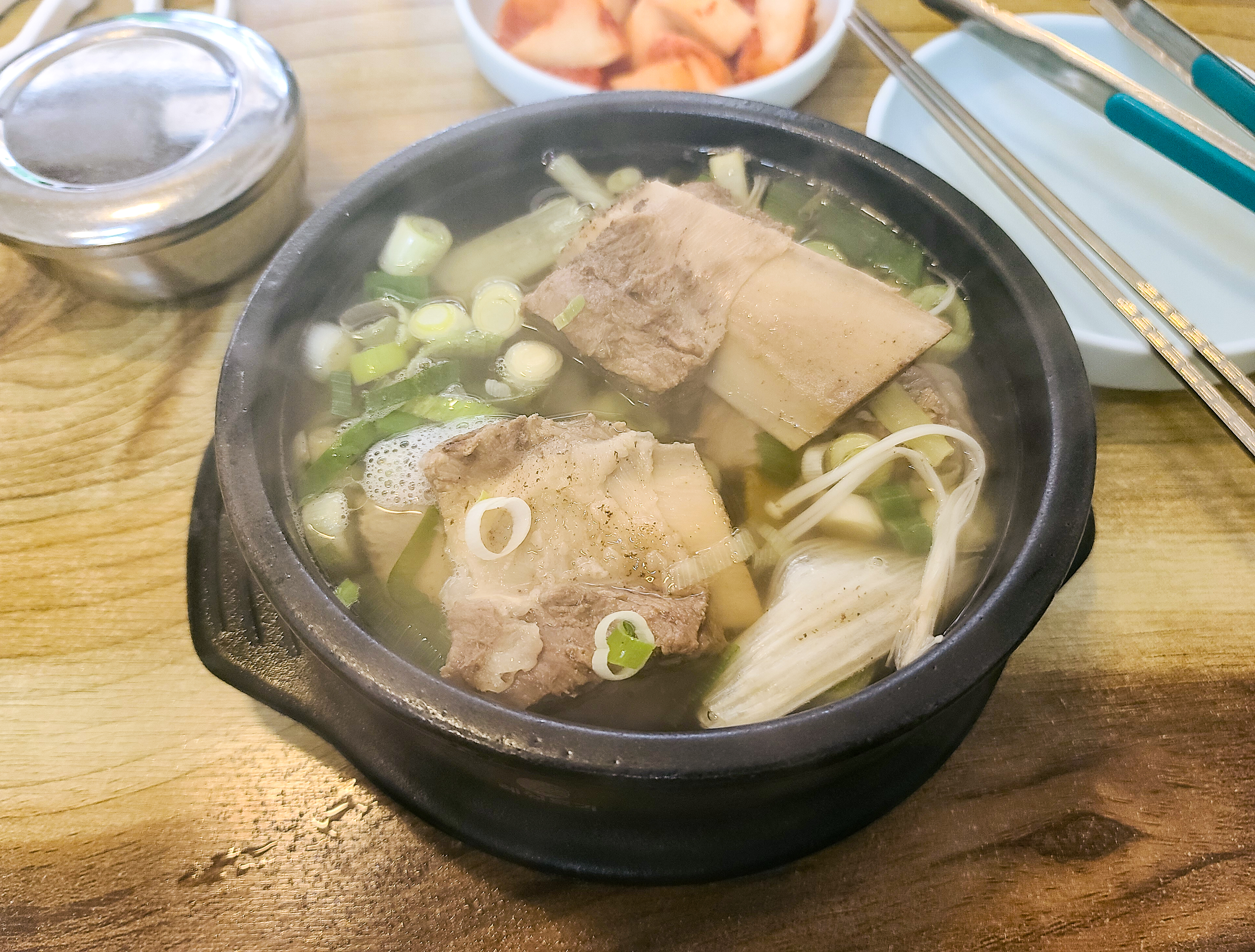 기대했던 갈비탕은 깔끔한 맛이었습니다. 여러 재료가 들어가지 않고 순수하게 갈비와 파, 팽이버섯만 들어간 갈비탕이었습니다. 그래도 갈비가 여러 개 들어있어 갈비 뜯는 맛이 있었고, 고기는 적당히 탄력이 있었습니다. 가위로 뼈와 고기 사이를 잘라주니 먹기 편했고, 소고기 특유의 육향과 함께 고소한 맛이 있어서 먹기에 좋았습니다.