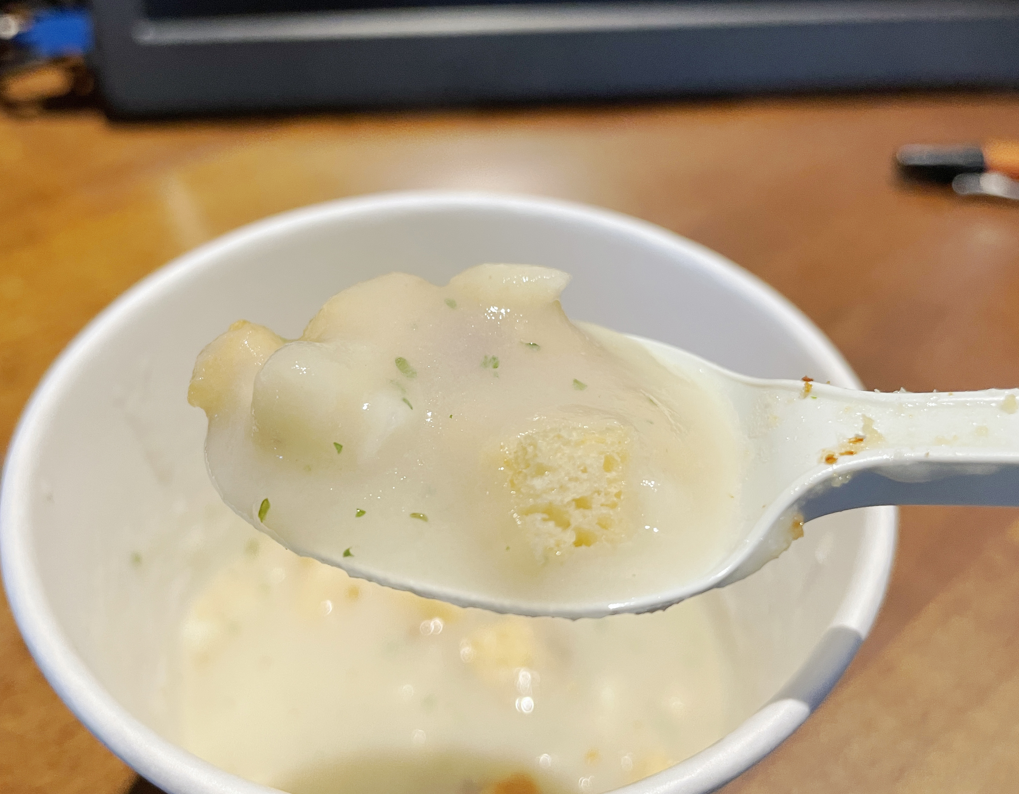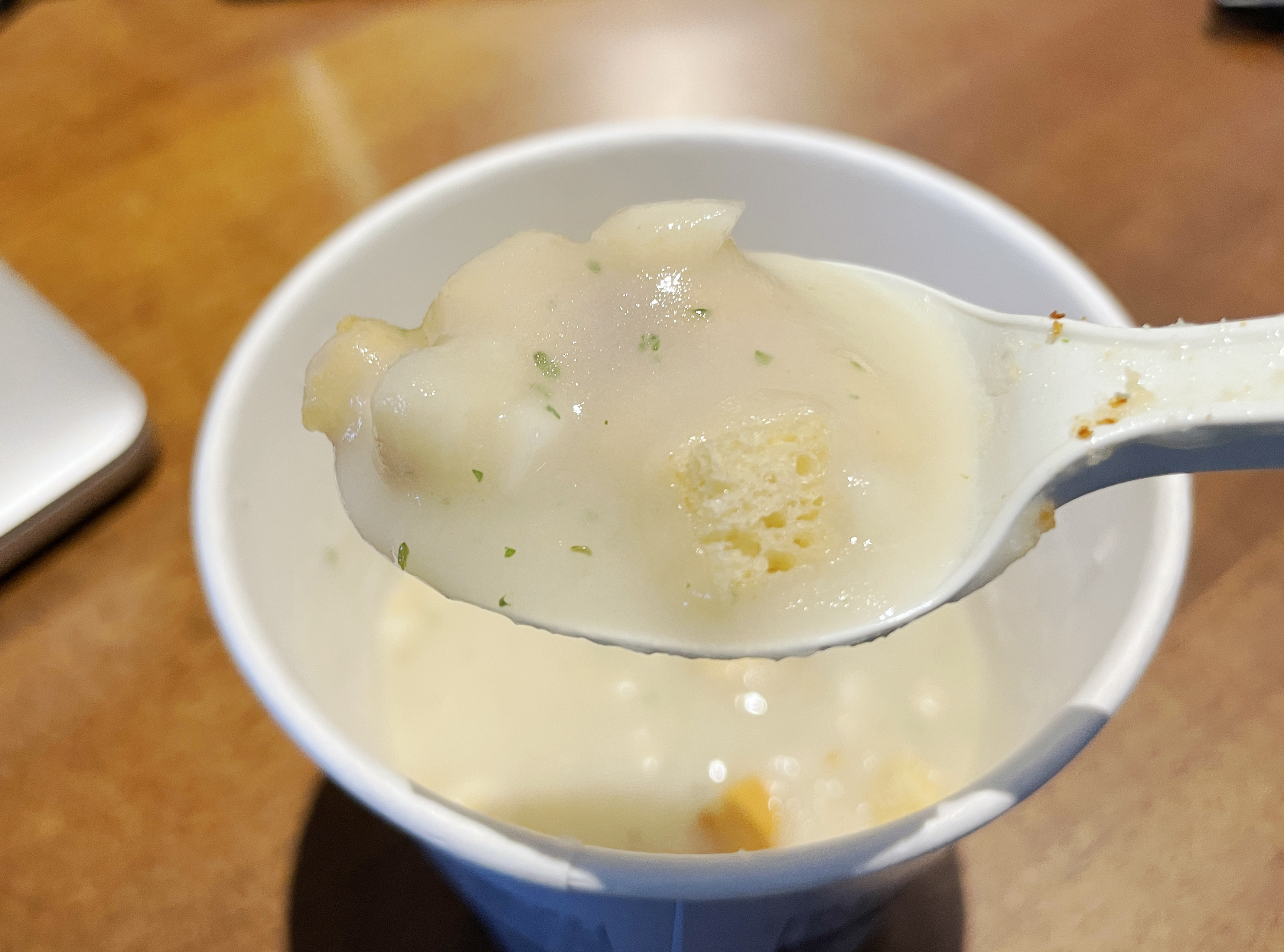 그래서 스푼을 이용해 여러 번 저어주니 이제 스프같은 모습을 보여주더라고요. 스프는 감자조각 같은 조그만 건더기들이 있었는데, 식감은 그저 그랬는데 스프의 맛은 괜찮더라고요.