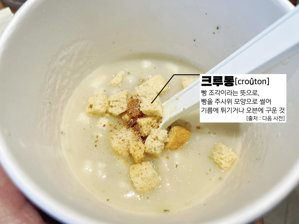 완성된 포테이토 스프에 크루통을 넣어주어 완성했습니다. 크루통은 빵 조각이라는 뜻이 있다고 하는데요, 빵을 주사위 모양으로 썰어서 기름에 튀기거나 오븐에 구운 것이라고 합니다. 완성된 포테이토 스프를 먹어보았는데, 크루통을 넣었더니 크루통 사이에 스프가 잘 배어들어 든든하고 맛이 좋았습니다.