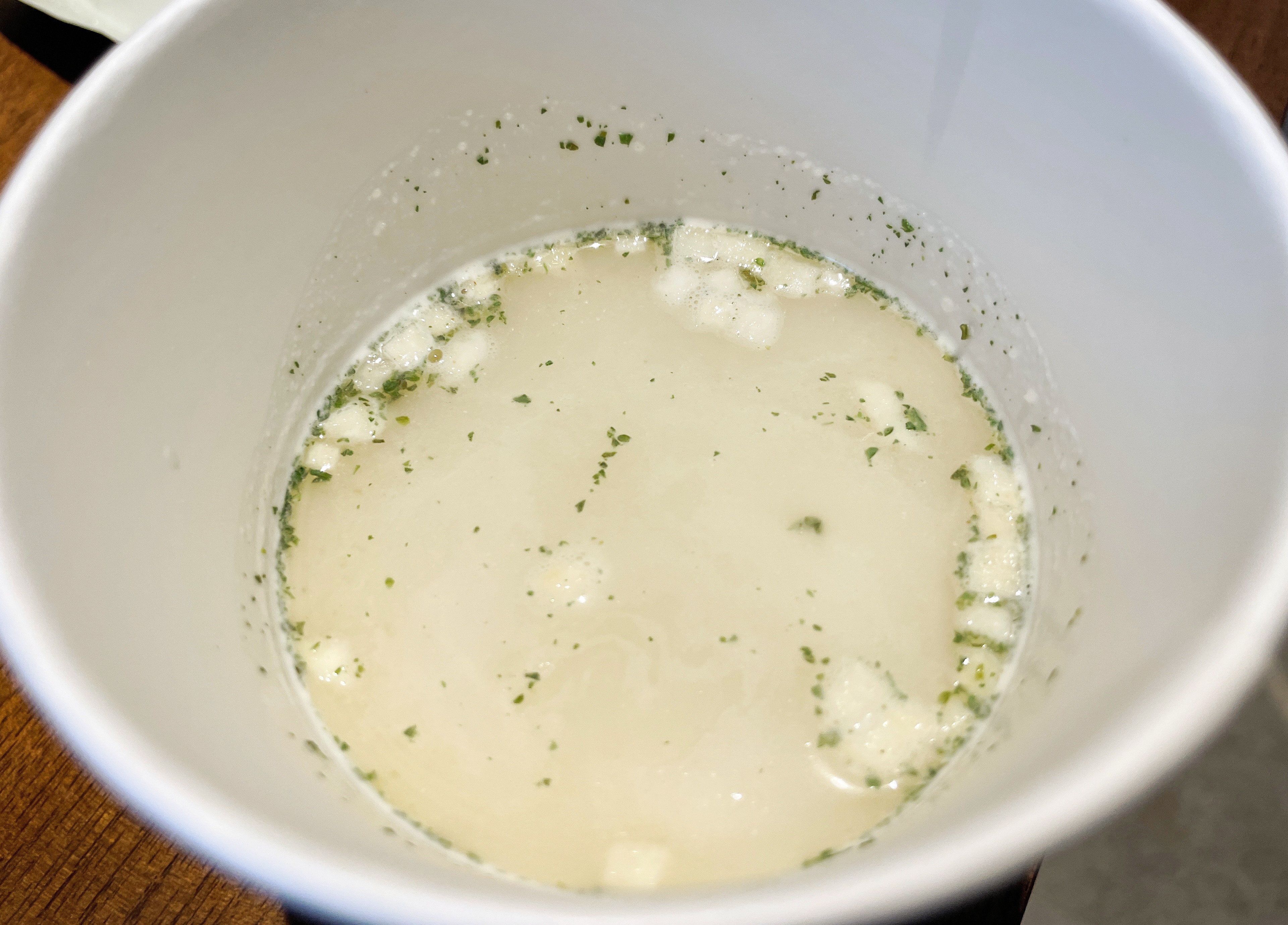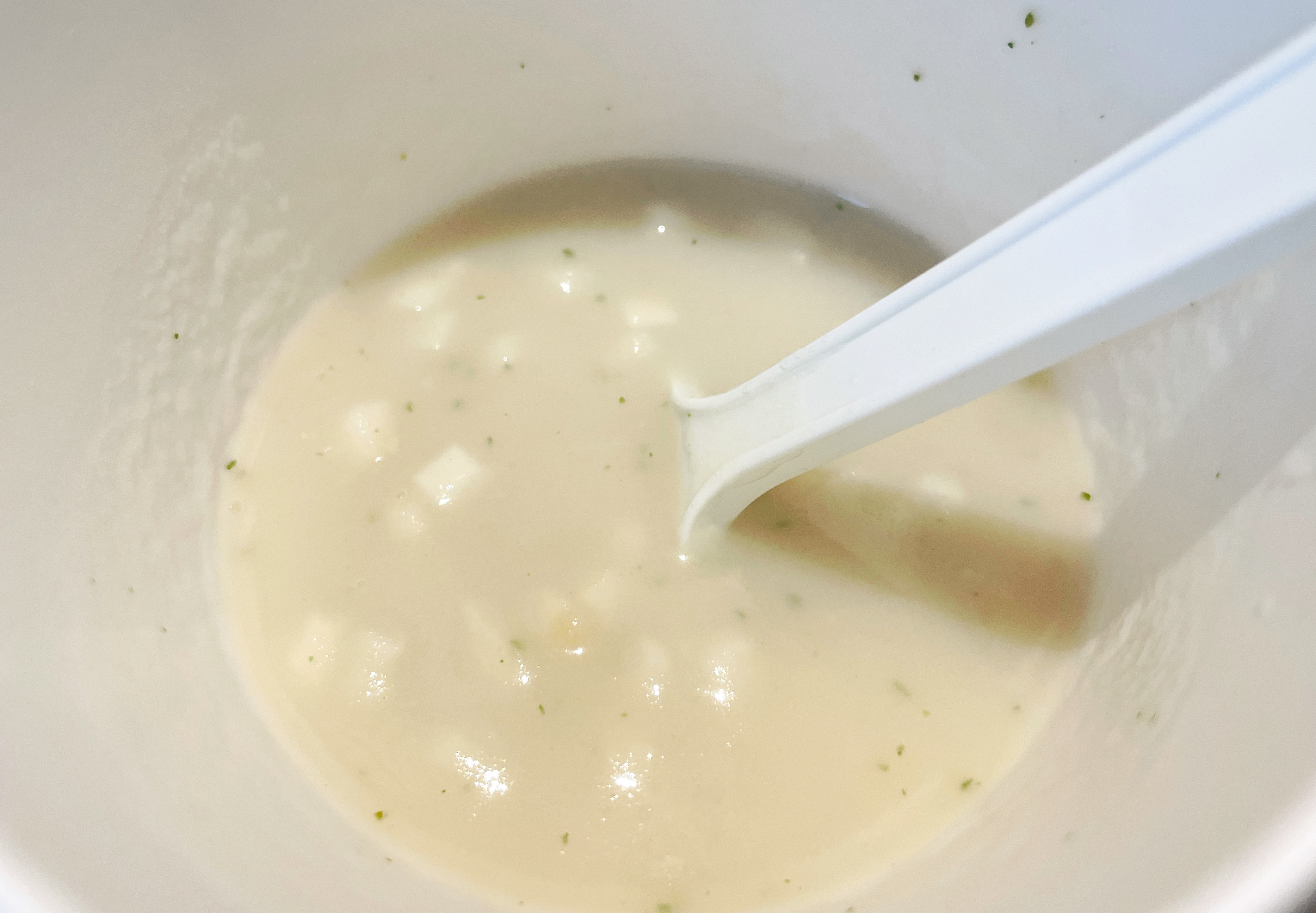 그래서 스푼을 이용해 여러 번 저어주니 이제 스프같은 모습을 보여주더라고요. 스프는 감자조각 같은 조그만 건더기들이 있었는데, 식감은 그저 그랬는데 스프의 맛은 괜찮더라고요.