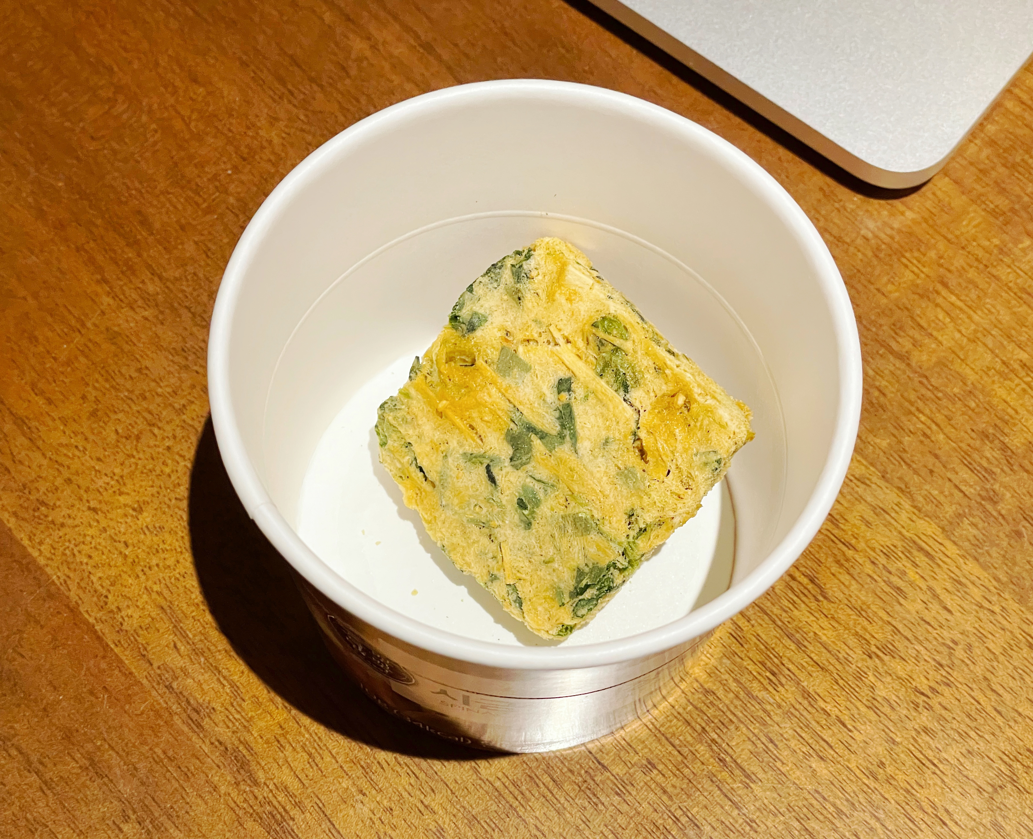 내용물은 시금치된장국 블럭이 들어있는 봉지와 컵이 있었는데, 블럭을 싸고 있는 포장지를 제거하고 컵 안에 넣어준 다음 커피포트를 이용해 뜨거운 물을 표시선까지 부어주었습니다. 물을 붓자마자 건조되었던 채소들이 풀어지는 모습을 볼 수 있었고, 제법 색깔이 그럴듯하더라고요.