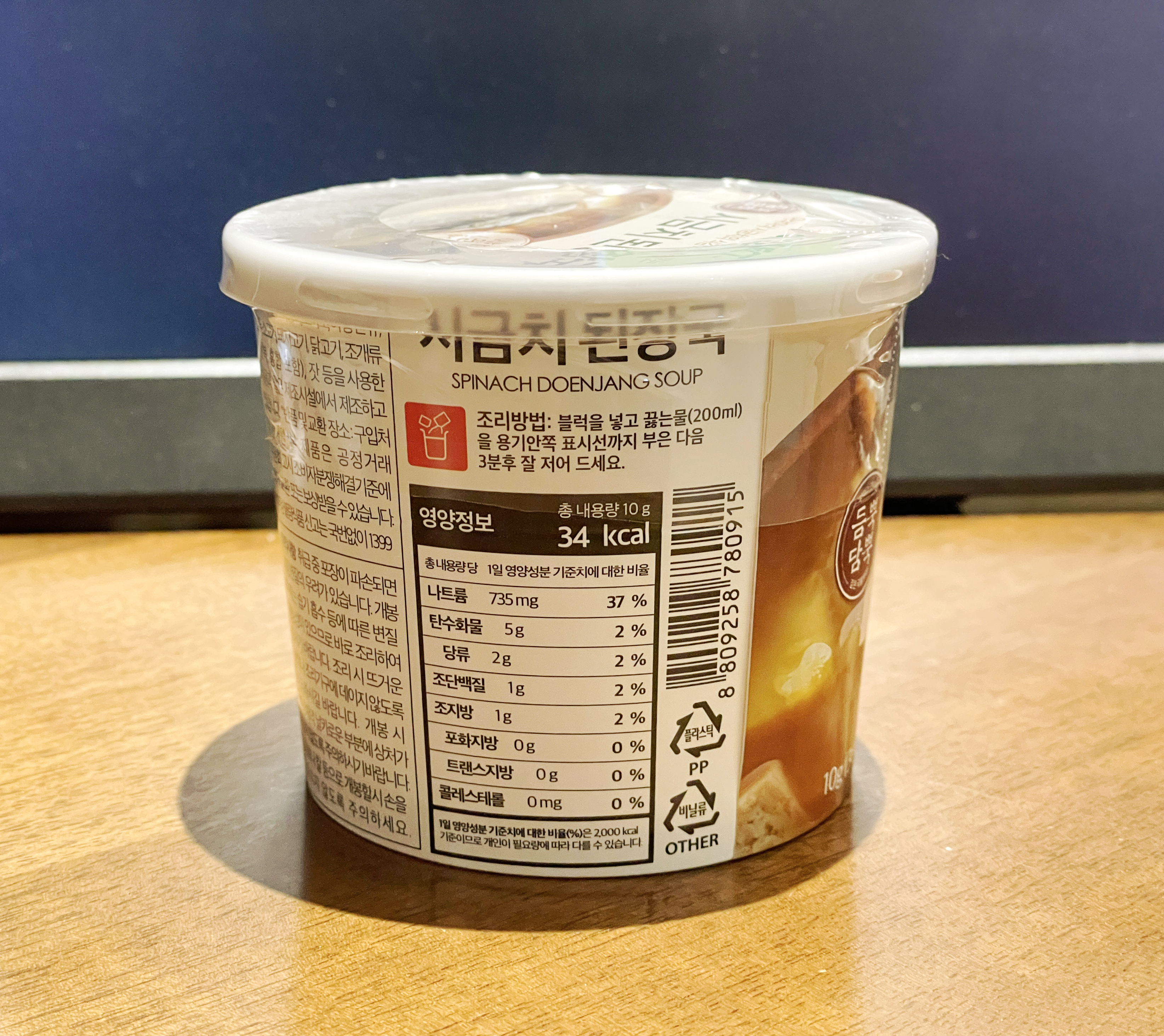 세븐일레븐 시금치된장국의 용량은 10g 이었고, 열량은 34kcal 였습니다. 제조원은 동림푸드라는 곳이었고, 크기는 컵라면 작은 컵 정도의 사이즈였습니다. 제품에는 "아삭아삭 시금치의 식감이 살아있는" 시금치 된장국 이라고 하는데, 과연 시금치 된장국으로 제가 기대한 맛이 나올지 함께 살펴보시죠.