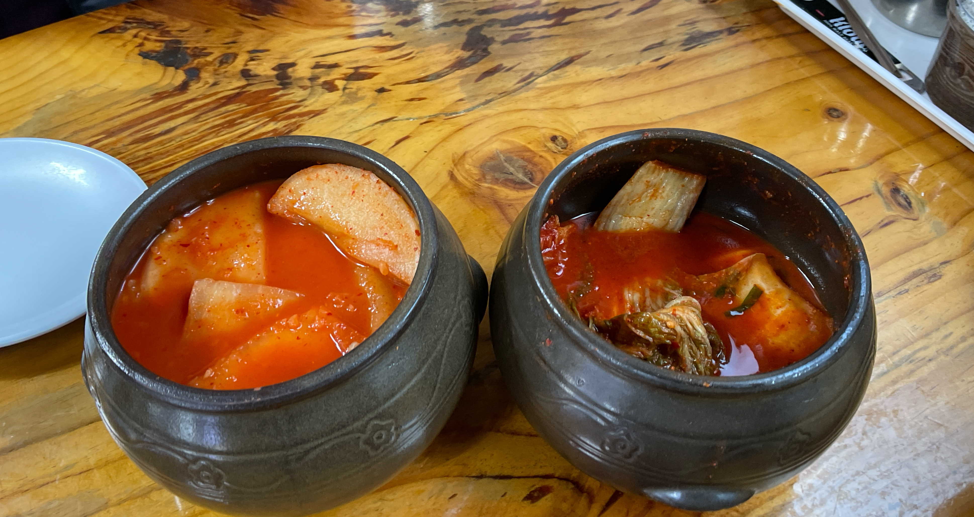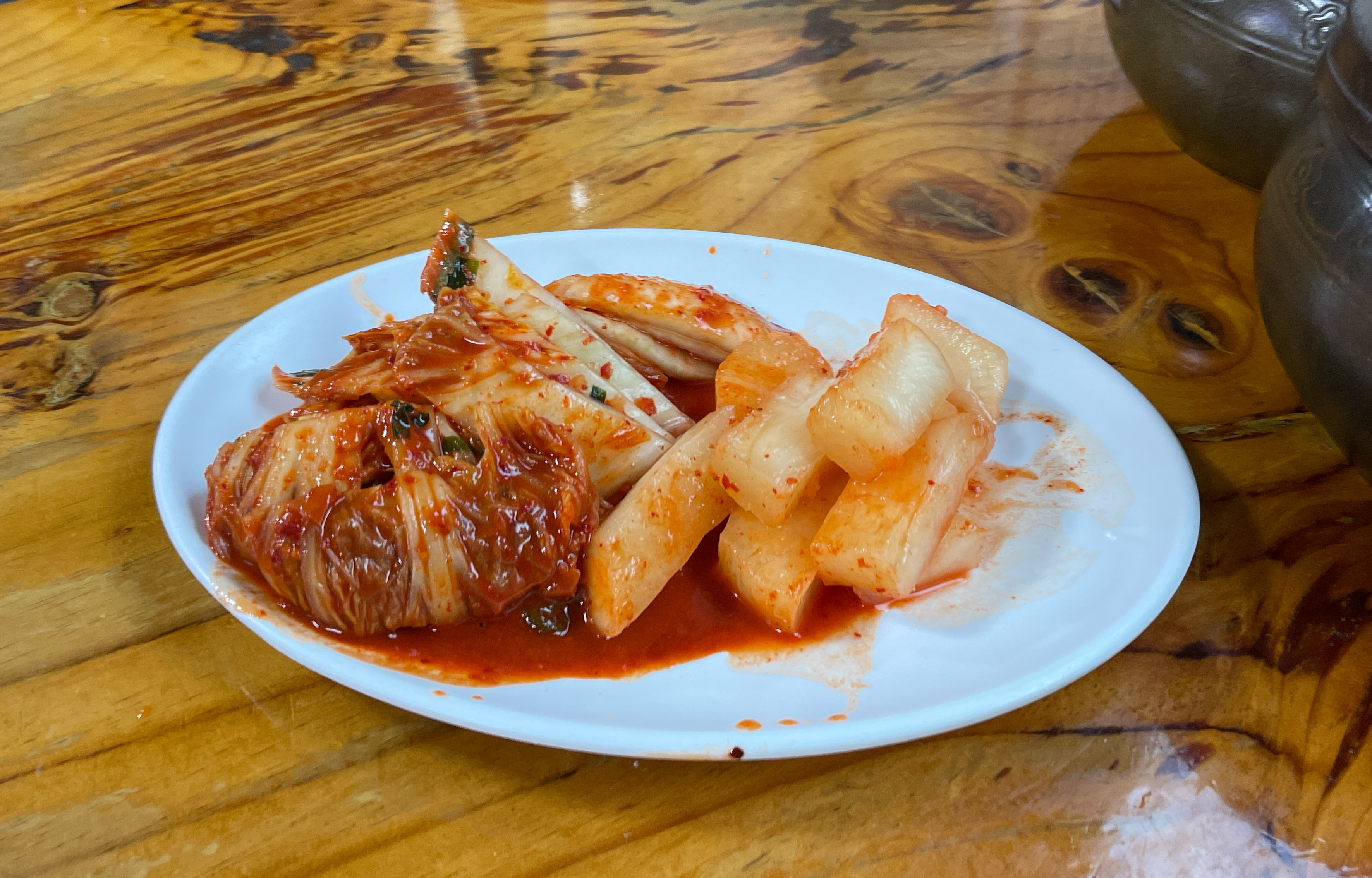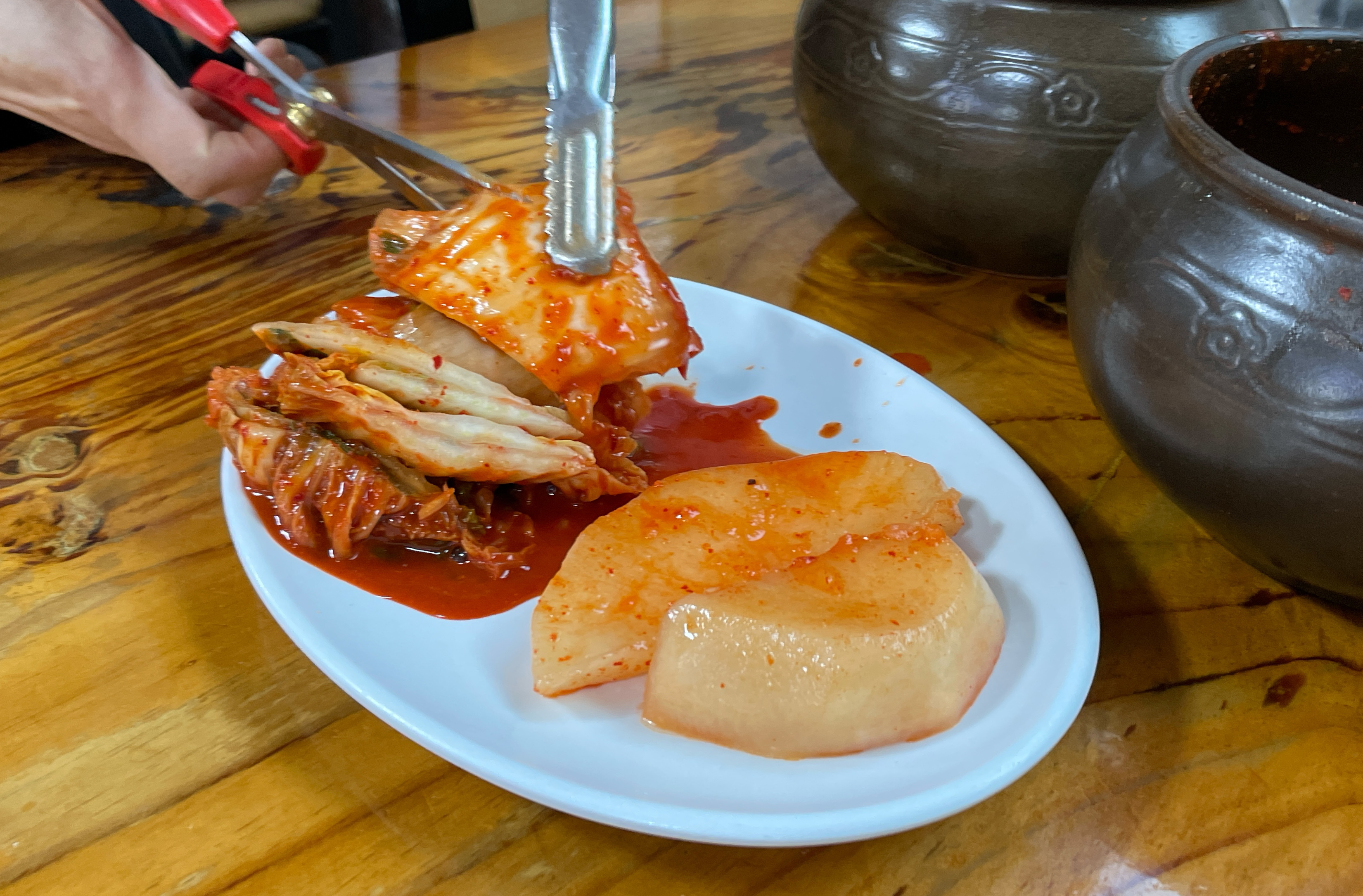 밑반찬인 섞박지, 배추김치의 모습입니다. 항아리에 담겨 있어서 먹을 만큼 덜어내어 잘라주면 되었고, 저는 무김치도 맛있었지만, 개인적으로 배추김치가 씹는 식감이 더 아삭아삭 하고 맛있었습니다.