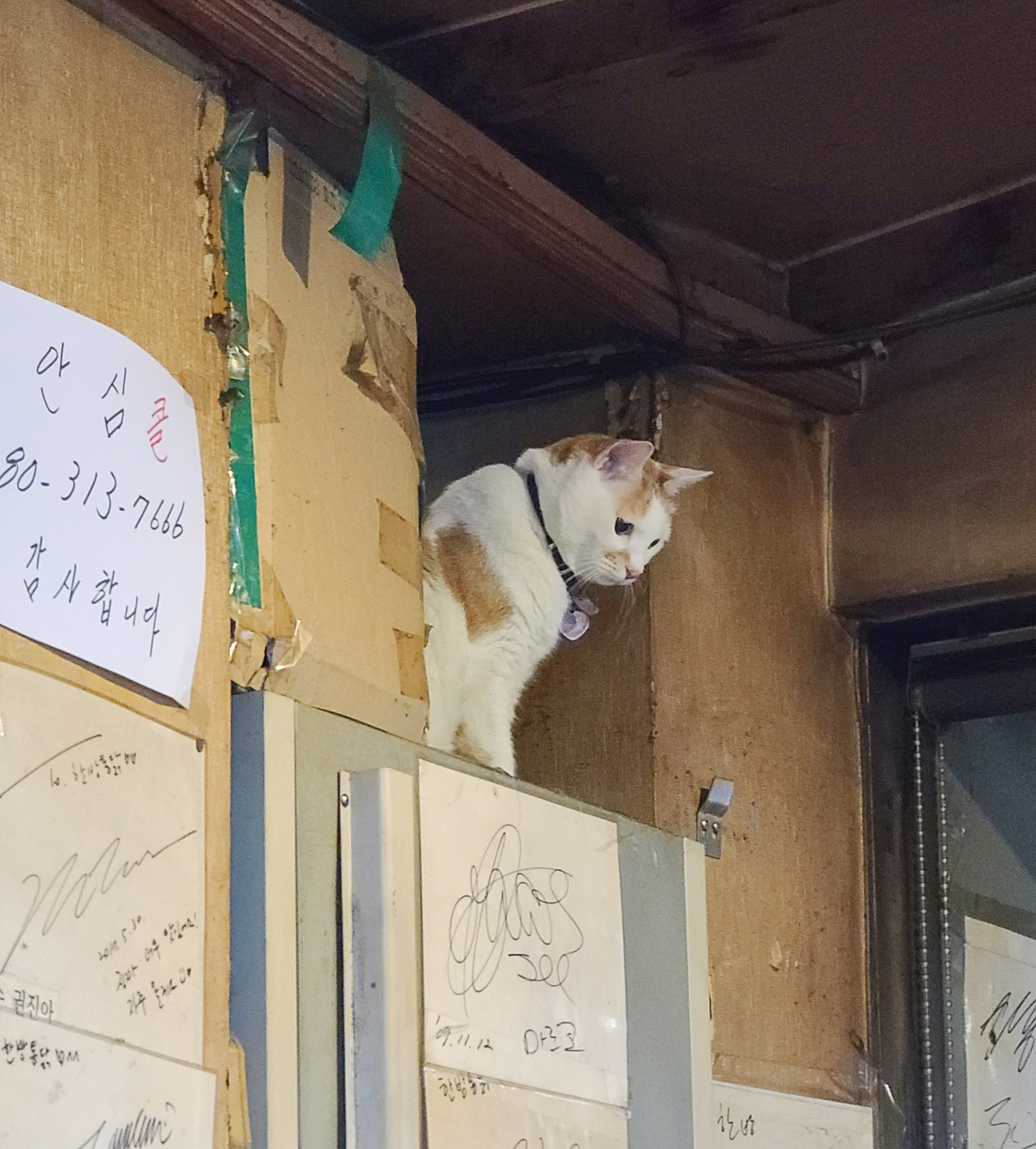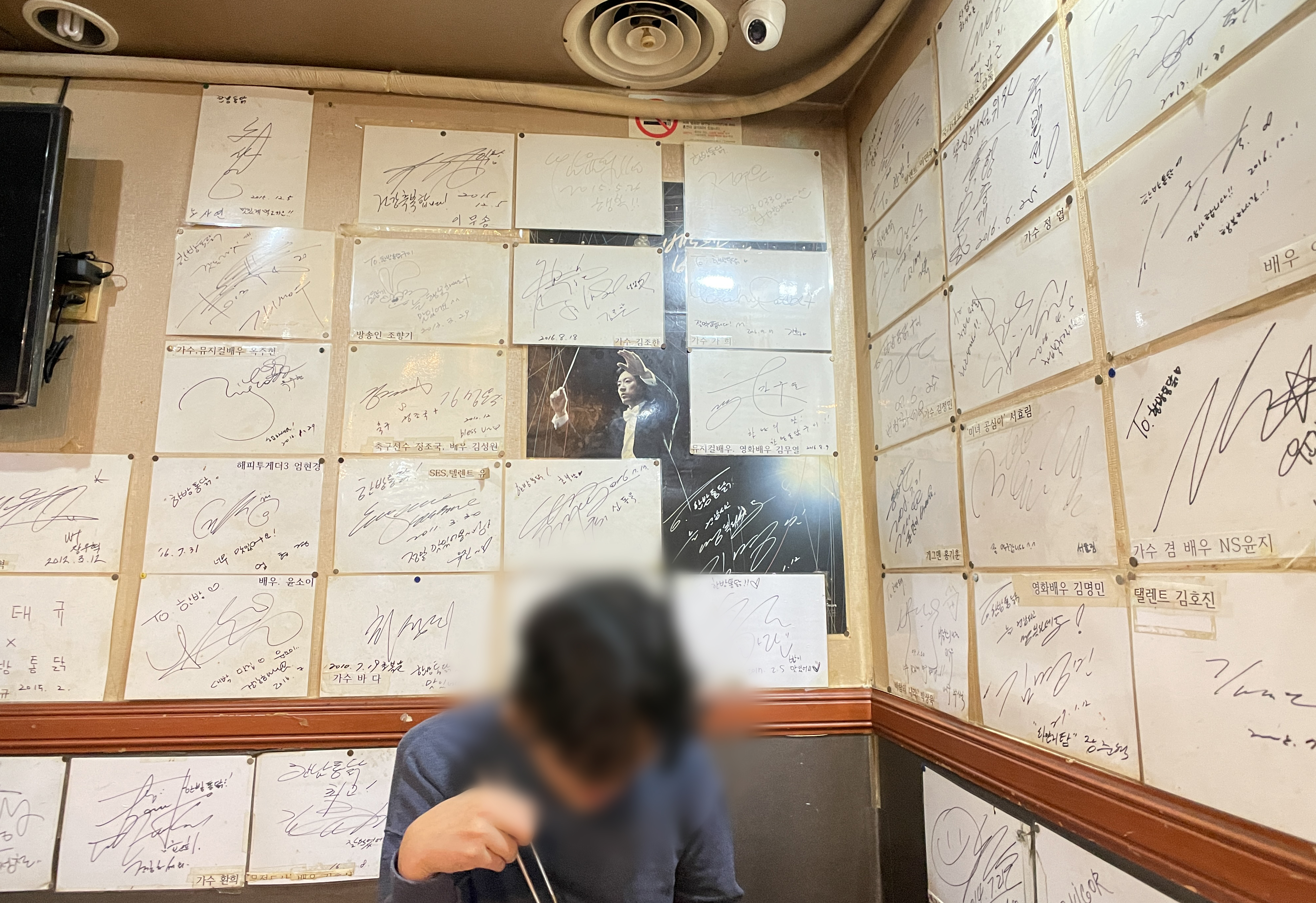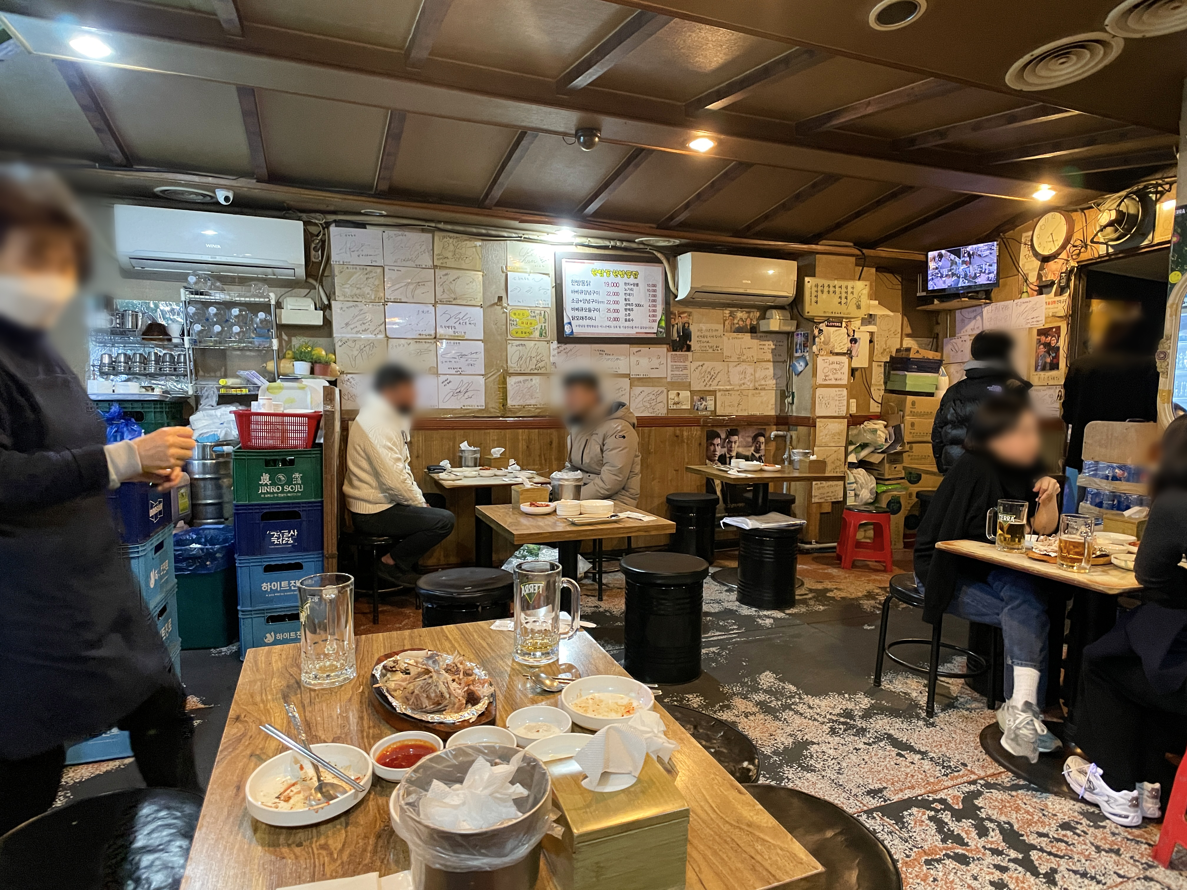 한남동한방통닭 가게 앞은 제일 많이 판매되는 장작구이 통닭이 쉴새없이 돌아가고 있었습니다. 연예인도 많이 찾는 맛집이다보니 곳곳에는 연예인과 유명인들의 친필 사인이 많이 붙어있었습니다.