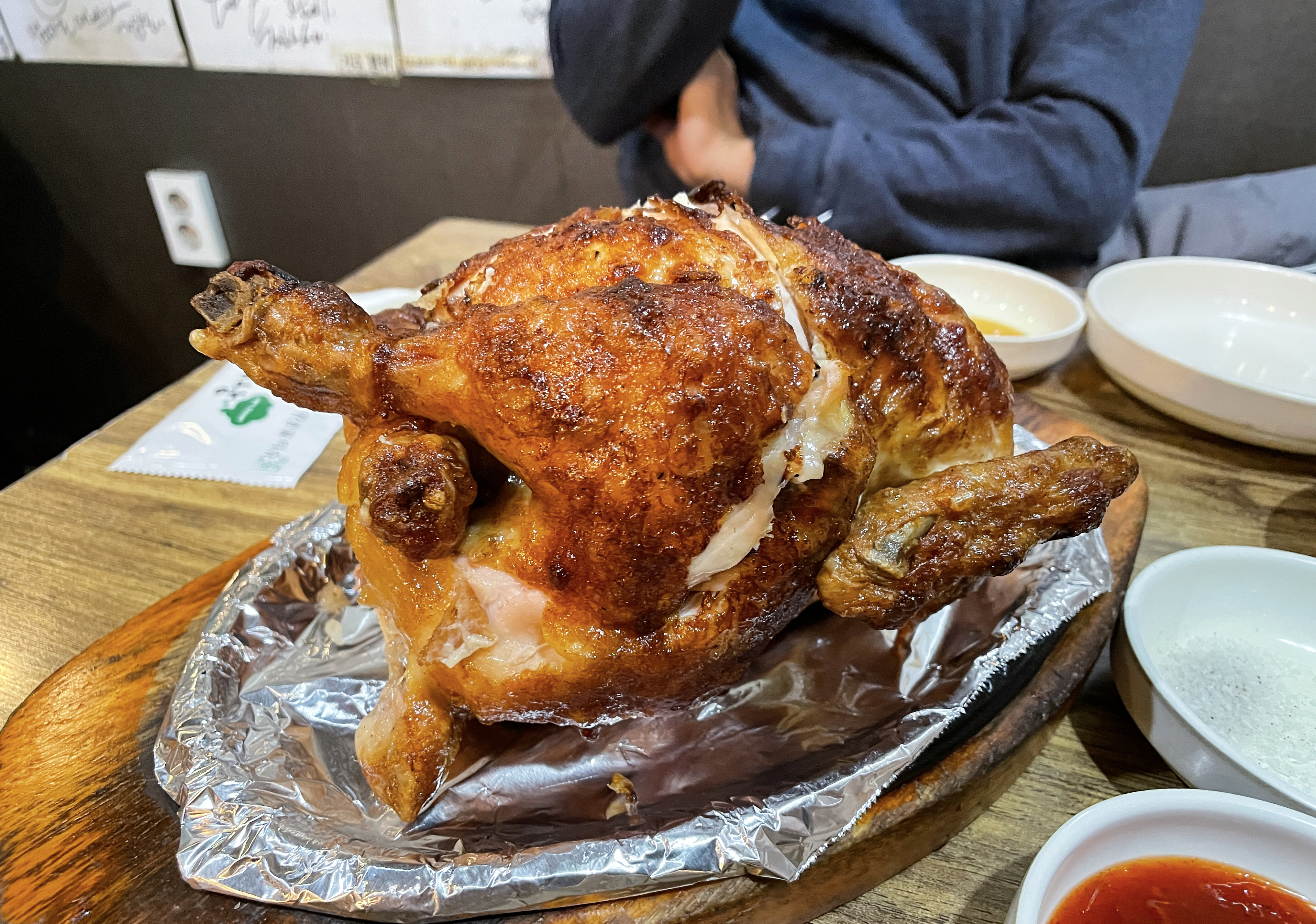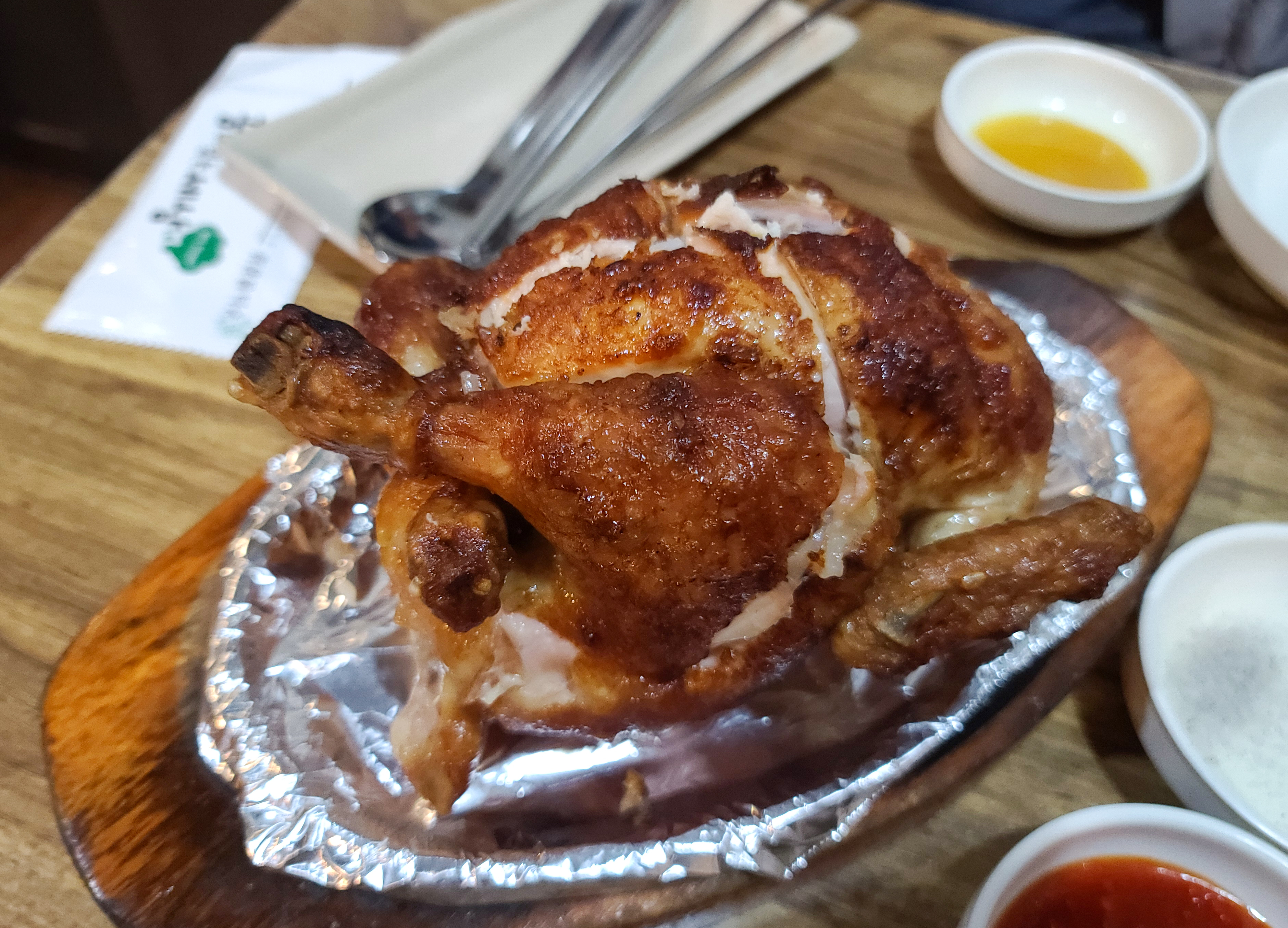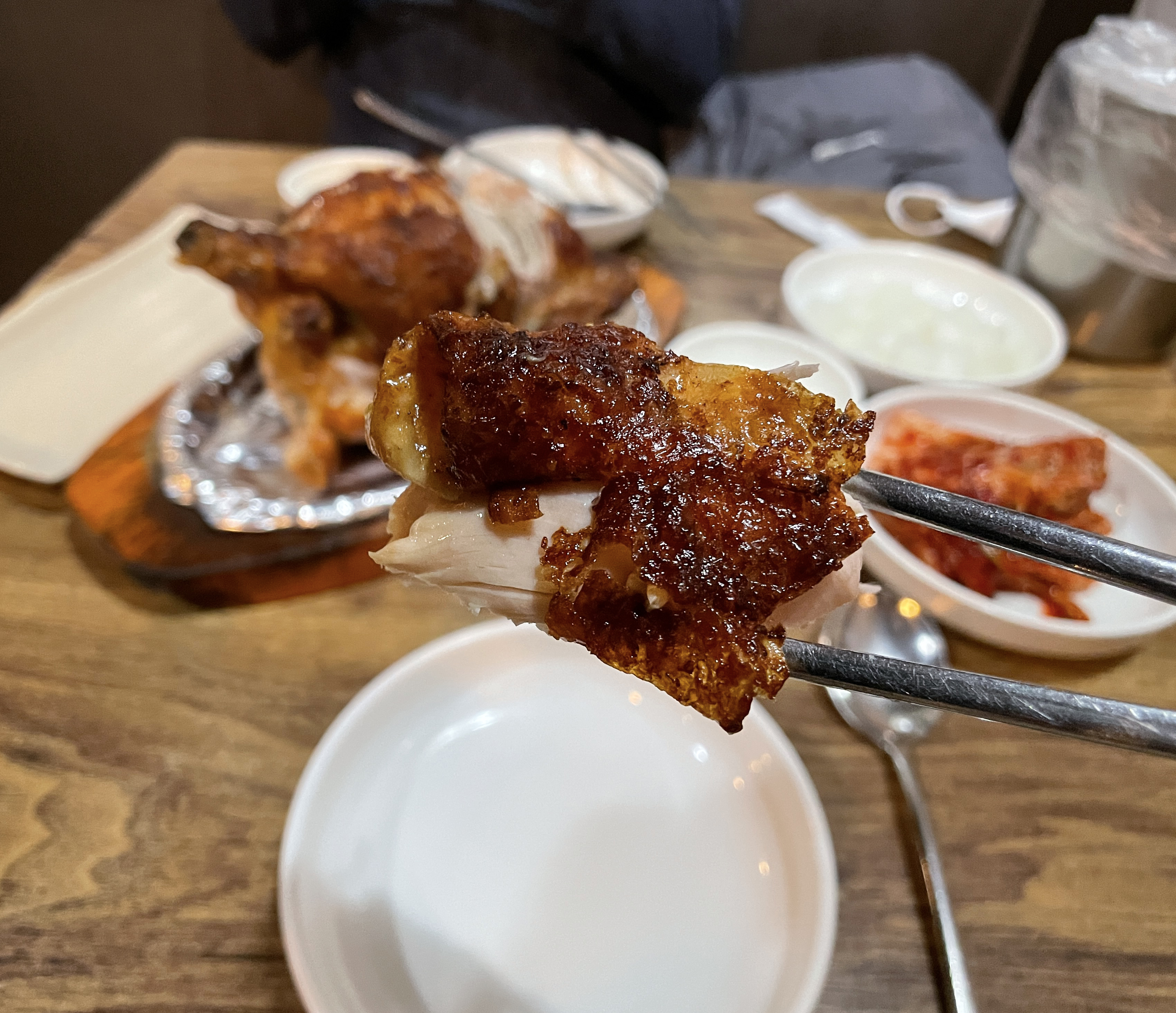 주문한 한방통닭의 모습은 이렇습니다. 겉은 기름기가 쫙 빠져 쫀쫀한 식감의 껍데기가 있었고, 속살은 장작구이 통닭임에도 식감이 부드러웠습니다. 물론 우리가 흔히 아는 통닭처럼 닭 속에 찰밥과 은행 등이 들어갔습니다. 반찬으로 치킨무와 배추김치가 나오는데, 배추김치가 특히 맛있더라고요.