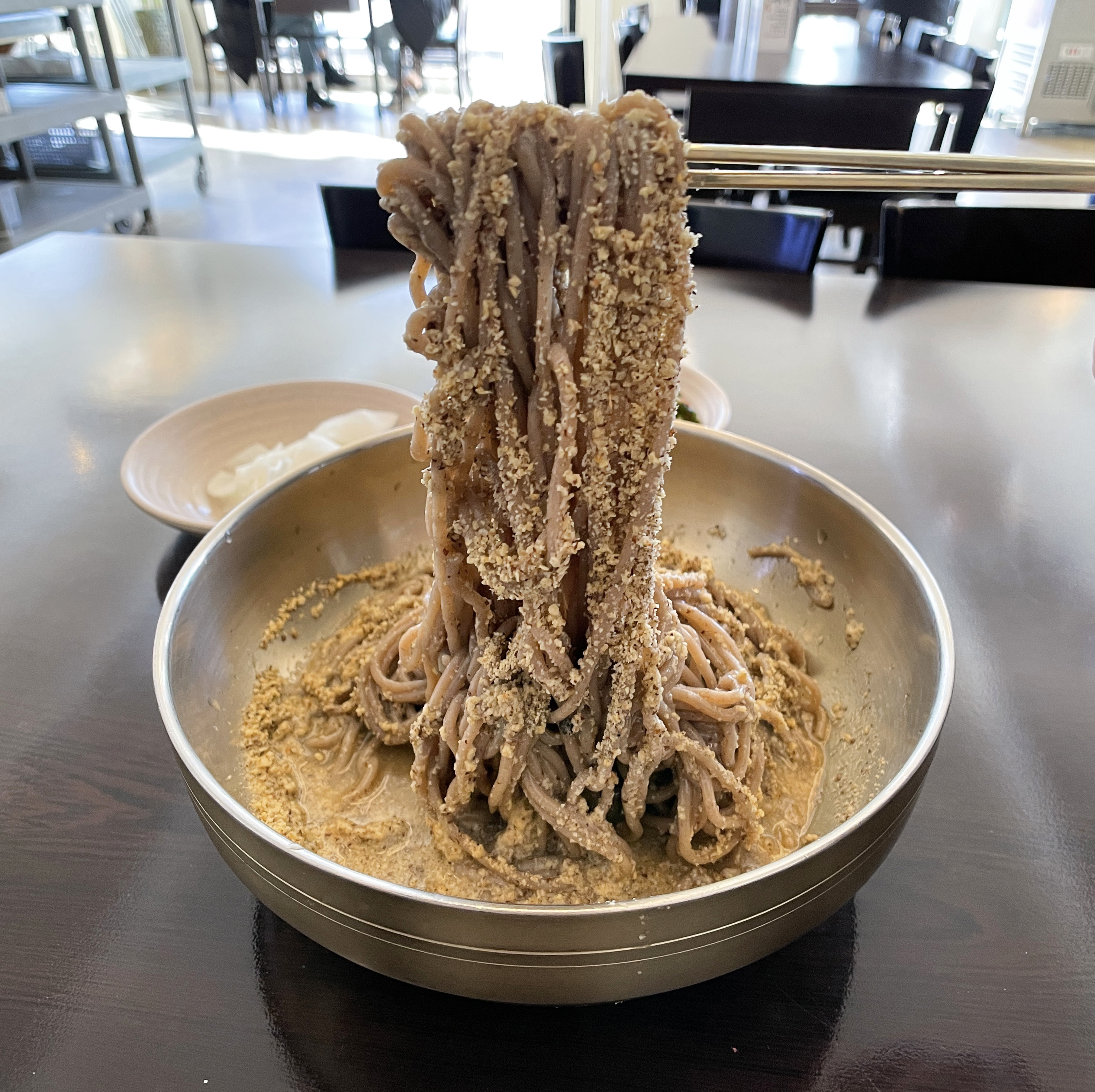 들깨막국수는 고소한 들깨가 막국수 위에 듬뿍 올라간 메뉴였고, 들깨막국수라는 메뉴는 처음 접해보는데 생각보다 맛있더라고요. 들깨가 올라가서 그런지 고소한 맛이 중독성이 있었고, 면의 식감도 탄력이 있어서 씹는 맛이 좋았습니다.