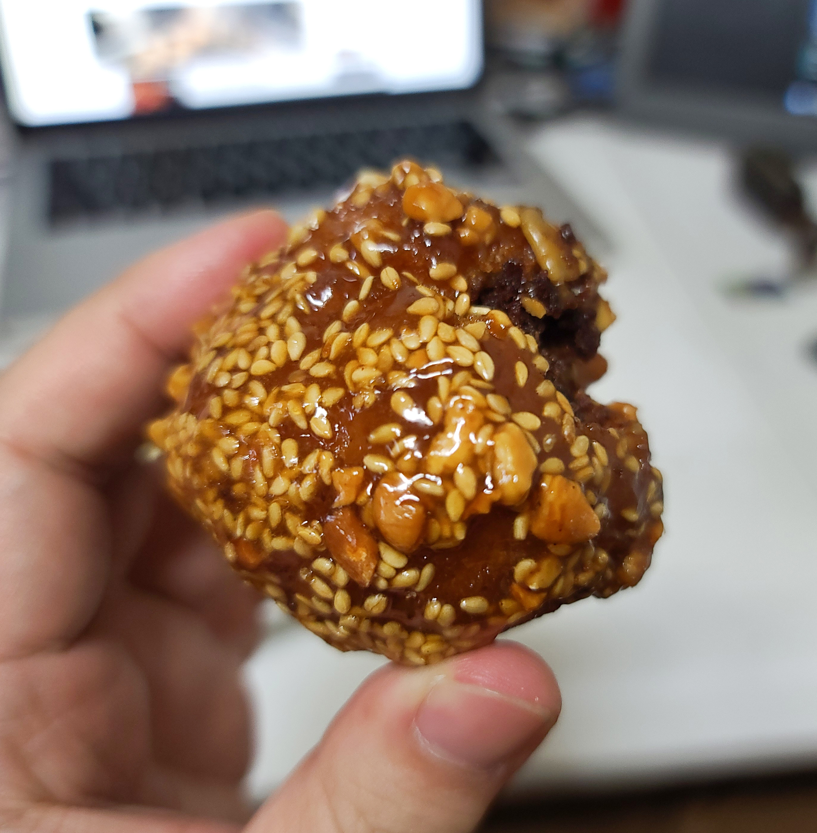 진주 덕인당 꿀빵의 모습입니다. 빵의 겉면은 코팅이 되어있어 바삭하기도 하고 조금 딱딱한 식감이었는데, 빵의 반을 갈라서 속에 있는 내용물이랑 같이 먹으니 맛이 괜찮더라고요.