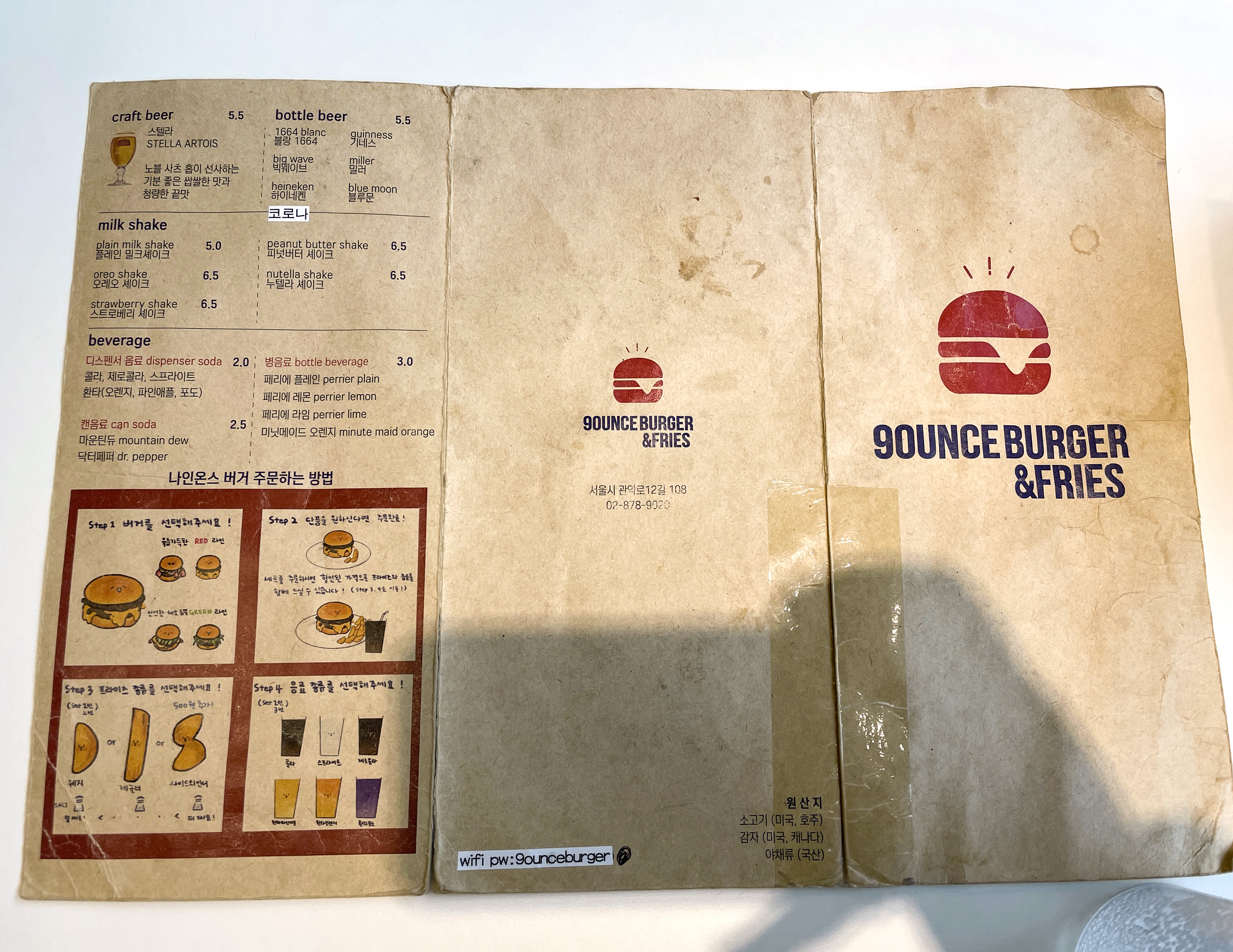 나인온스버거의 메뉴들을 살펴보실까요? 9온스버거, 9온스버거주니어, 그릴드어니언치즈버거, 칠리버거, 타코버거, 캘리포니아버거, 텅-타이드버거, 루꼴라버거, 포시즌버거, 클래식버거, 1/2프렌치프라이즈, 프렌치프라이즈, 어니언링, 칠리프라이즈, 치즈프라이즈, 칠리치즈프라이즈, 플레인밀크셰이크, 오레오셰이크, 스트로베리셰이크, 피넛버터셰이크, 누텔라셰이크 등 이 있었습니다. 저는 나인온스버거의 9온스버거와 세트구성을 주문했습니다.