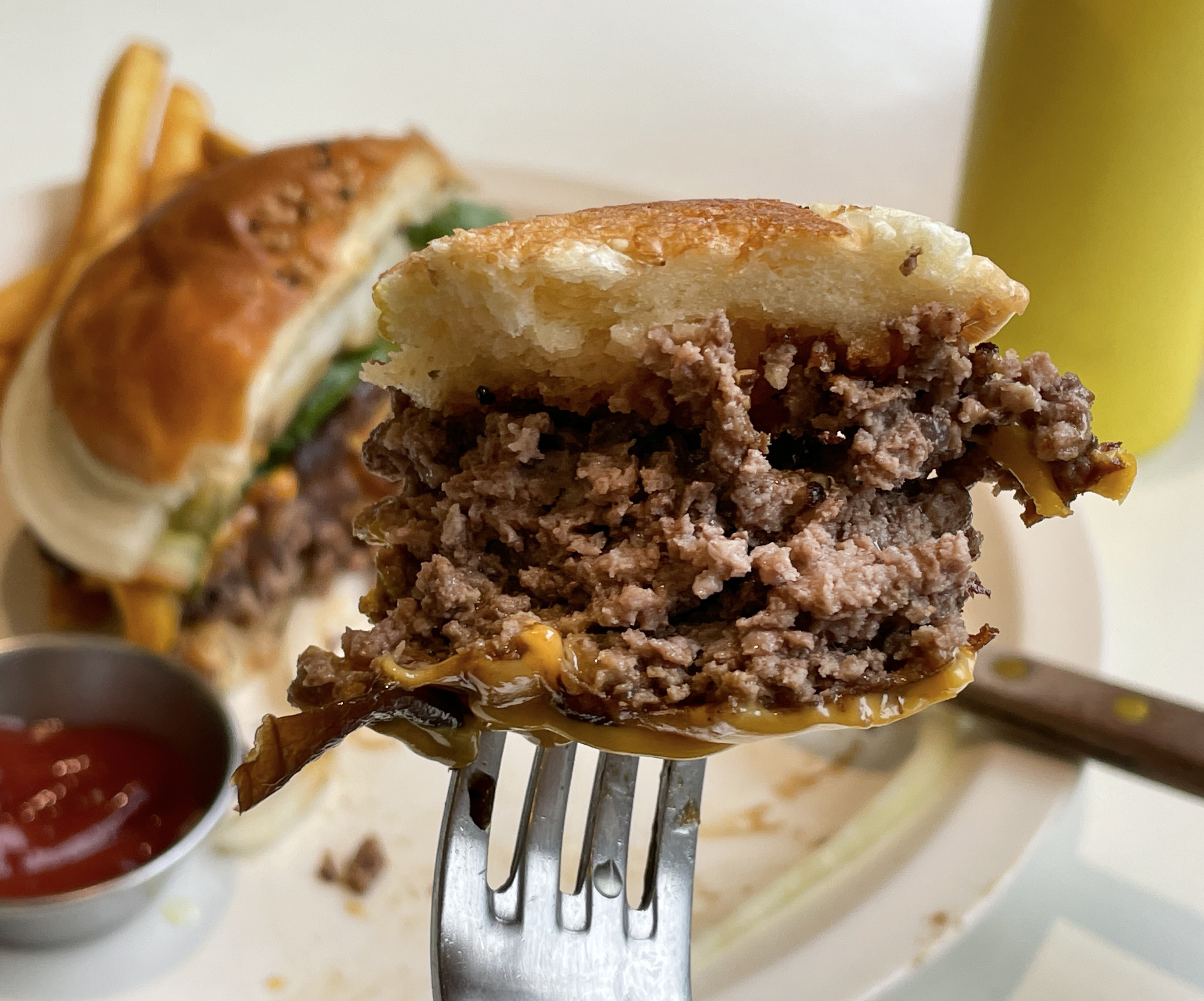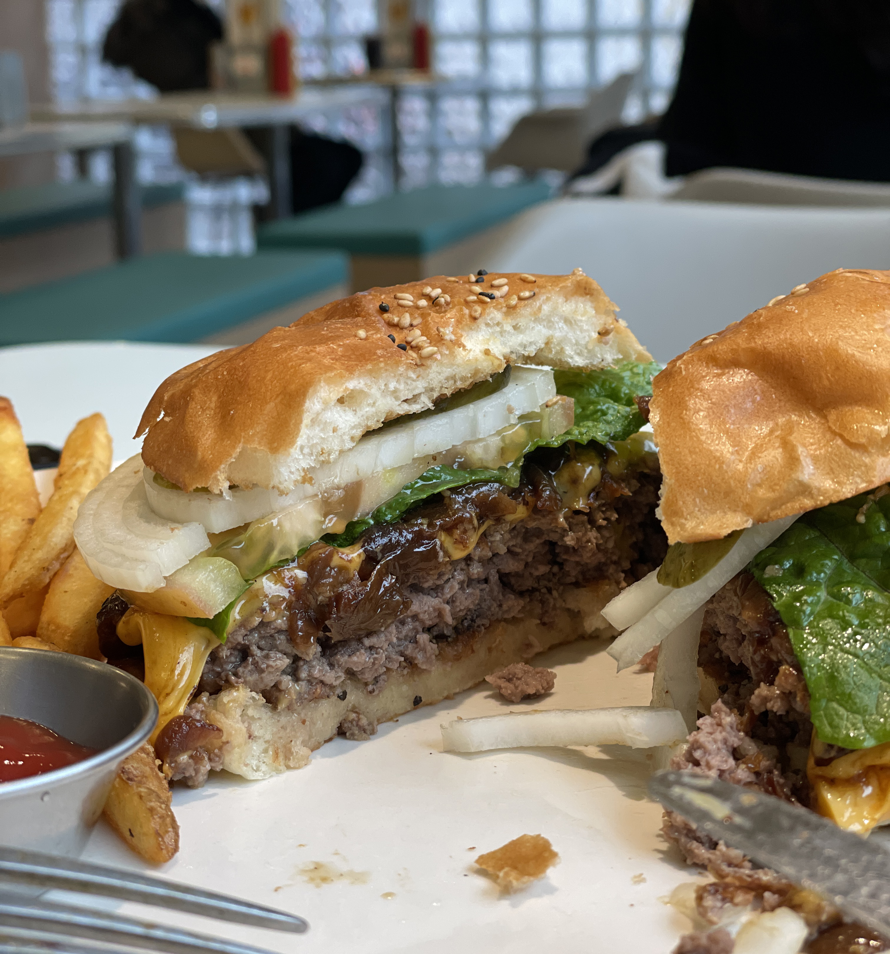 나인온스버거를 그냥 통째로 먹기엔 양이 많고 부담스럽기 때문에, 저는 나이프를 이용해 잘라서 먹었습니다. 사실 육즙가득 패티를 기대했는데, 나인온스버거의 패티는 육즙이 가득하다기 보다는 조금 퍼석해보이는 느낌이 있었습니다.
