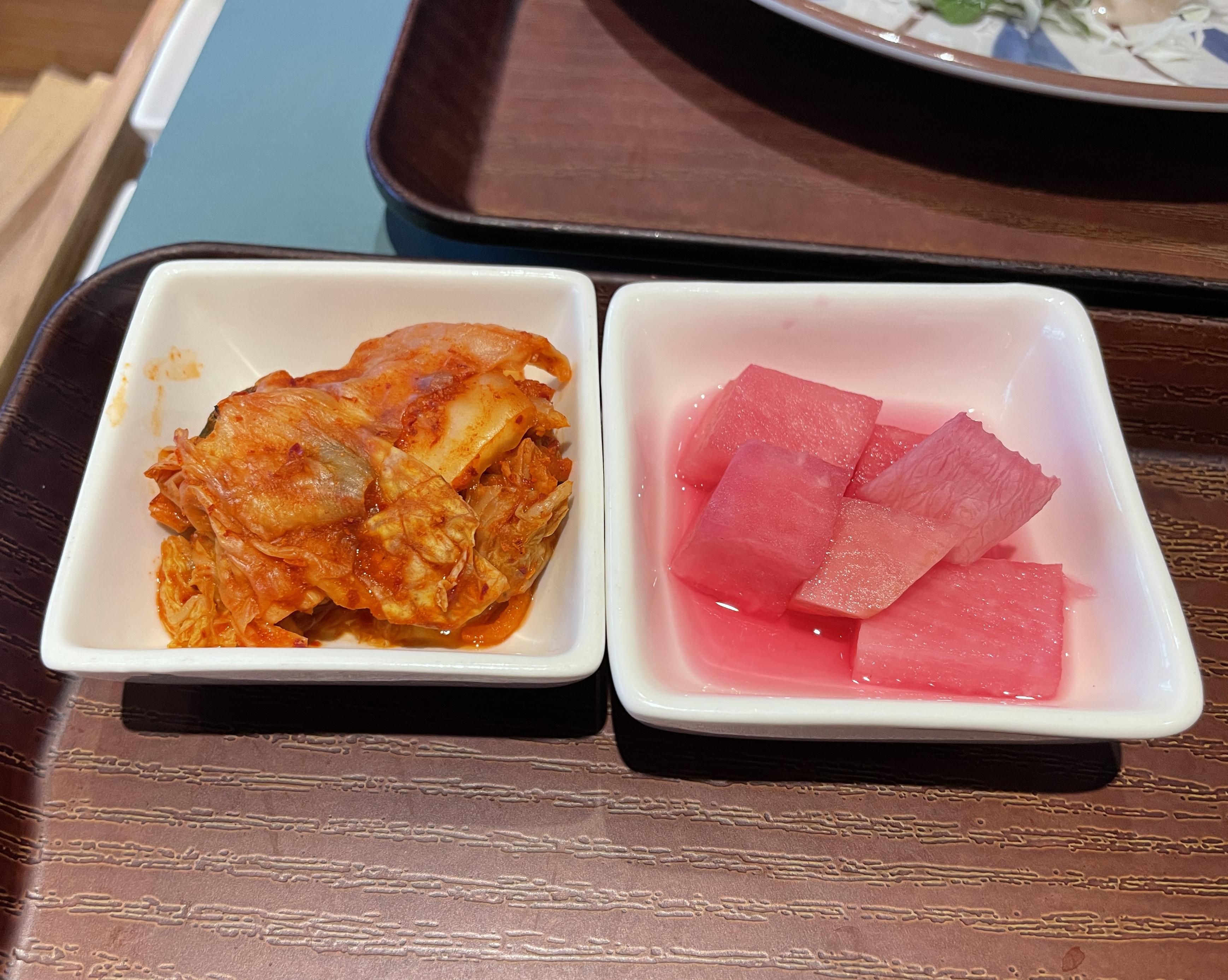 그리고 요즘은 장국과 반찬을 직접 가져다주시는 것 같더라고요. 예전엔 장국은 직접 가져다 먹을 수 있게 되어있던 것 같았는데, 직접 가져다주시니 편리하긴 하더라고요. 반찬으로는 배추김치와 무 피클이 나왔습니다.
