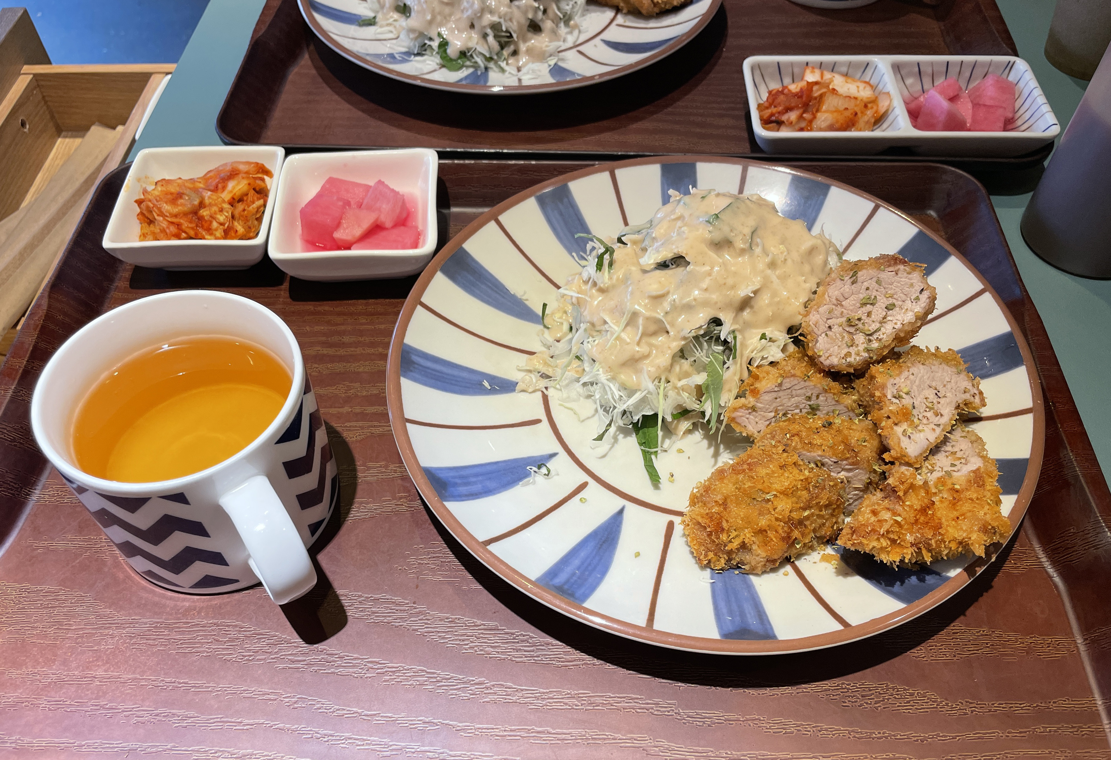 그리고 요즘은 장국과 반찬을 직접 가져다주시는 것 같더라고요. 예전엔 장국은 직접 가져다 먹을 수 있게 되어있던 것 같았는데, 직접 가져다주시니 편리하긴 하더라고요. 반찬으로는 배추김치와 무 피클이 나왔습니다.