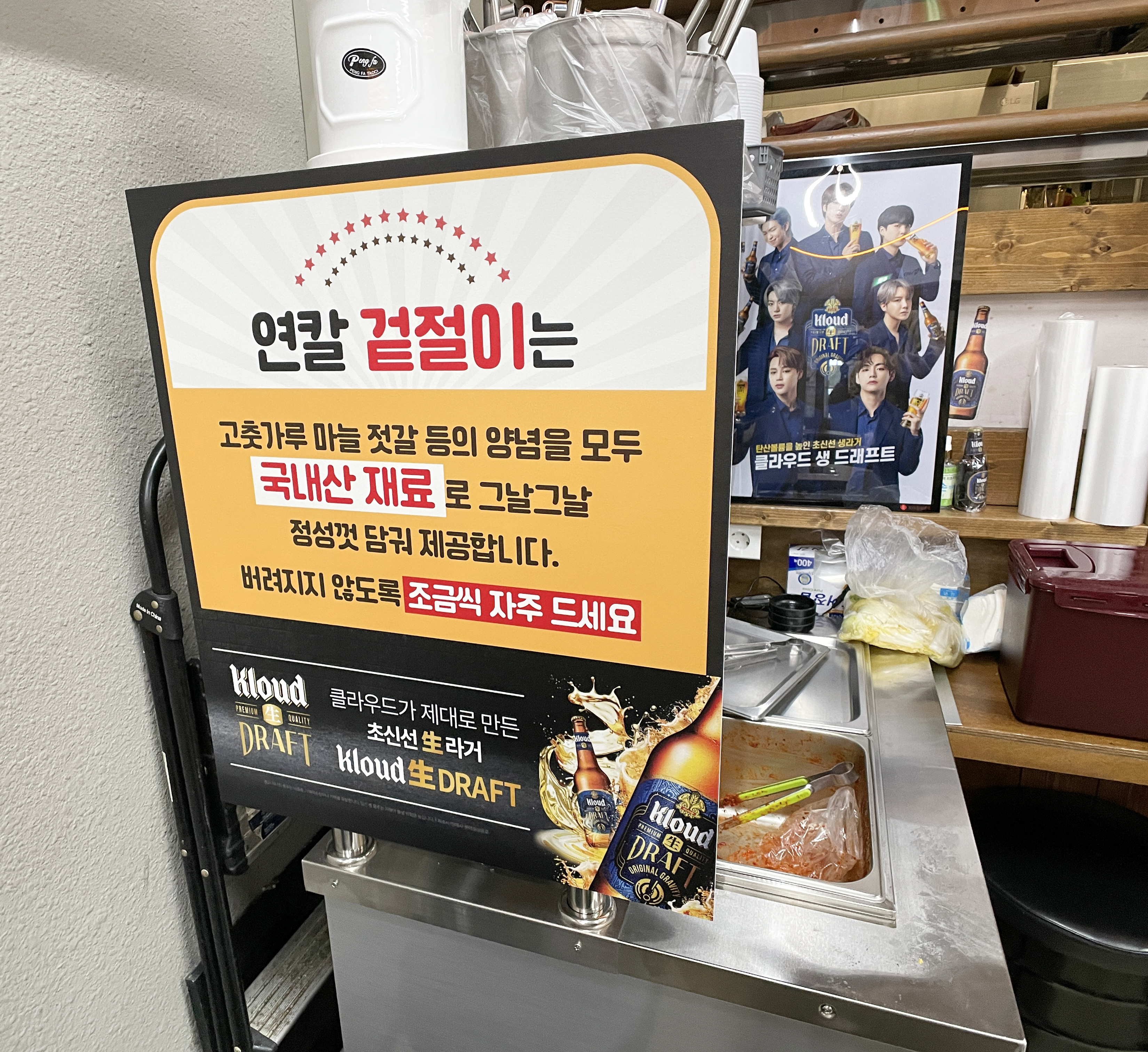 '연우해물칼국수'는 충북 청주시 서원구 사직동 936 푸르지오캐슬 4단지 상가 104호에 위치한 실내포차 겸 식당입니다. 독특한 게 가게 앞 패널을 보니 소방공무원, 푸르지오 경비원, 경찰공무원들이 근무 중에 방문하면 식사비 2,000원을 할인해주는 행사를 하고 있었고, 가게 앞 강냉이 판매 수익금으로 소외계층을 돕는 일도 마련하고 있었습니다.