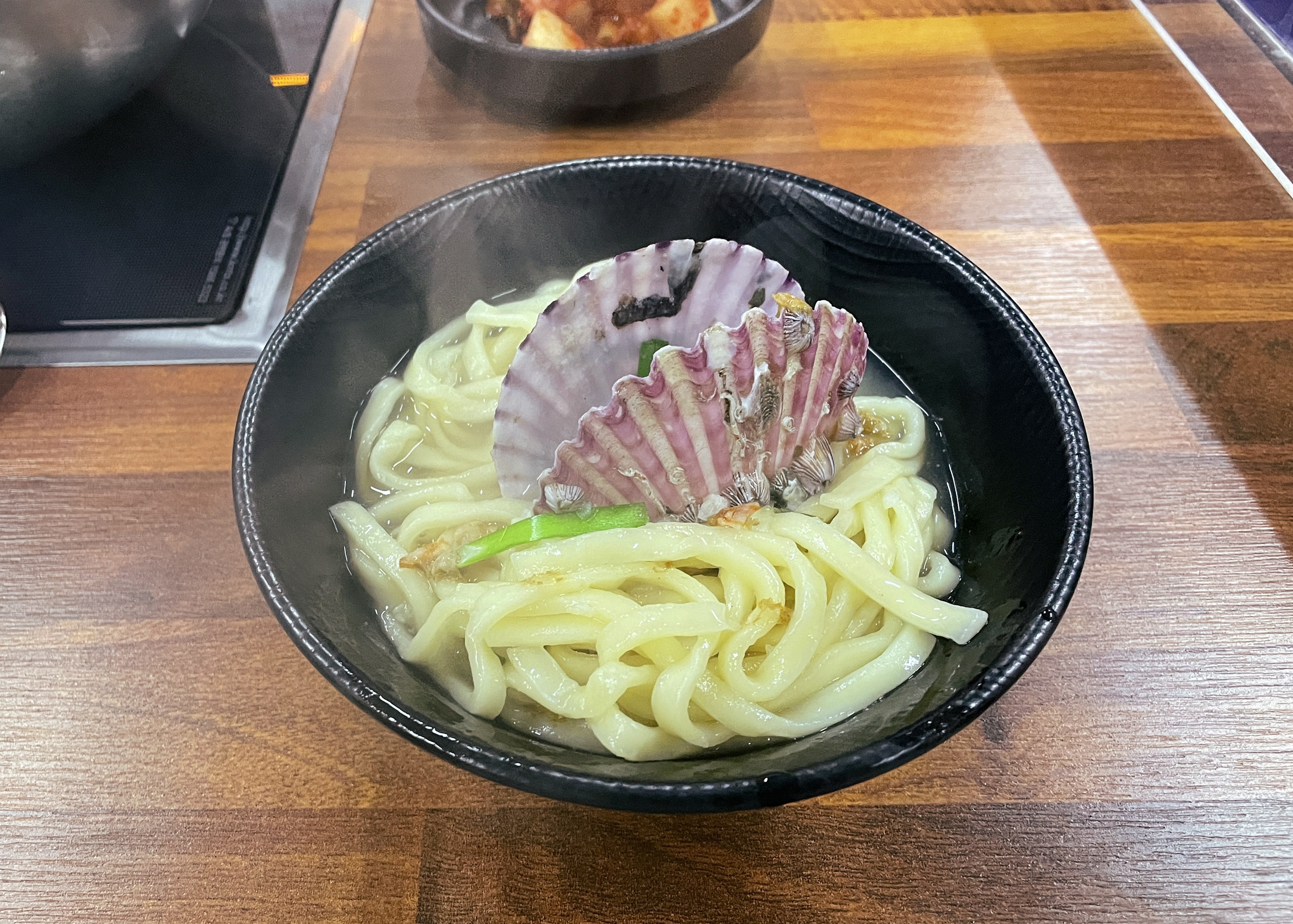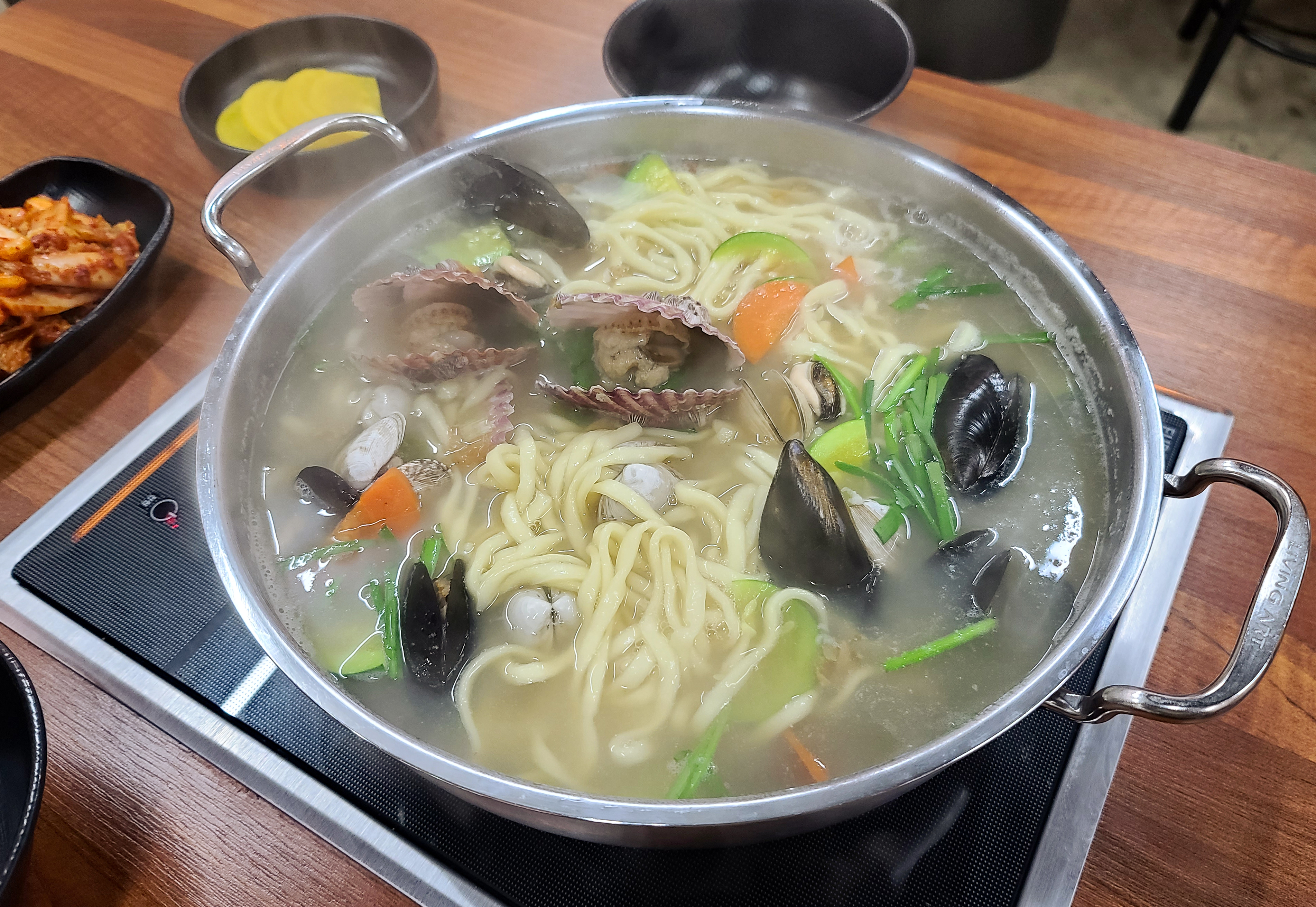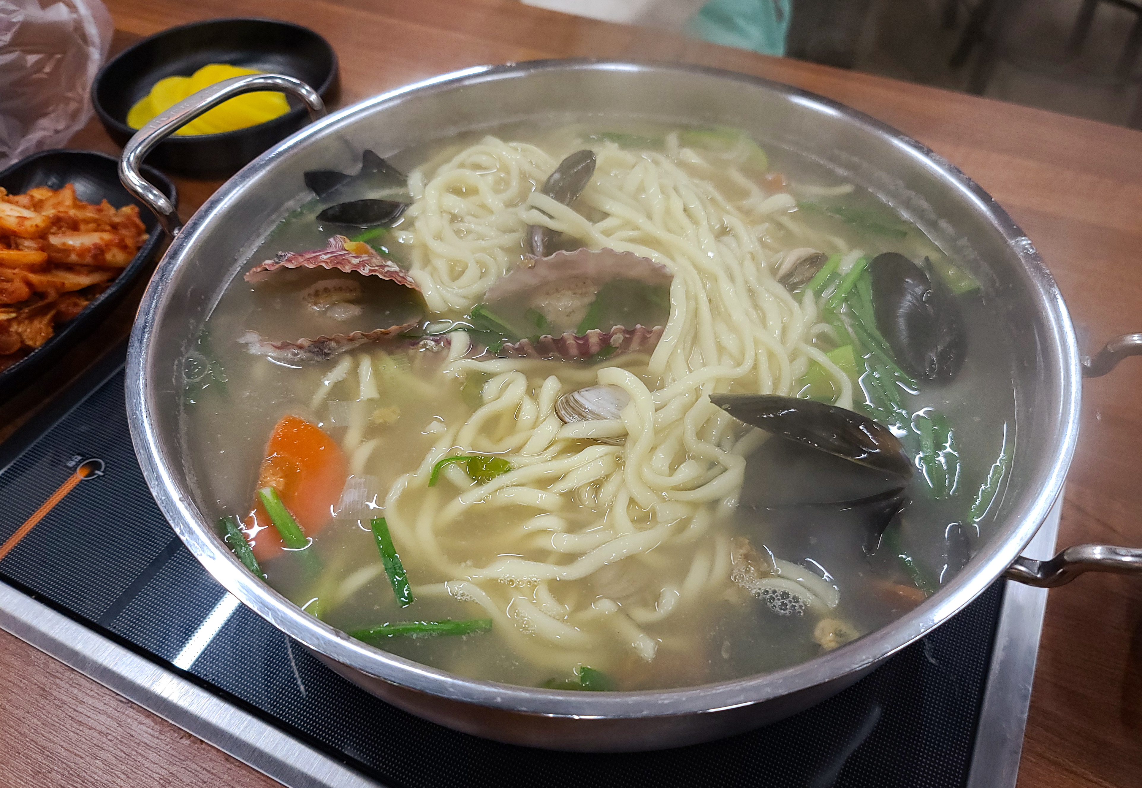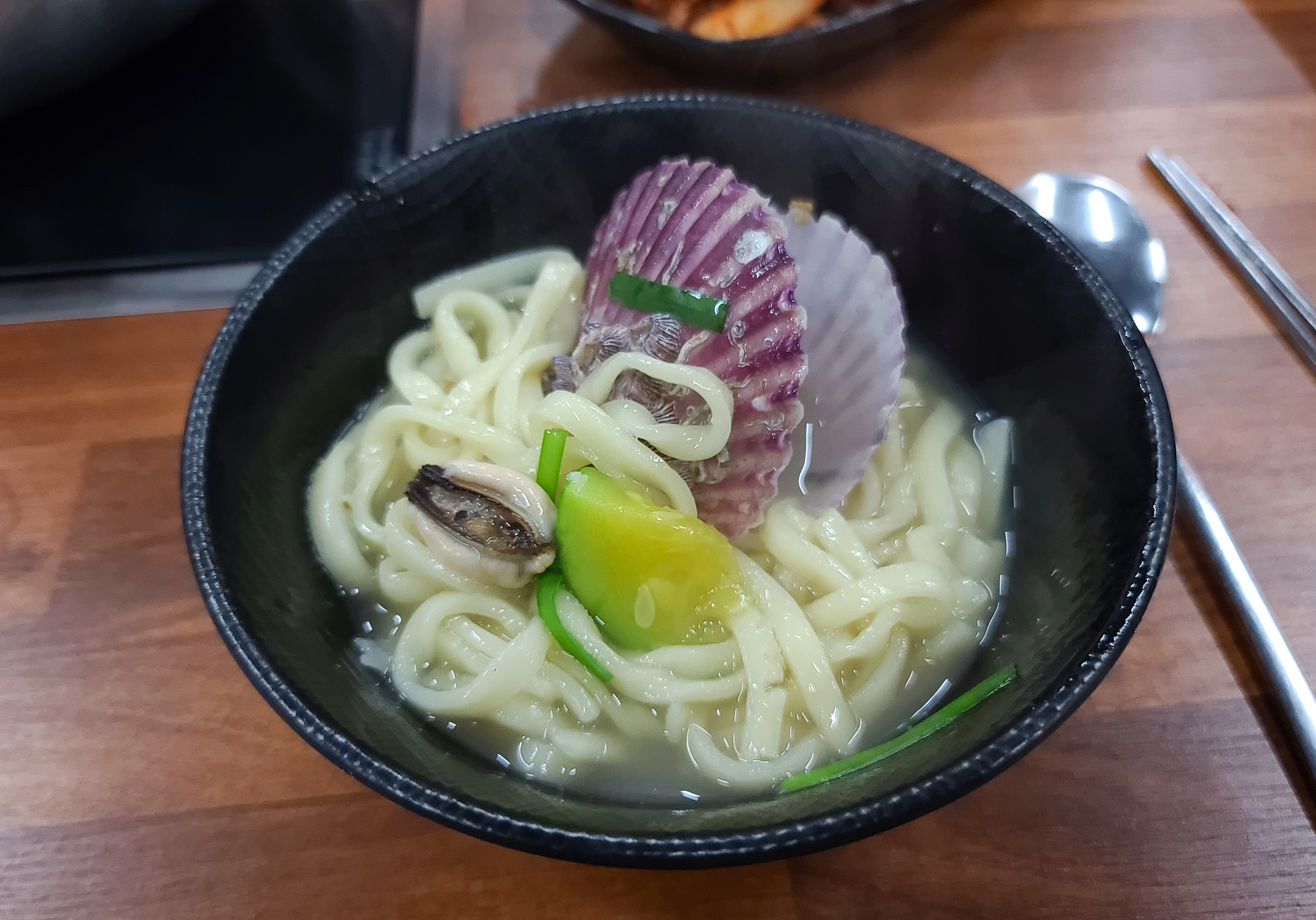 칼국수의 모습도 같이 보시죠. 해물이 들어간 칼국수인데, 홍합, 바지락, 가리비 등이 들어가 국물 맛이 좋았고, 마늘양념이랑 고추를 많이 넣어 칼칼한 맛이 일품이었습니다. 아무래도 청주 '너구리' 호프집, 청주 '오뚜기' 실내포차 등을 운영하며 술과 함께 곁들이는 메뉴를 주로 판매하시다 보니, 제 개인적인 생각인데 칼국수이지만 주류와 잘 어울리는 메뉴 같다는 생각이 들더라고요.