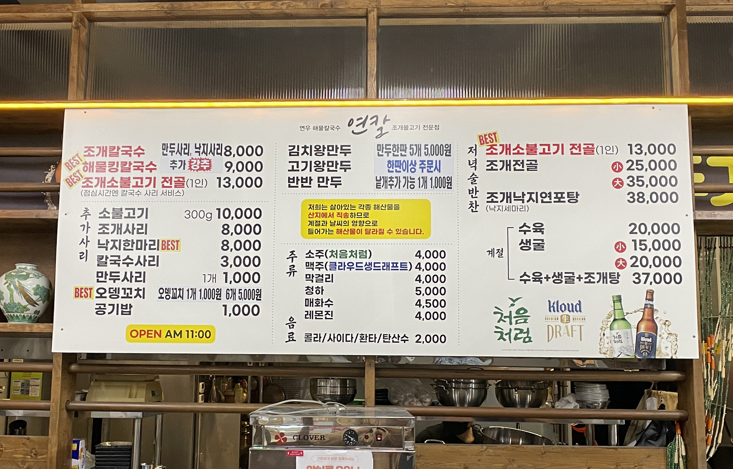 청주 연우해물칼국수의 메뉴는 이렇습니다. 조개칼국수, 해물킹칼국수, 조개소불고기전골, 김치왕만두, 고기왕만두, 반반만두, 조개소불고기전골, 조개전골, 조개낙지연포탕 등이 있었습니다.