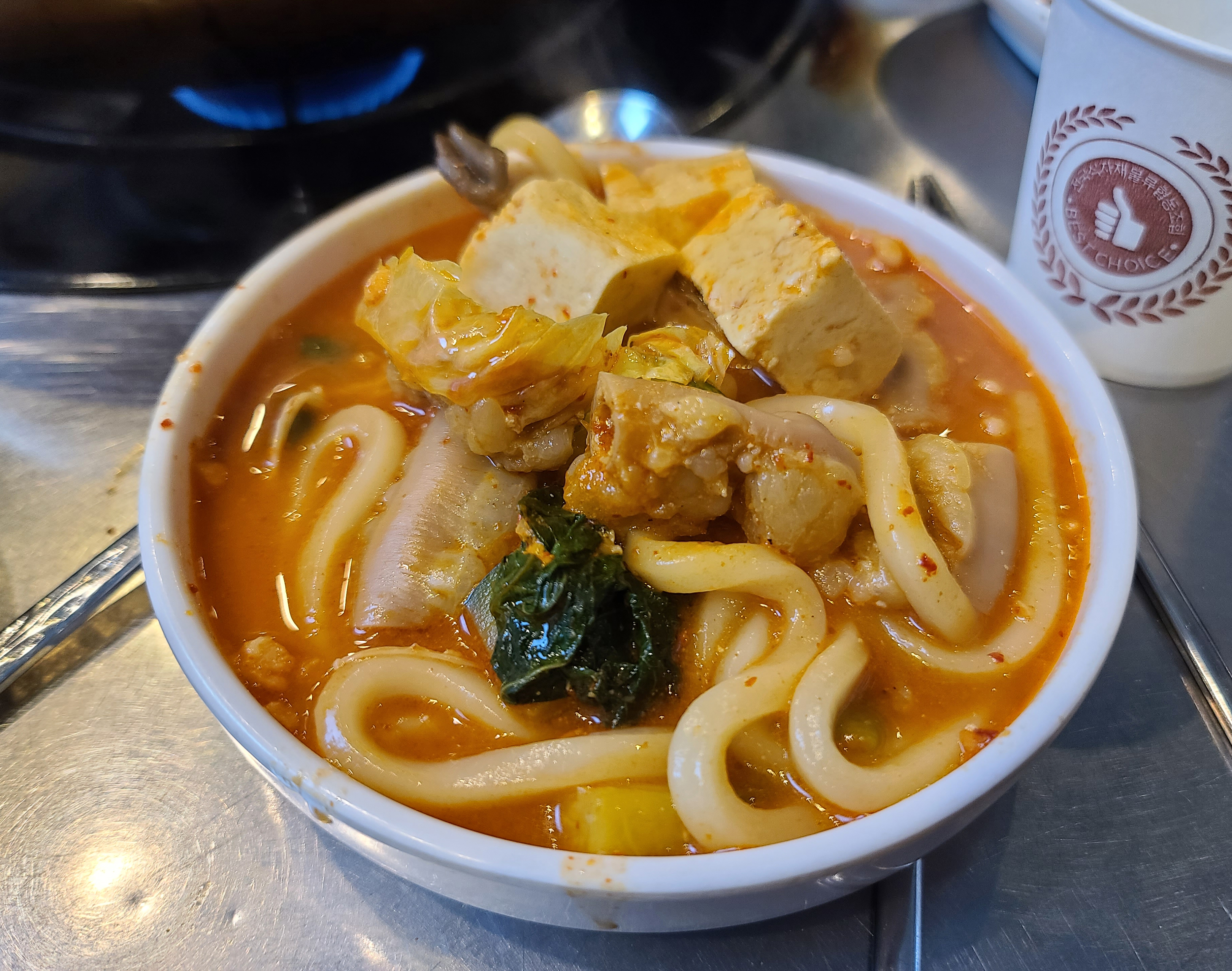 미미곱창의 곱창전골은 호박이랑, 고추, 두부, 버섯, 대파 등 다양한 재료들이 푸짐하게 들어가 있어서 제법 양이 많았습니다. 물론 가격이 55,000원이기 때문에 적잖은 금액이 들어가 양이 많은 것일 수도 있지만, 30분 안에 먹기에는 약간 부담감이 있었습니다. 저희는 가게 직원의 안내에 따라서 우동면을 따로 넣어서 먹었습니다.
