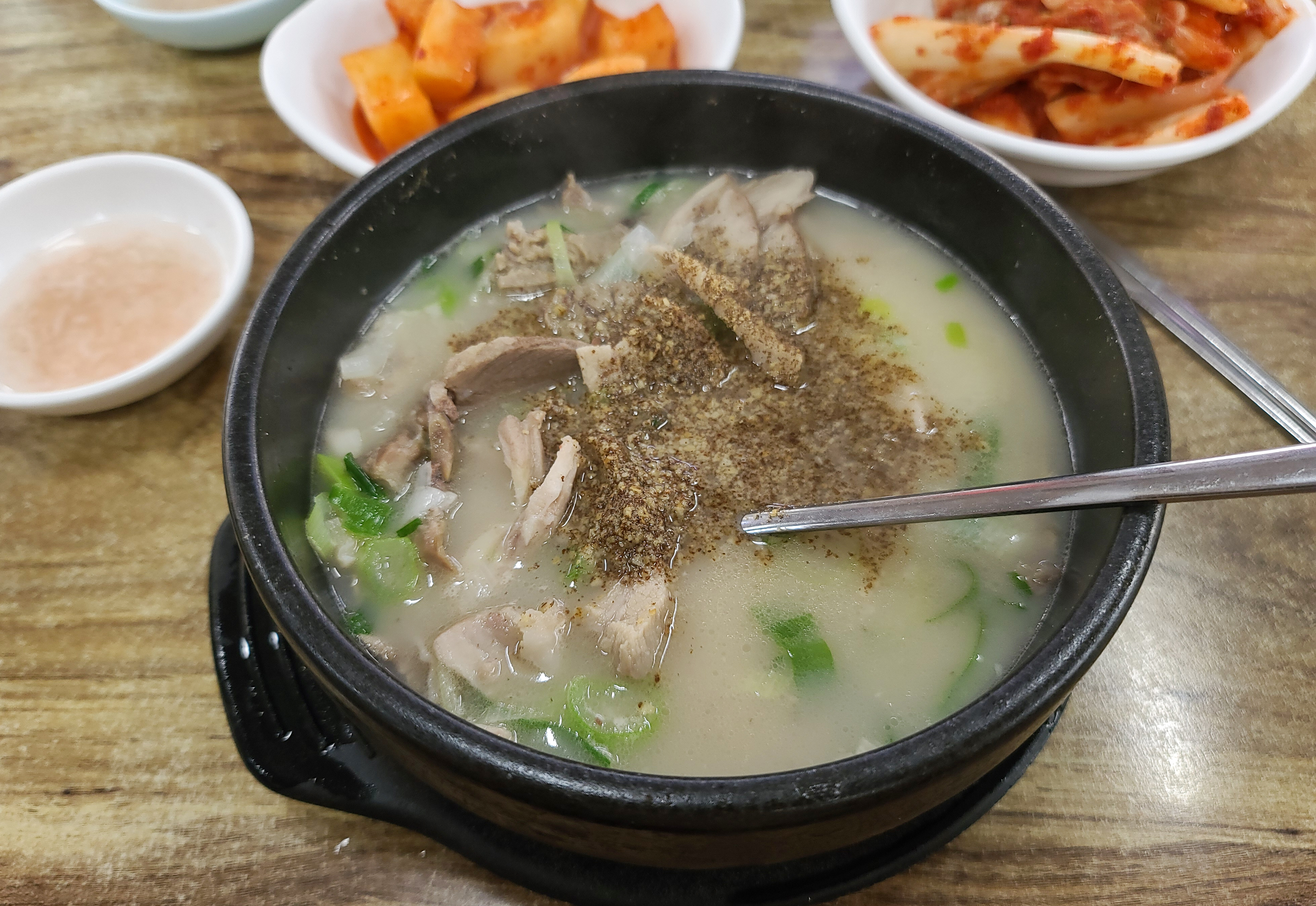 들깻가루도 얹고 순대국을 먹었습니다. 저는 살고기 순대국이라는 이름만 듣고 착각해서 순대국에 순대빼고 고기만 주는 줄 알았는데, 순대국 안에는 순대 5~6개 정도가 들어가 있었습니다. 저는 개인적으로 순대를 먹지 않기 때문에 따로 건져낸 다음 고기만 먹었습니다.