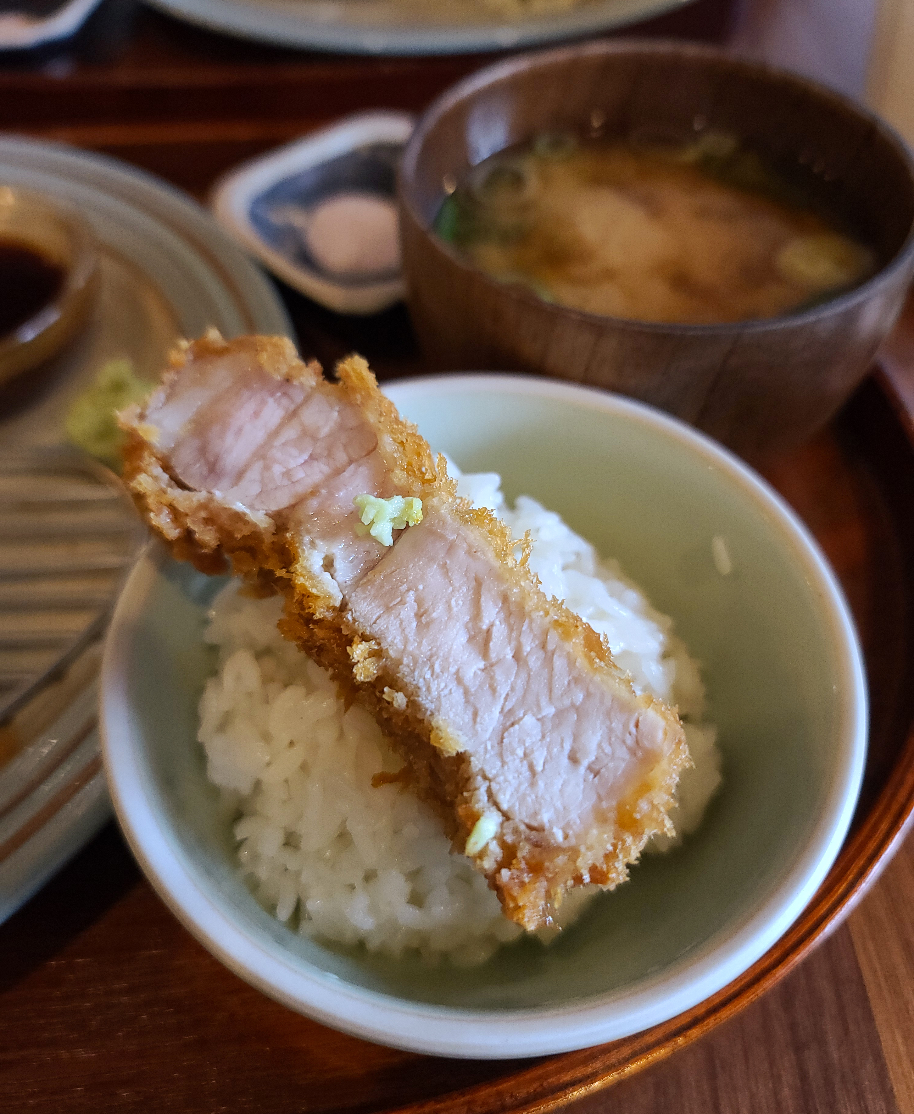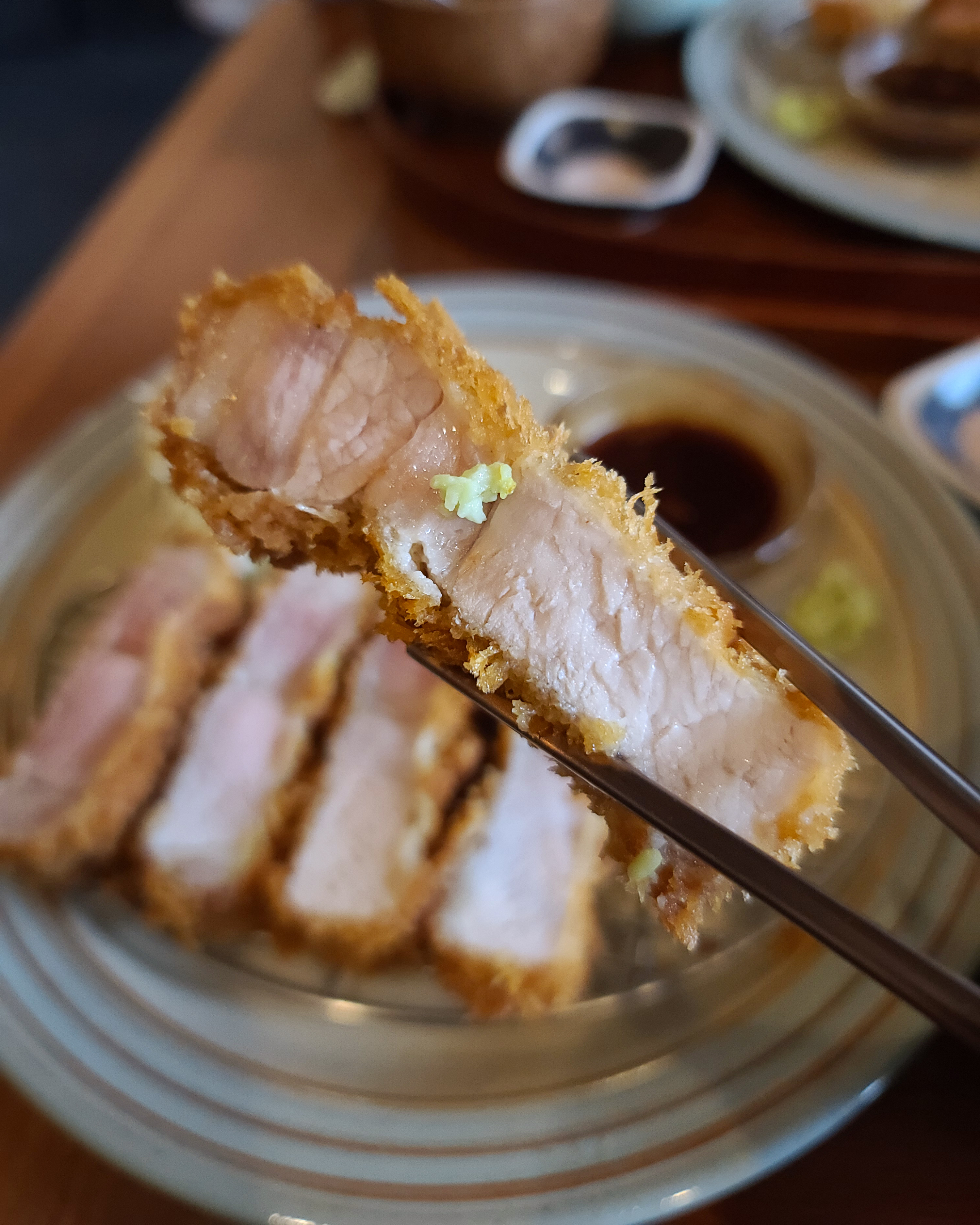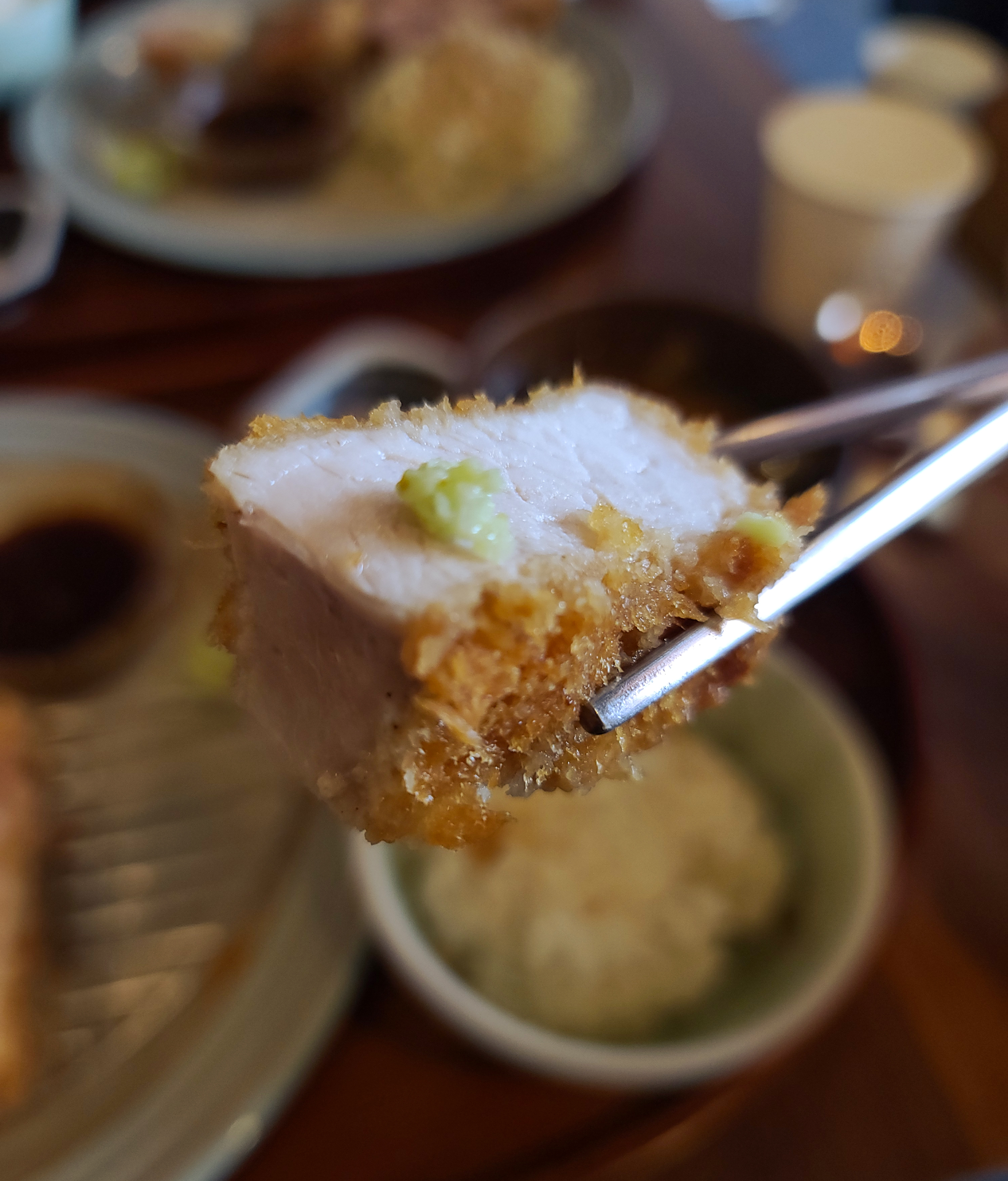 상로스카츠는 부드러운 식감과 단단한 식감을 동시에 느낄 수 있어서 좋았고, 다만 비계가 포함된 부위라 느끼할 수도 있다는 게 특징인 부위였습니다. 느끼한 맛을 잡기 위해 상로스카츠에 생와사비를 조금씩만 곁들여서 먹으면 괜찮았습니다. 13,000원에 돈까스 5조각이라 아껴먹게 되더라고요.