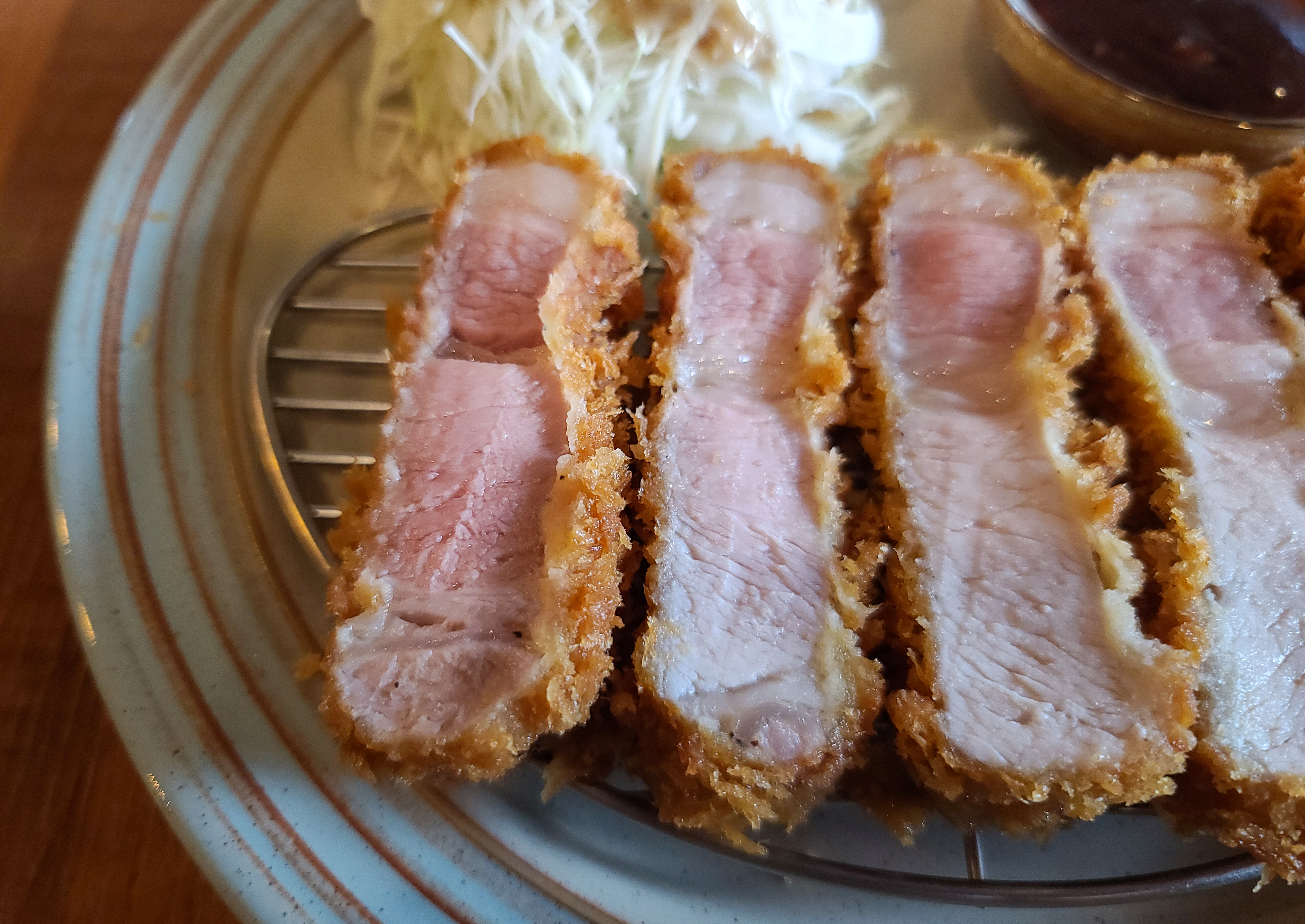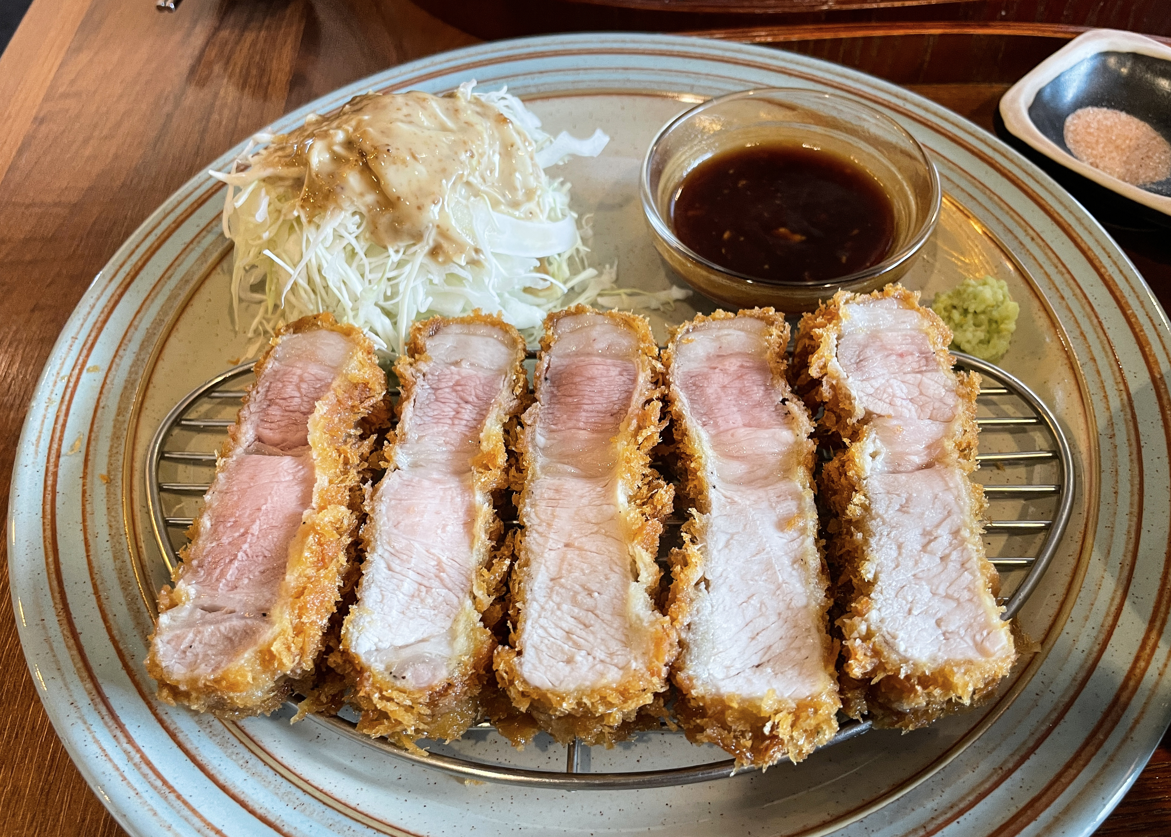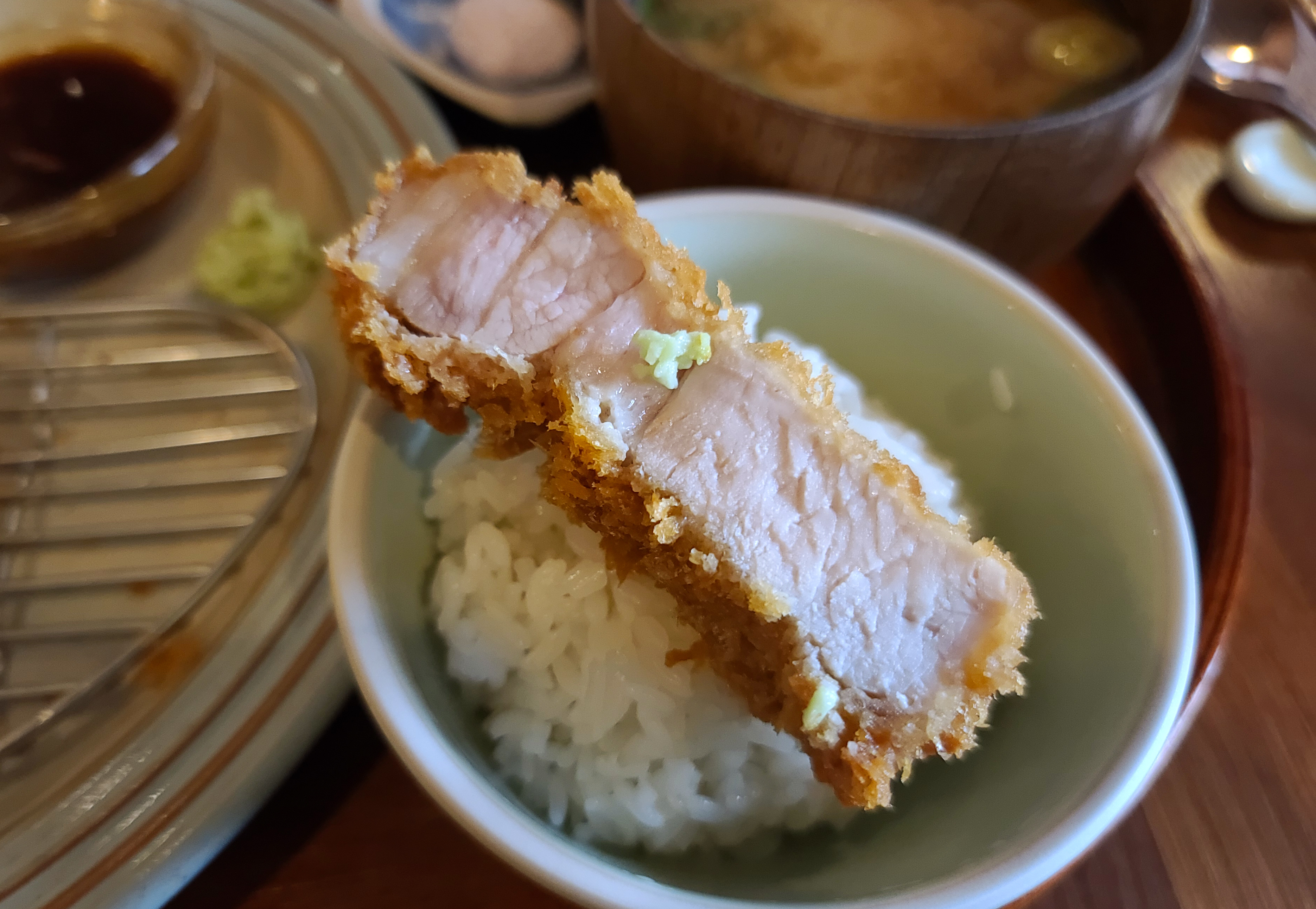 상로스카츠는 위 사진과 같이 등심과 가브리살이 붙어있는 모습이었고, 밀도 있는 등심의 식감과 부드러운 가브리살과 비계가 함께 있어 여러 가지 식감과 고소한 풍미를 동시에 느낄 수 있다는 게 특징이었습니다. 상로스카츠는 돈까스소스와 먹어도 좋지만 생와사비나 소금약간하고 곁들여 먹는것이 맛있었고, 한정된 수량에 한정된 양만 판매하는 만큼 양으로는 만족감을 얻기 힘들었습니다.