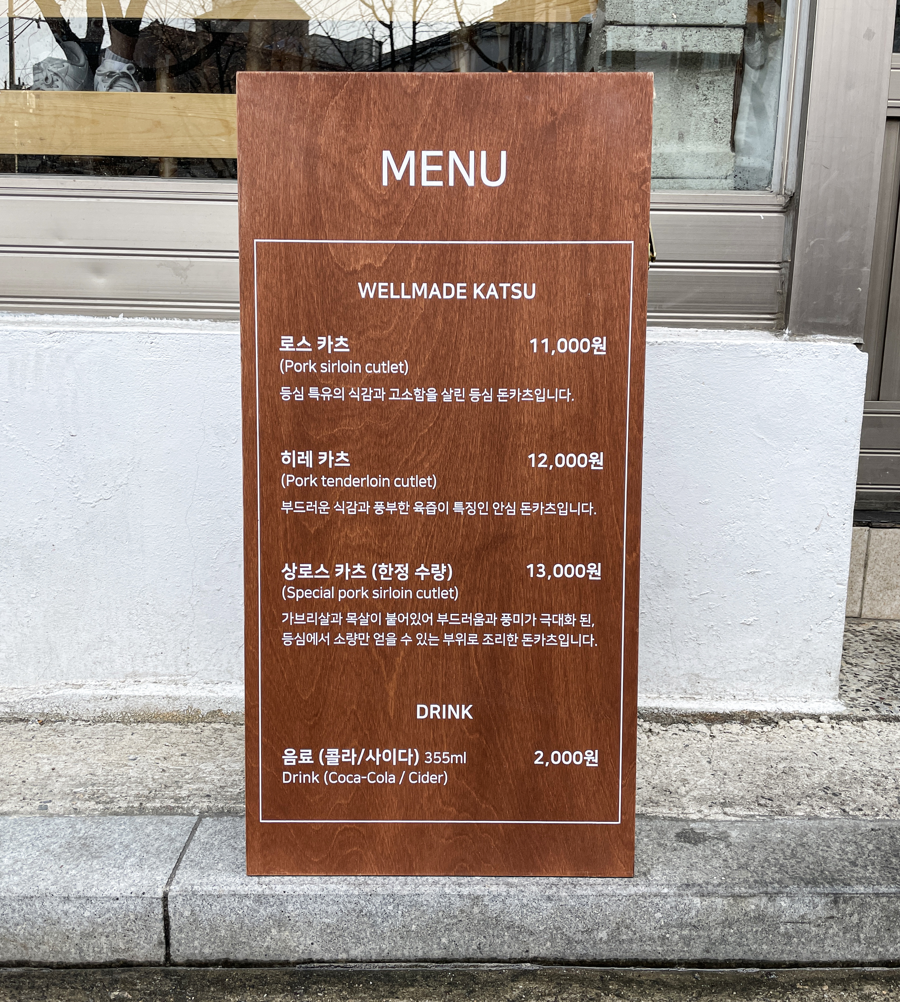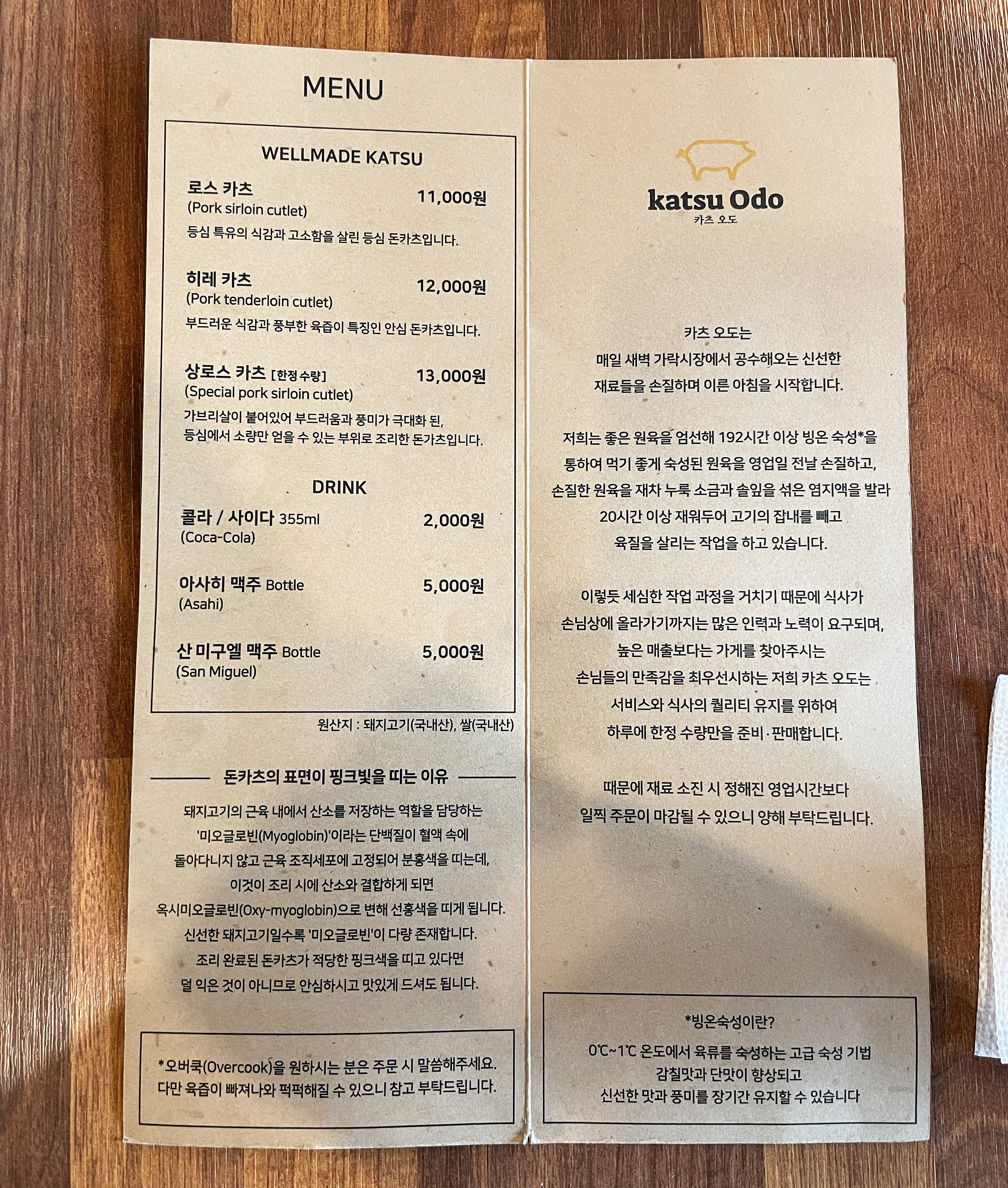 카츠오도의 메뉴를 함께 살펴보시죠. 카츠오도는 돈카츠(돈까스) 메뉴만 전문으로 판매하고 있었으며, 로스카츠, 히레카츠, 상로스카츠 이렇게 3가지 메뉴로 판매하고 있었습니다. 카츠오도만의 빙온숙성과정과 염지를 통해 만들어진 메뉴를 판매하다 보니, 상로스카츠 말고 다른 메뉴들도 금세 소진되곤 하더라고요.