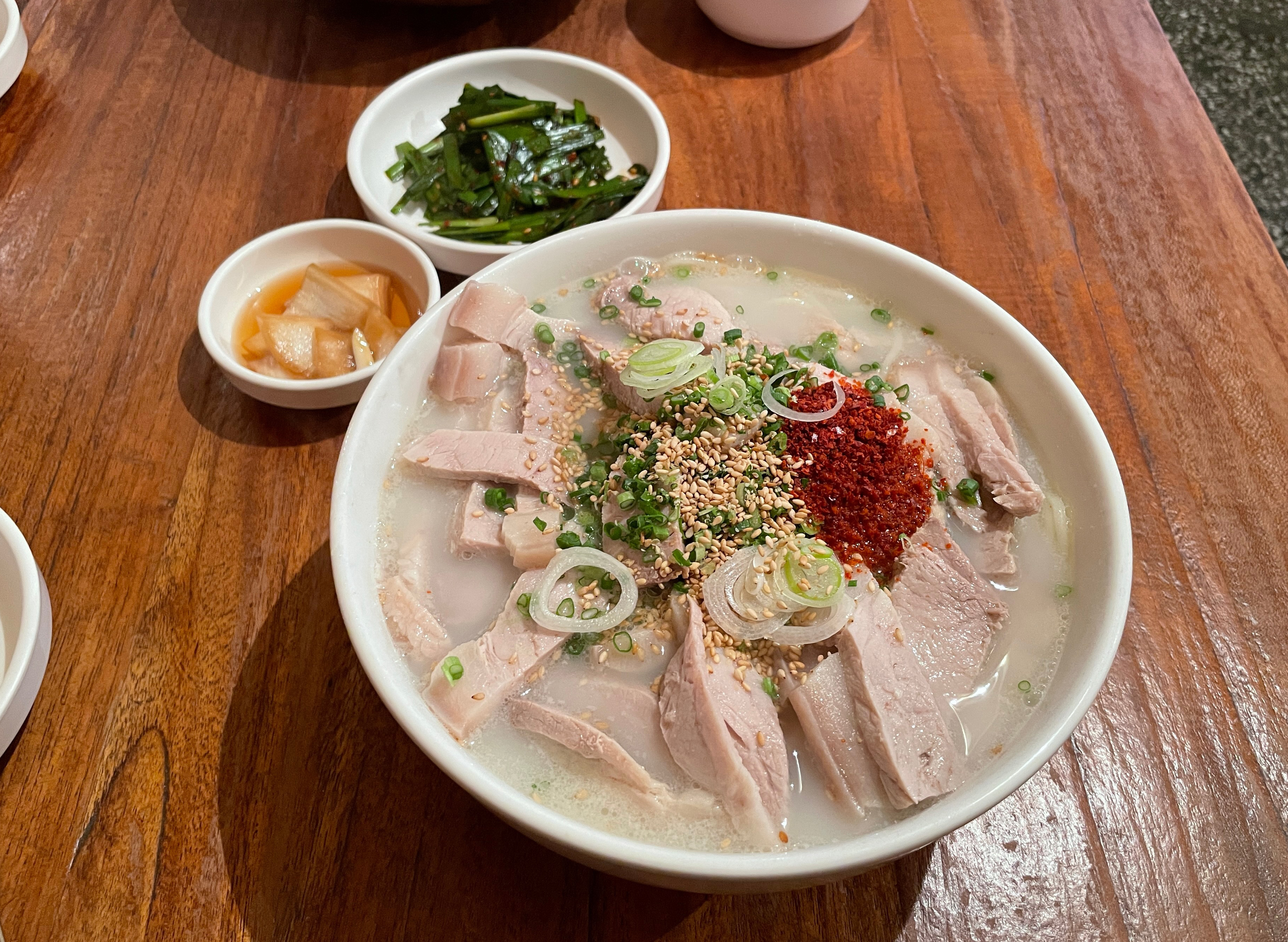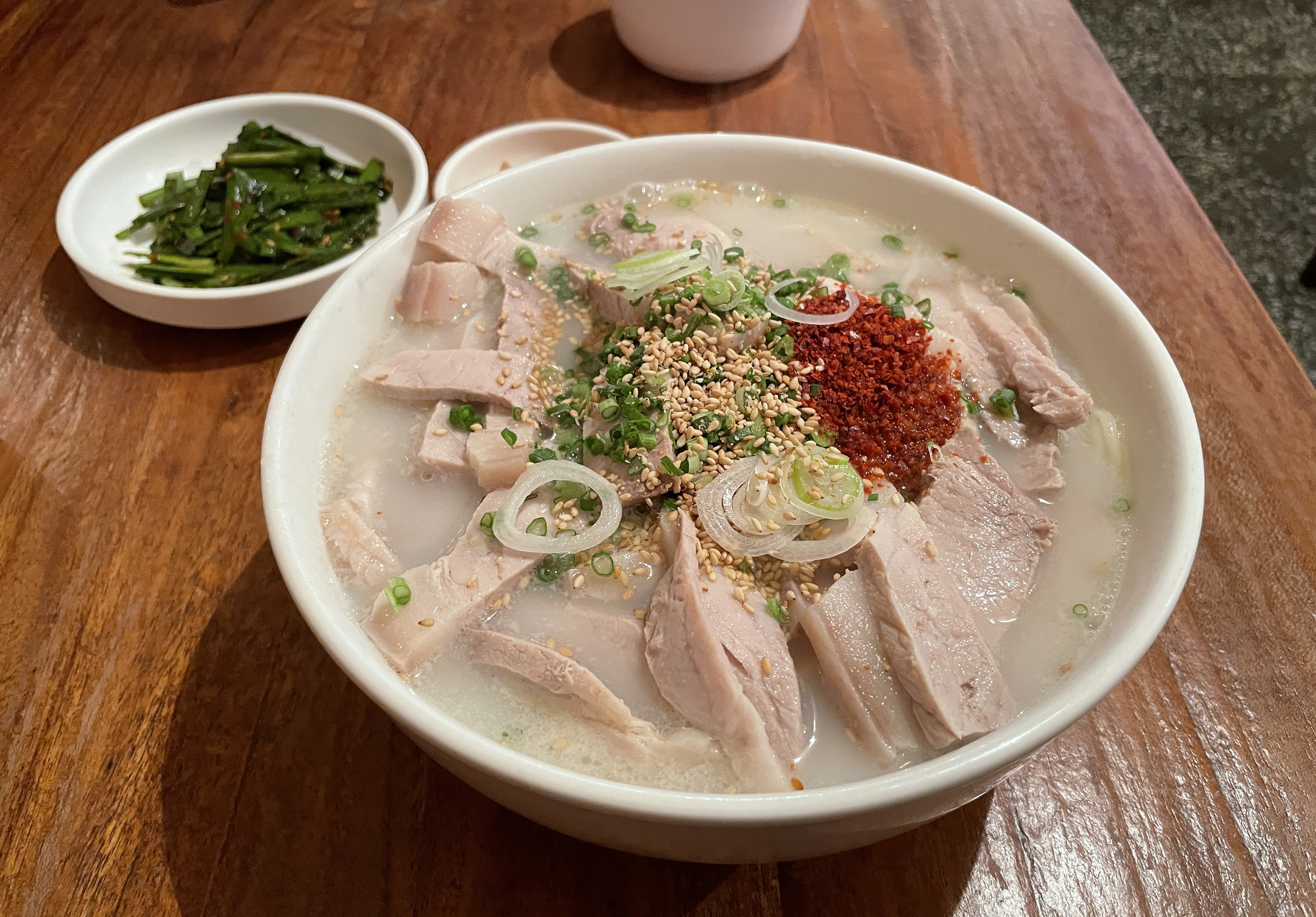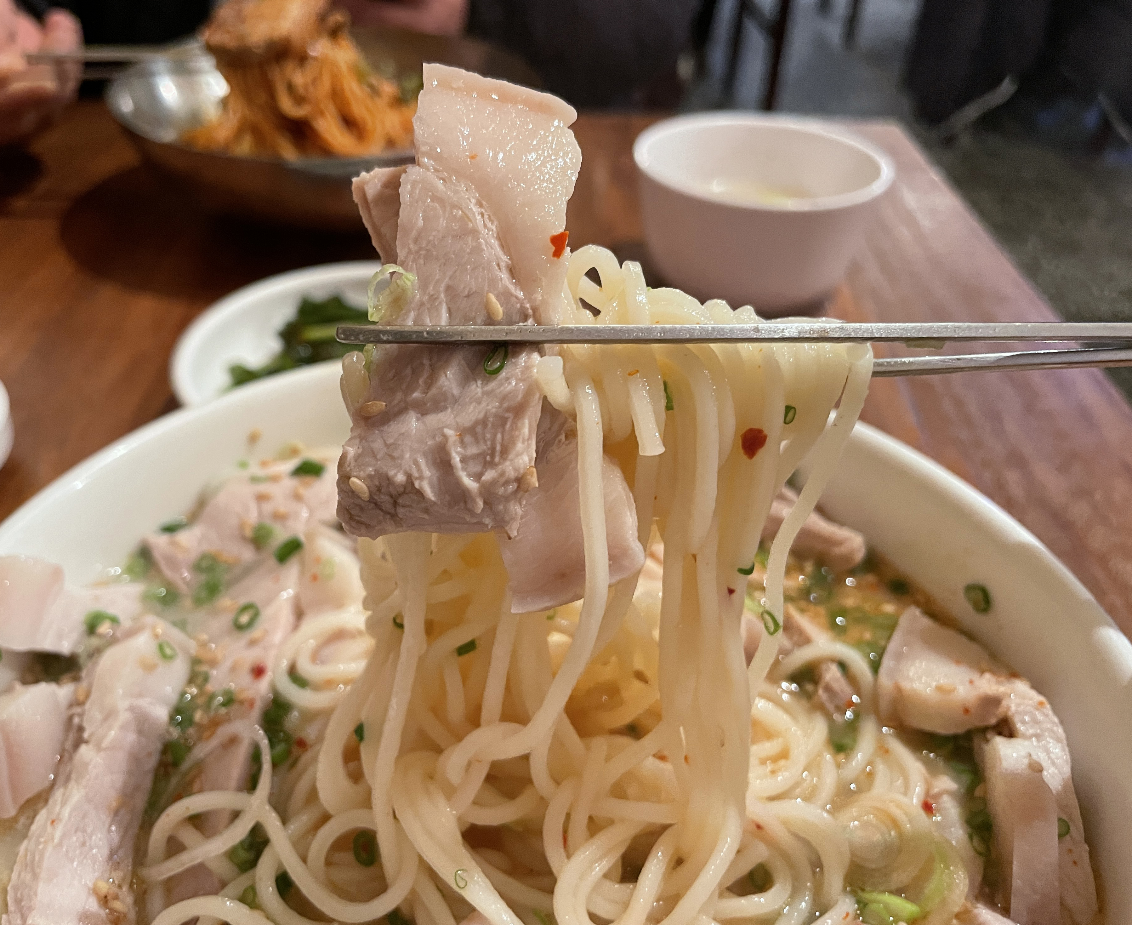 고기는 적당한 탄력이 있었는데, 제주도에서 먹었던 고기국수 돔베고기처럼 약간 뻣뻣한 느낌이 있었습니다. 그래도 국물에 담겨있던 고기라 수분이 있었고, 고기는 잡내 없이 잘 삶아져 맛있었습니다. 국수랑 고기랑 양이 워낙 많아서 그냥 기본 메뉴에 곱빼기로 달라고 주문할 걸 하는 후회가 살짝 들기도 하더라고요.