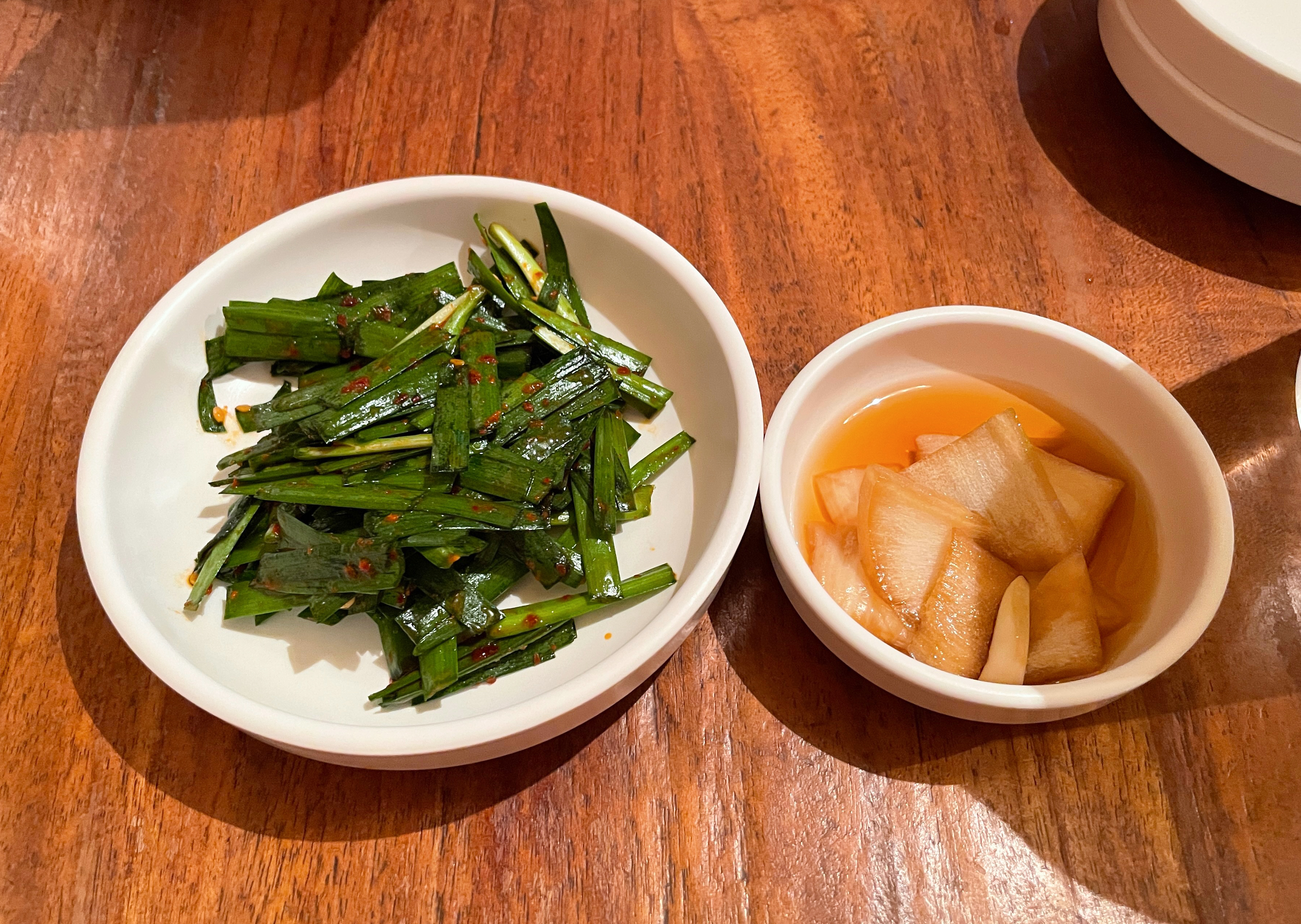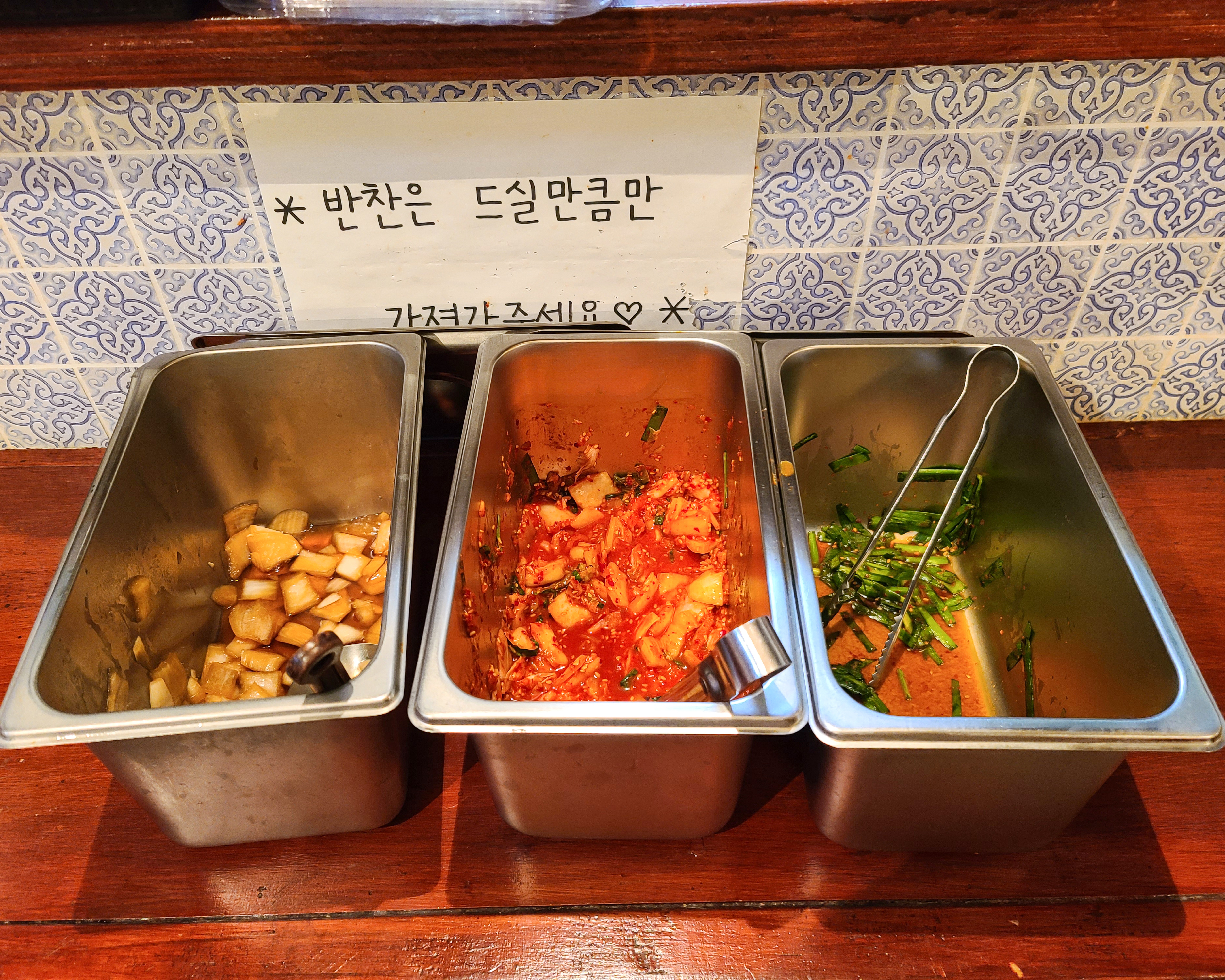 곧이어 주문한 특 자 고기국수와 비빔국수 그리고 반찬이 나왔습니다. 반찬은 부추무침과 양파장아찌가 있었고, 김치나 추가 반찬은 셀프코너에서 직접 가져가 먹을 수 있도록 되어있었습니다. 물론 처음 반찬은 직접 가져다주셔서 반찬을 직접 가져올 필요는 없었습니다.