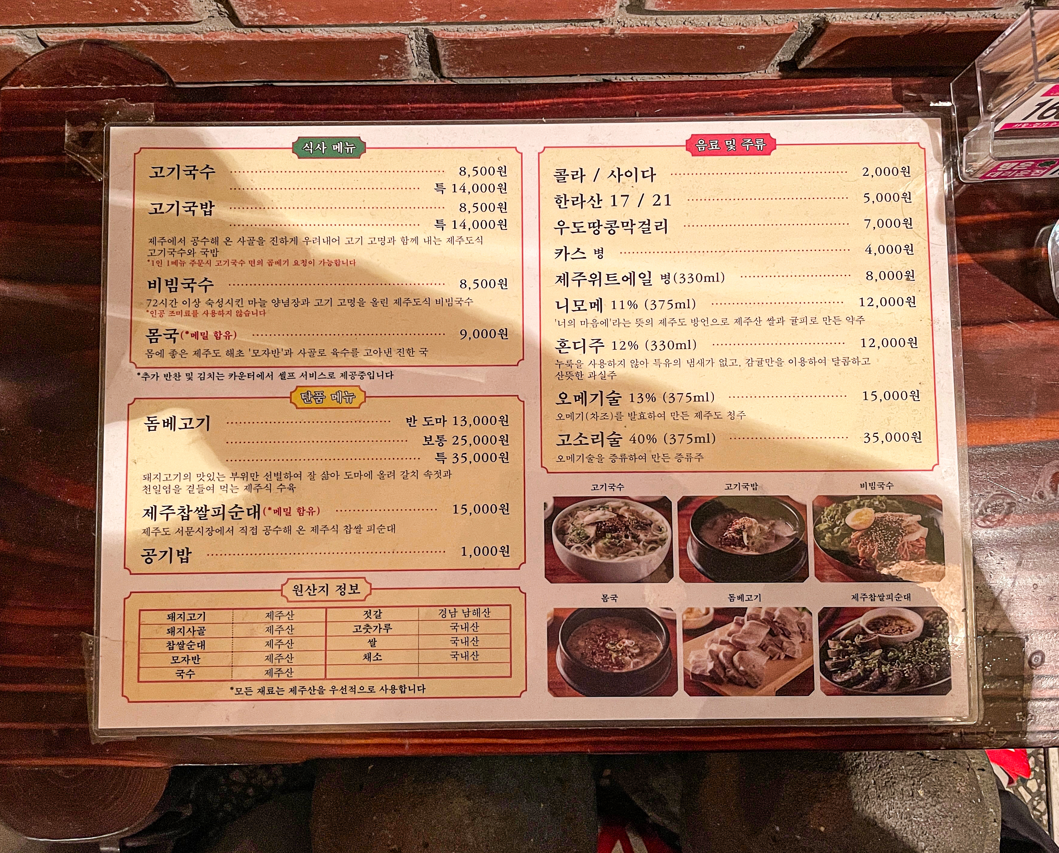 서울대입구 제주상회 메뉴판을 살펴보시죠. 고기국수, 고기국밥, 비빔국수, 몸국, 돔베고기, 제주찹쌀피순대가 있었습니다. 그밖에 제주산 소주인 한라산도 있었고, 제주 특산물인 우도땅콩막걸리, 니모메, 혼디주, 오메기술, 고소리술 등 제주지역 술도 판매하고 있었습니다. 메뉴는 식사 기준 8,500~ 14,000원 사이였습니다.