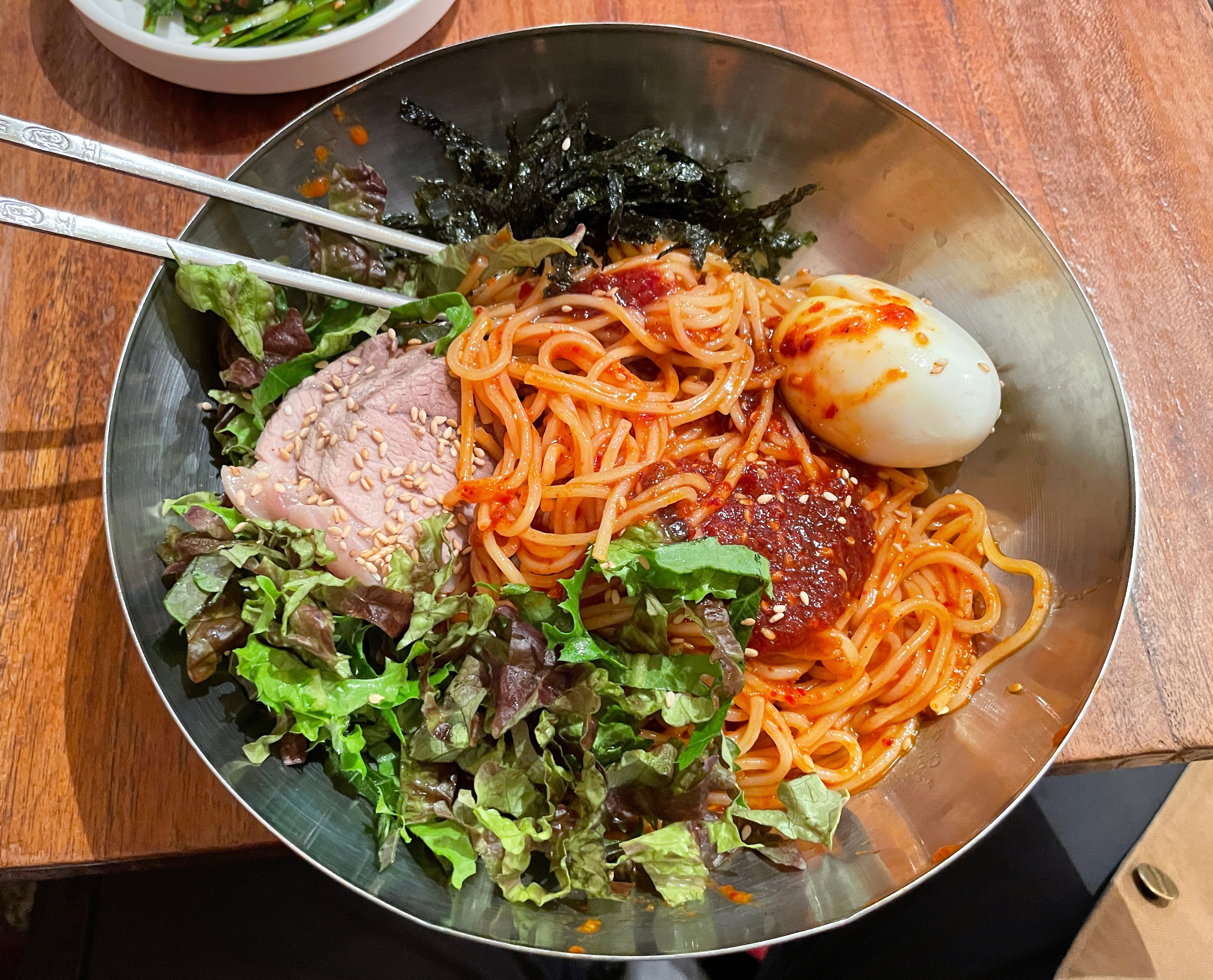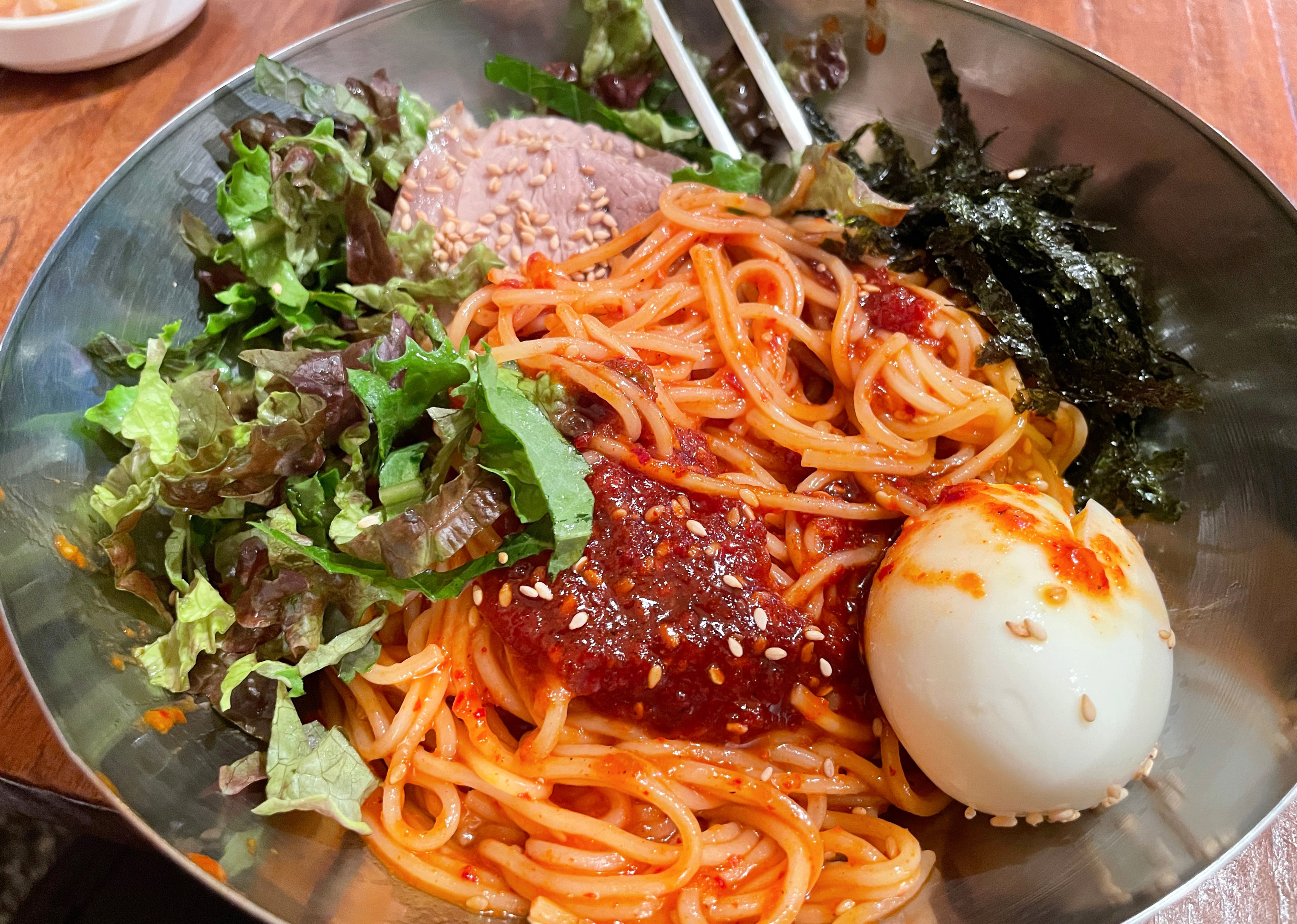 서울대입구 '제주상회'의 비빔국수부터 살펴보실까요? 새콤한 양념에 상추랑 김가루, 고기, 달걀이 올라간 메뉴였습니다. 살짝 맛을 보니 자극적이지 않으면서 입에 착 감기는듯한 양념이 맛있었고, 고기는 3조각 올라가 있었습니다. 넉넉히 먹고 싶다면 곱빼기로 달라고 하거나 특으로 주문도 가능했습니다.