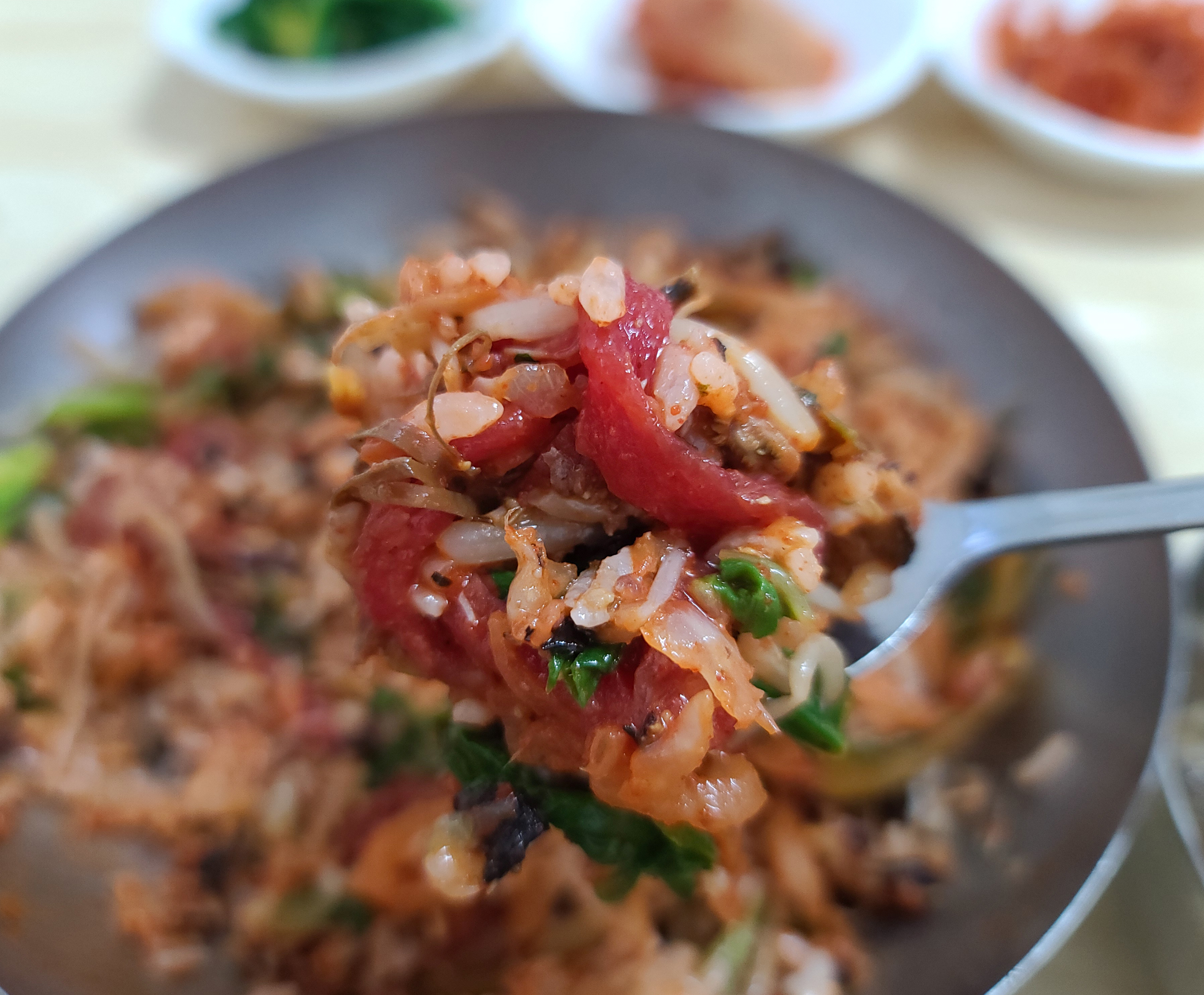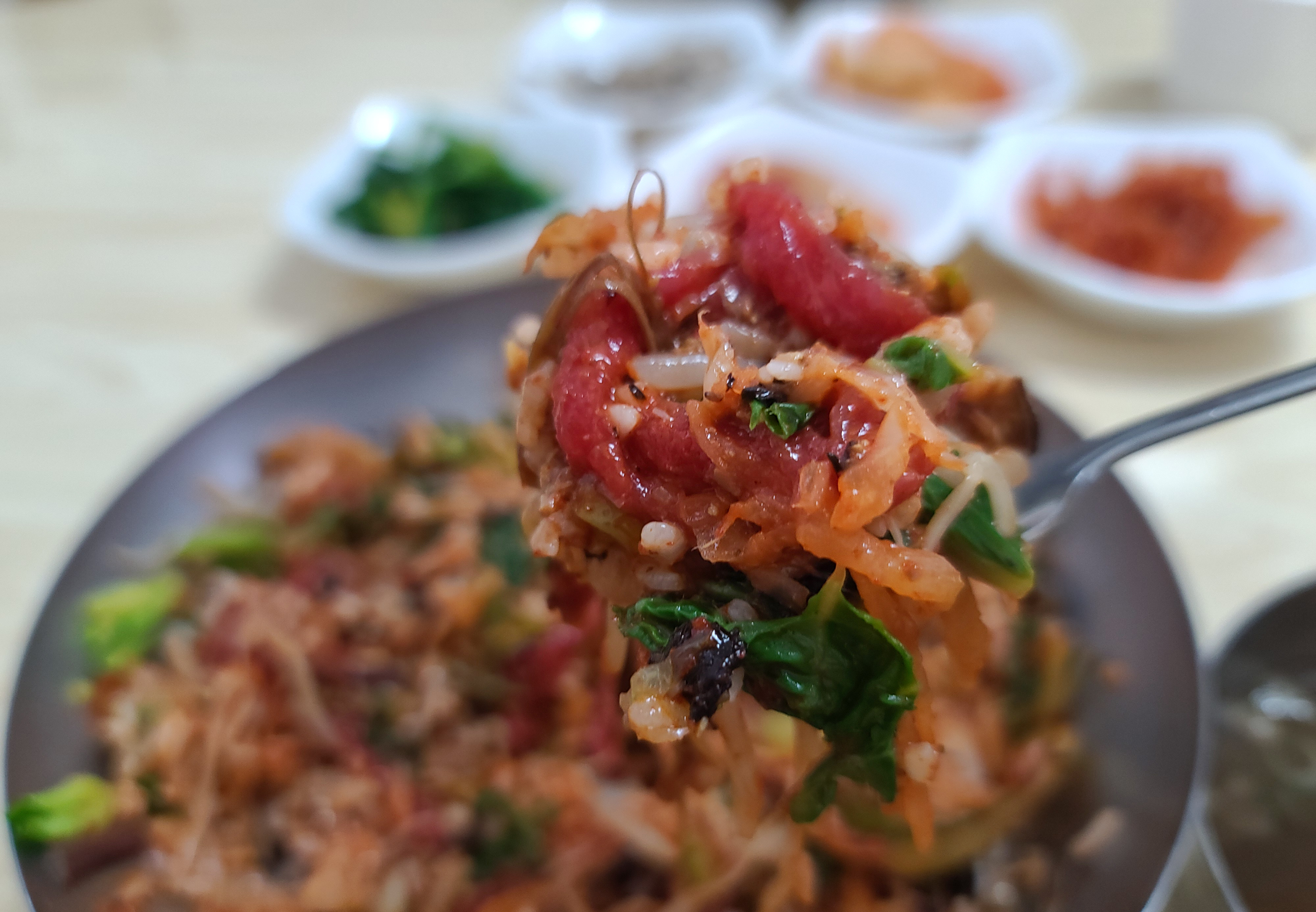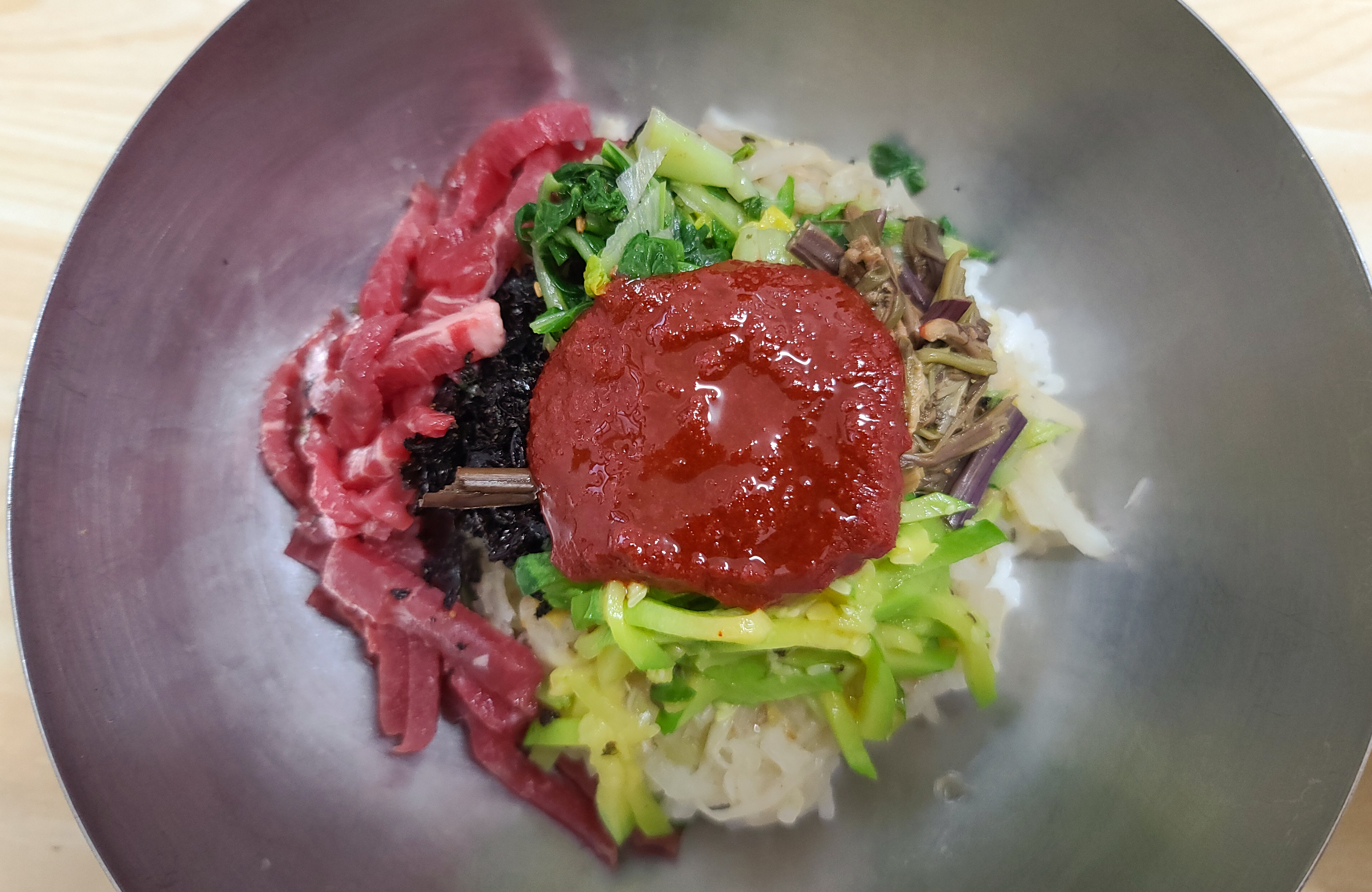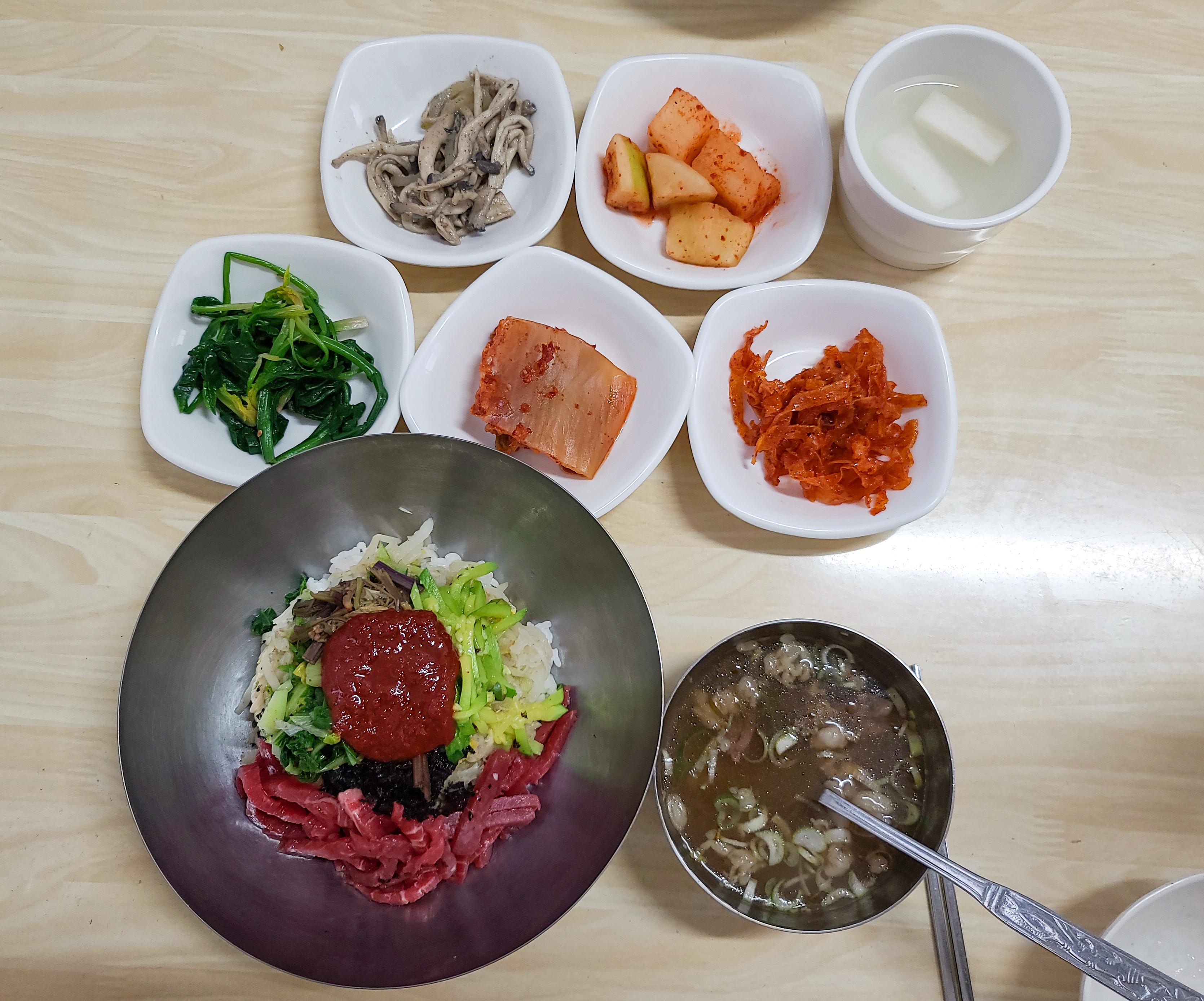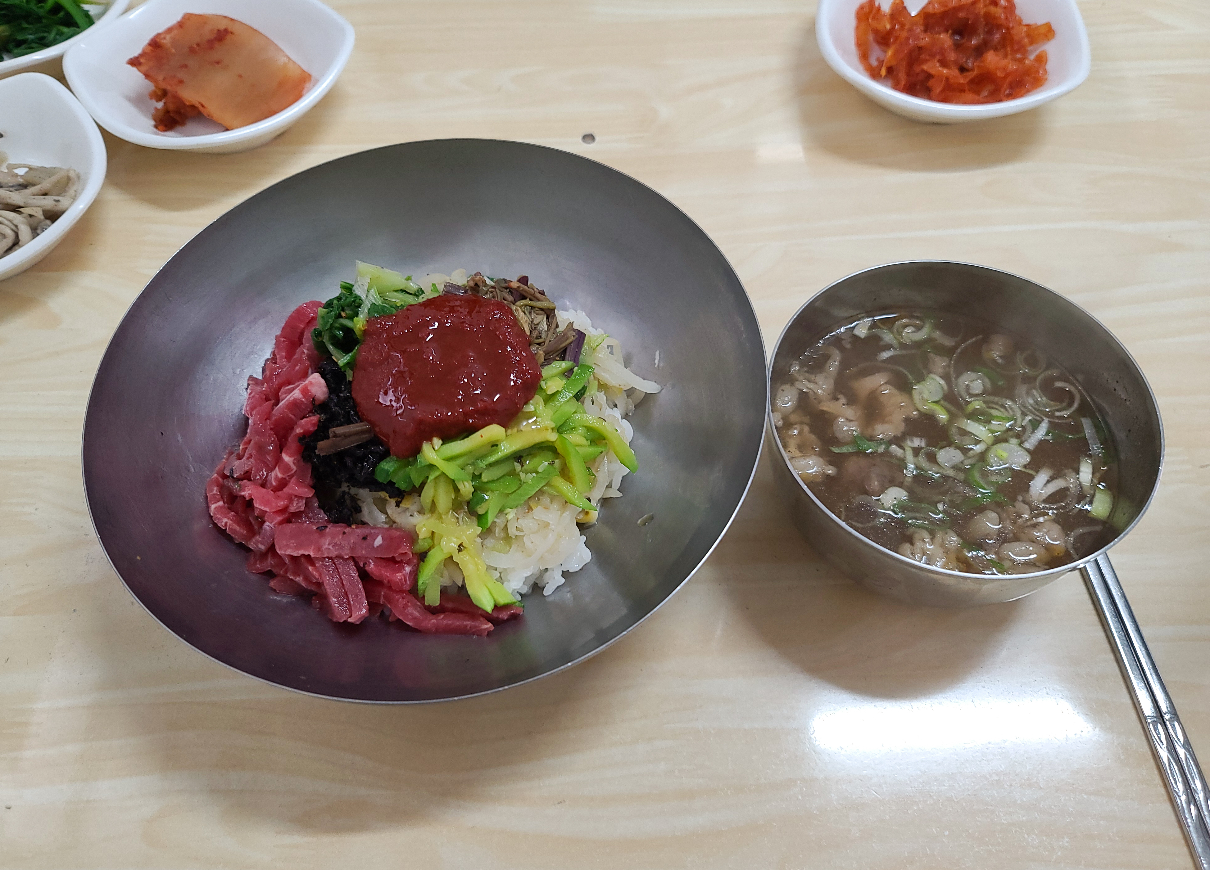 천황식당 모든 반찬과 함께 육회비빔밥의 모습도 사진으로 담아보았습니다. 육회비빔밥은 갓 썰어담은 신선한 소고기 육회와 호박, 고사리, 나물 등이 들어간 비빔밥이었습니다.