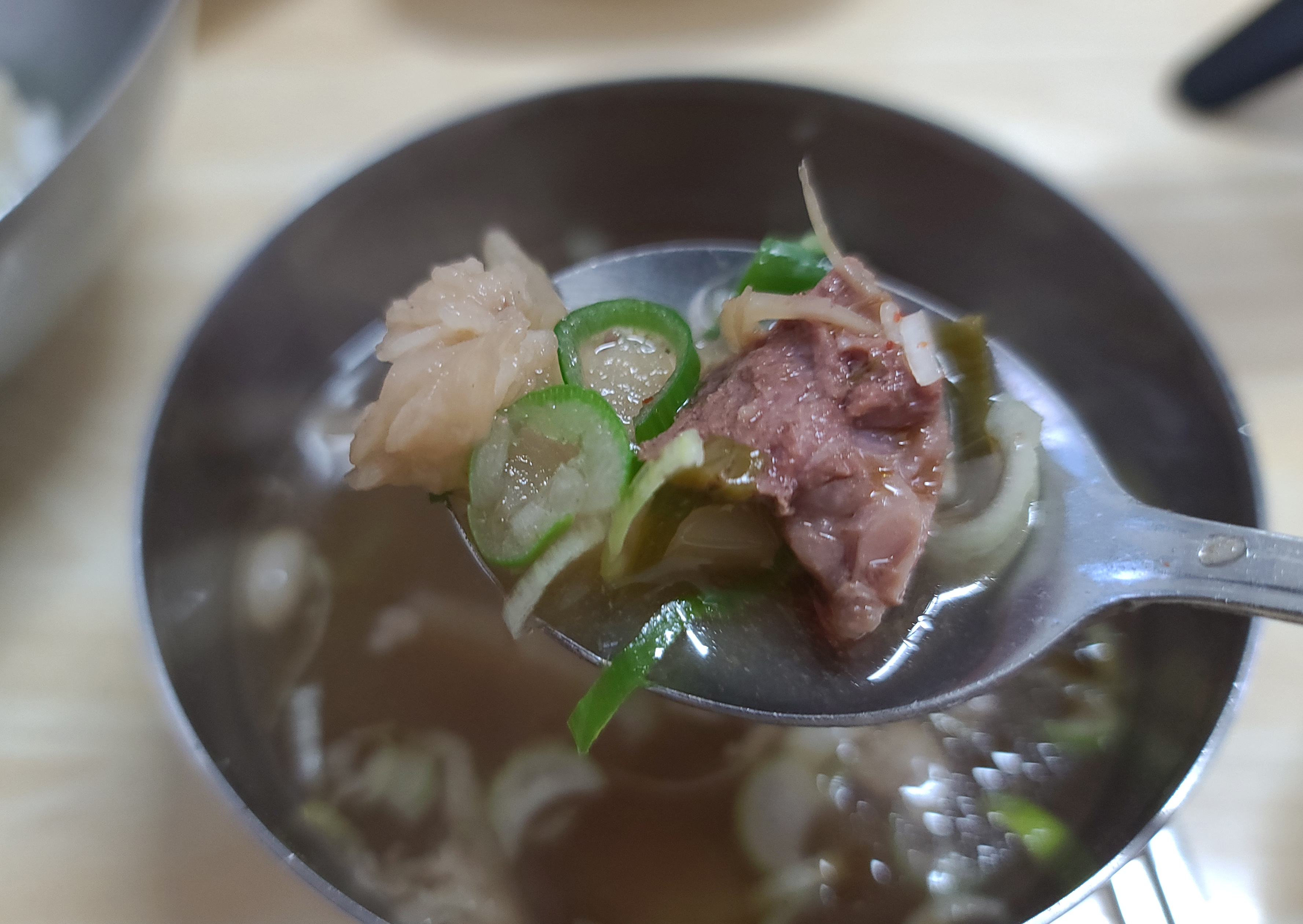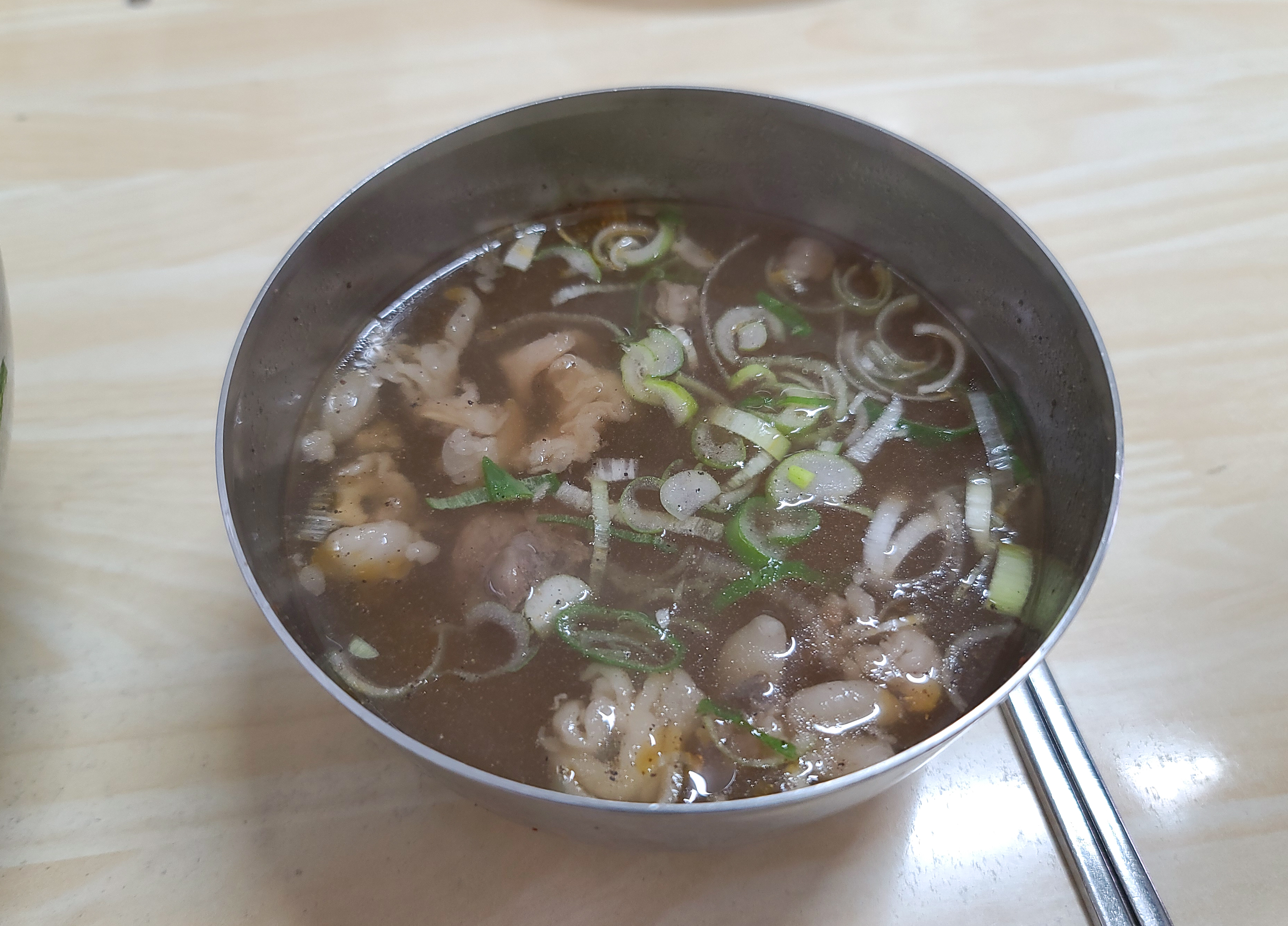 곧이어 진주 천황식당의 대표 메뉴 육회비빔밥과 소고깃국이 나왔습니다. 육회비빔밥과 같이 나온 메뉴인 소고깃국은 소고기와 채 썬 대파가 들어있었고, 소고기 뭇국과 비슷한 맛이었습니다.