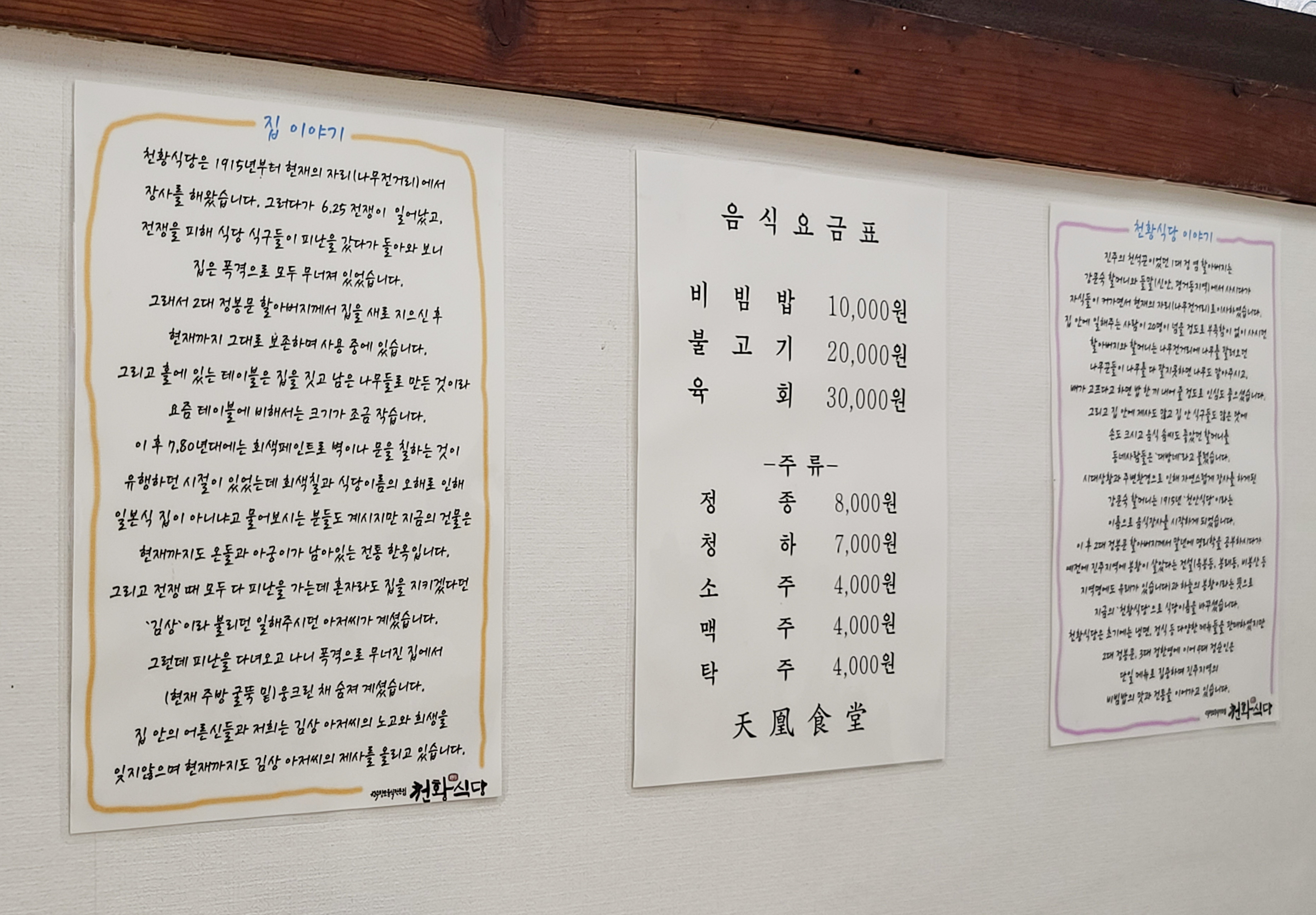 별채에 자리를 잡고 앉았습니다. 자리 옆에는 천황식당의 집과 가게에 대한 이야기가 메뉴판과 함께 붙어있었습니다. 진주 천황식당의 메뉴는 비빔밥, 불고기, 육회가 있었습니다. 저희는 천황식당의 대표 메뉴인 비빔밥을 주문하여 먹었습니다.