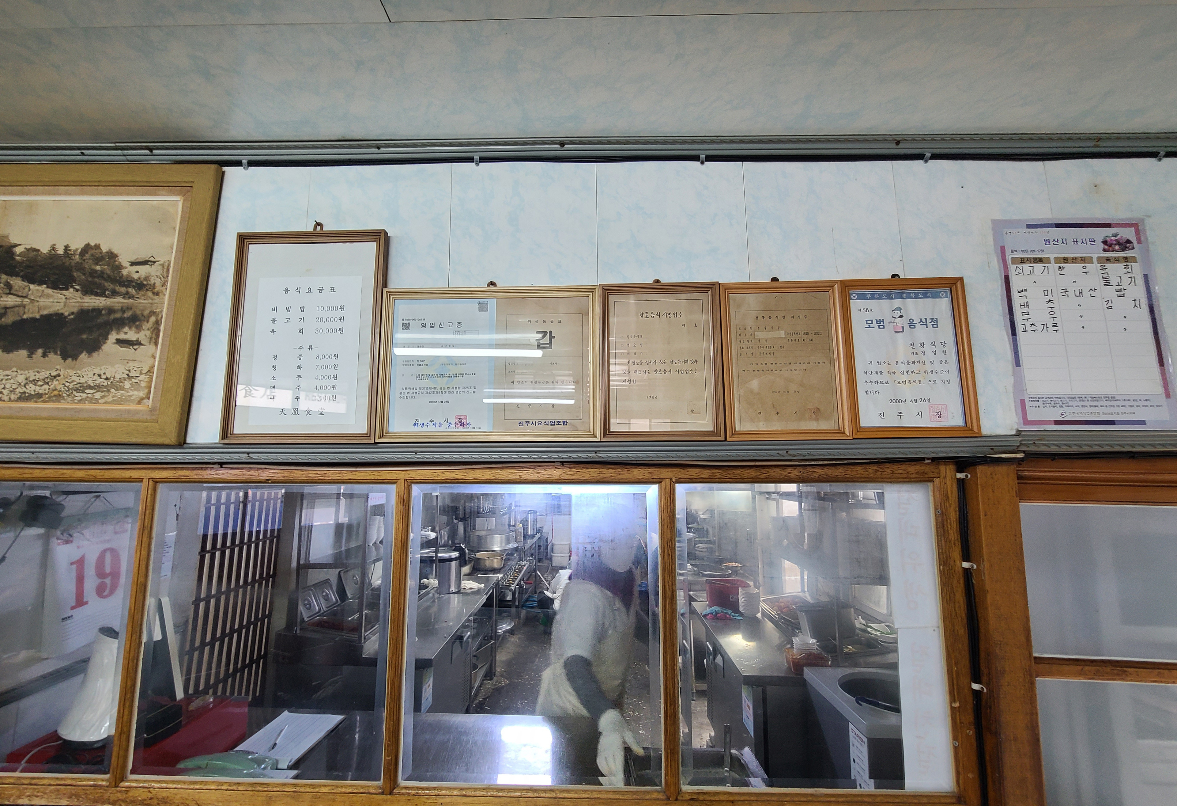 천황식당의 모습입니다. 오래된 한옥으로 된 실내에는 조그마한 테이블과 오래된 가게 집기류들이 보였고, 주방은 내부가 보이는 투명한 창으로 되어있었습니다. 저희는 별채에서 식사를 하였습니다.