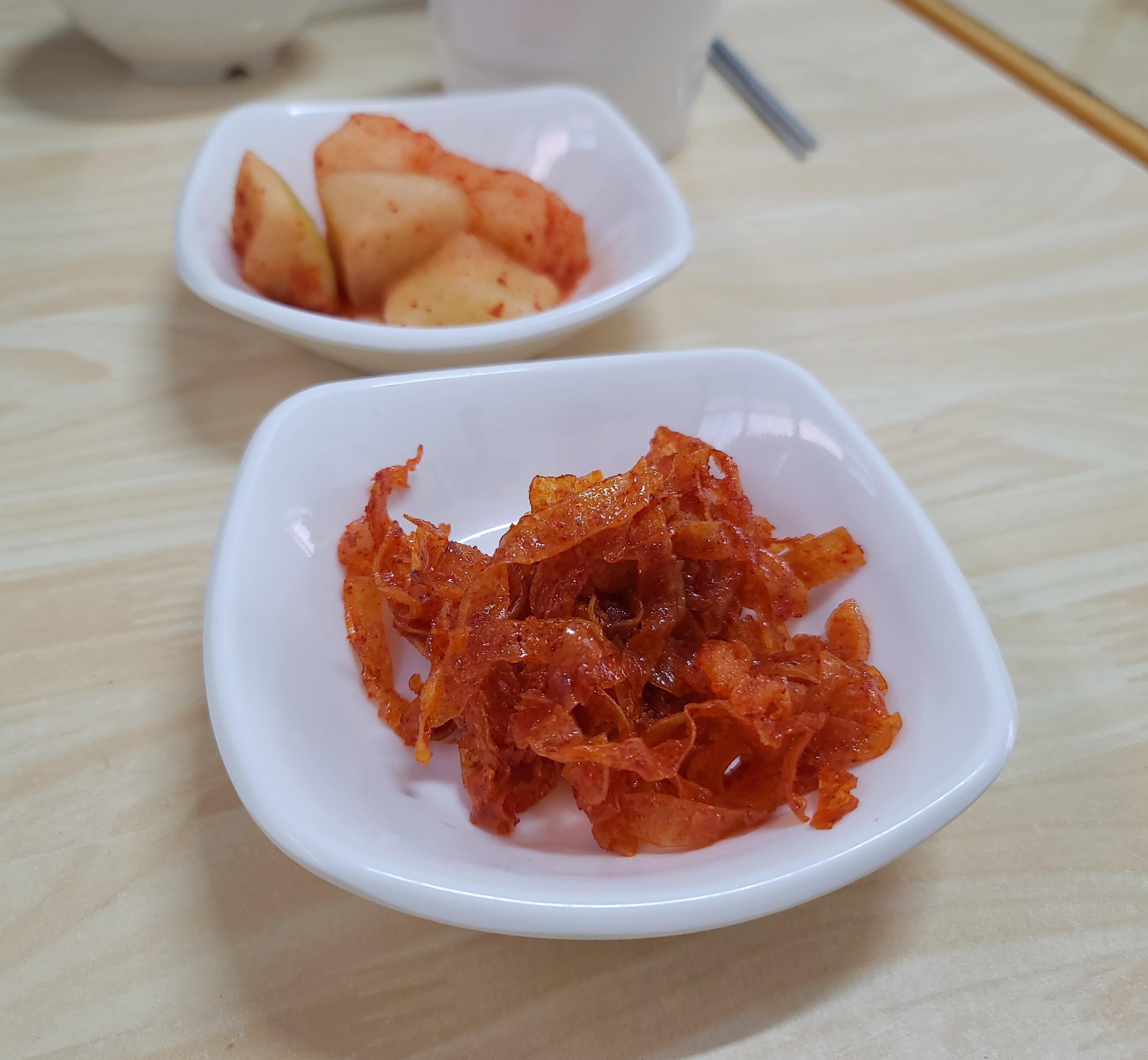반찬과 함께 타락죽(우유를 섞은 흰 죽)이 나왔습니다. 타락 죽은 씨리얼을 우유에 넣어 불려먹는 느낌이었고, 반찬들은 맛있었지만 김치는 제 입맛에 안 맞았습니다.