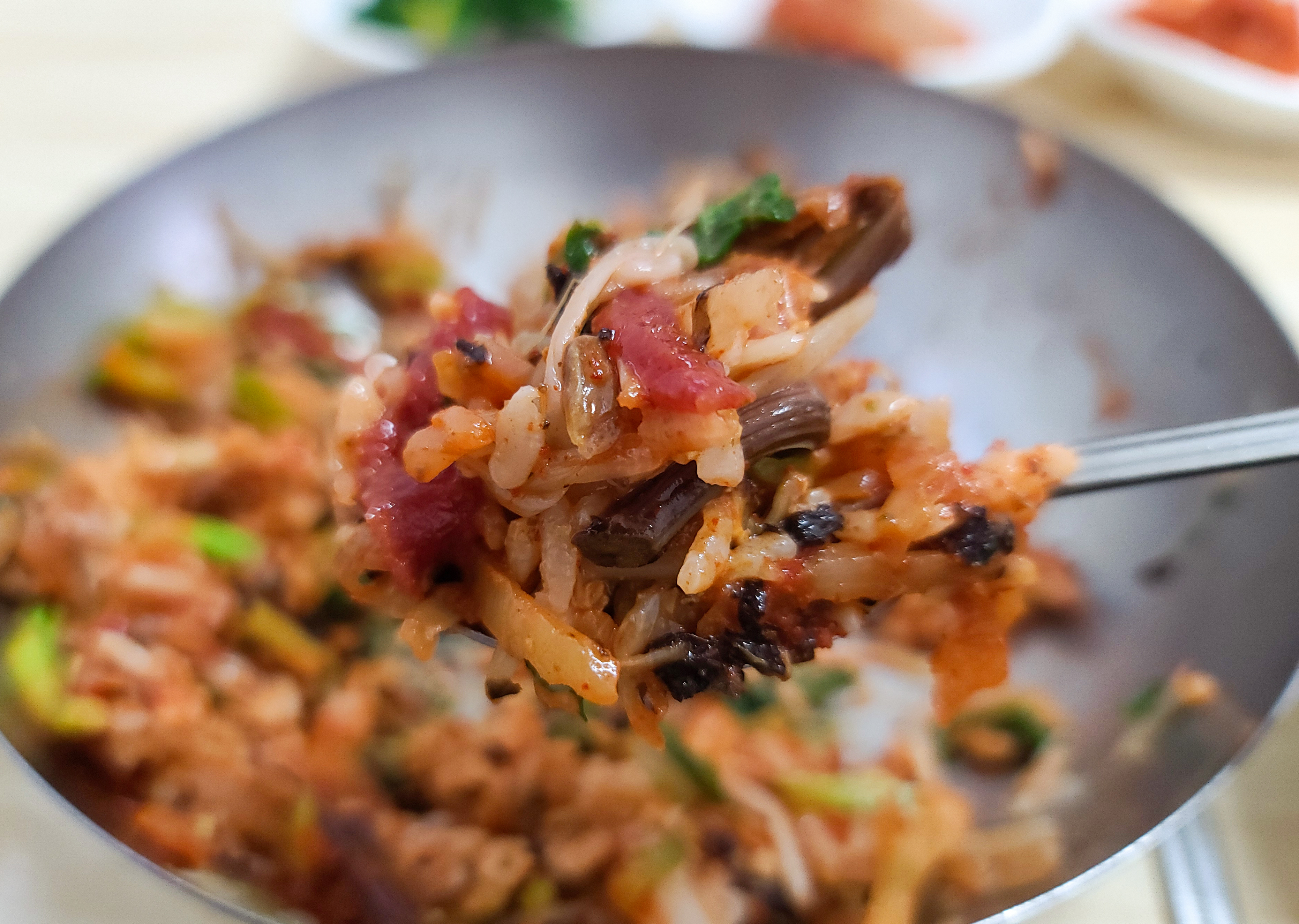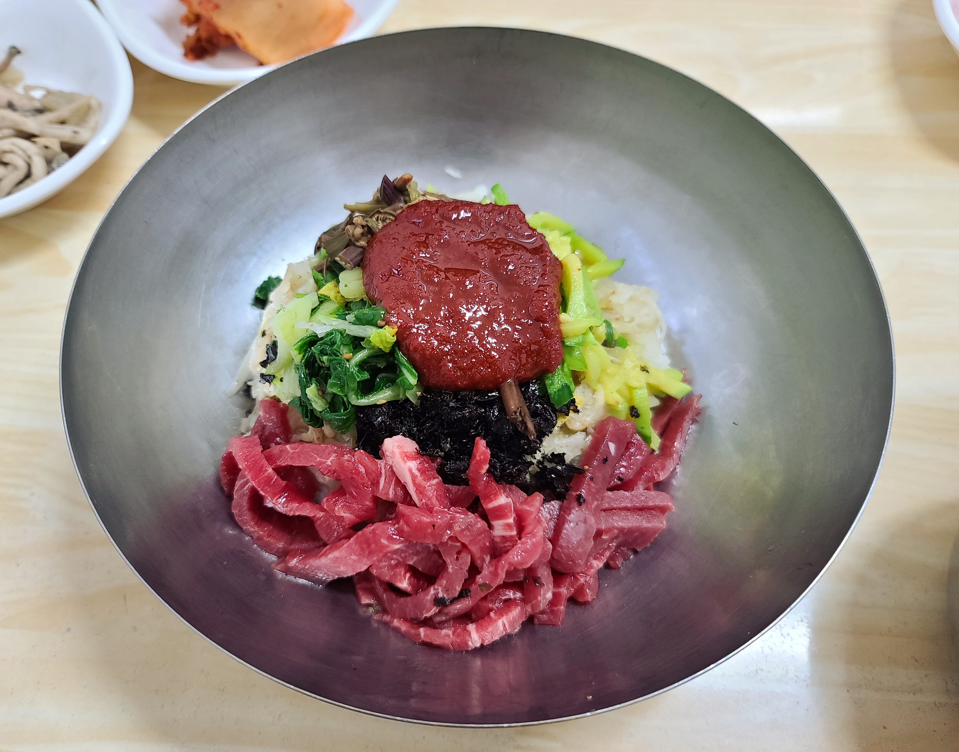 천황식당 모든 반찬과 함께 육회비빔밥의 모습도 사진으로 담아보았습니다. 육회비빔밥은 갓 썰어담은 신선한 소고기 육회와 호박, 고사리, 나물 등이 들어간 비빔밥이었습니다.