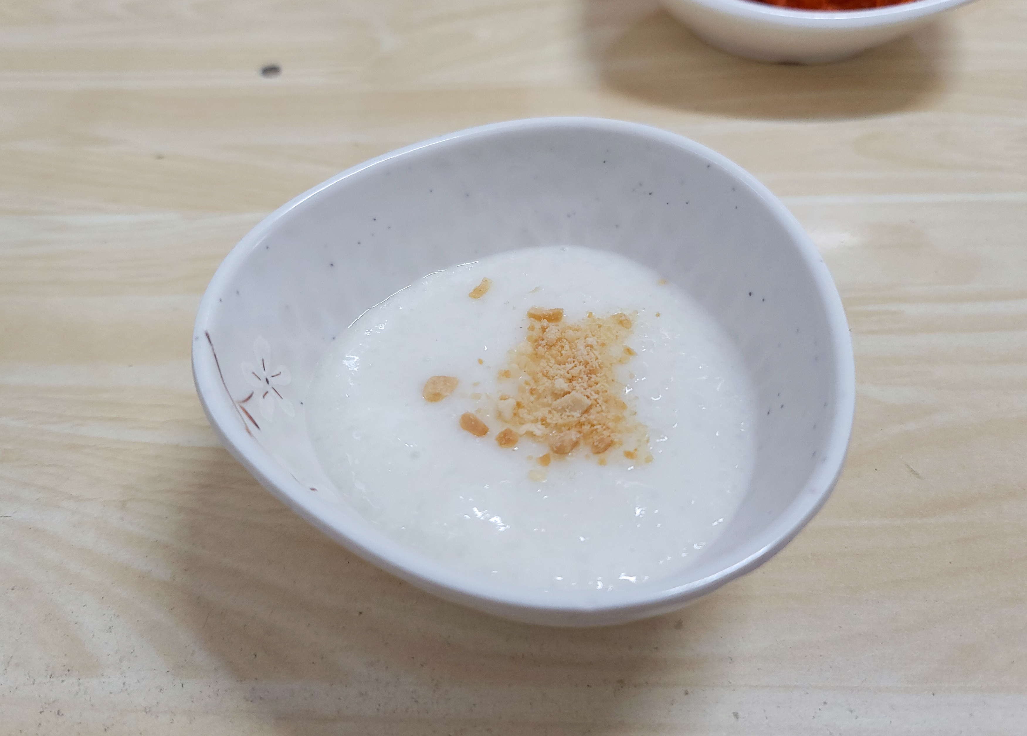 반찬과 함께 타락죽(우유를 섞은 흰 죽)이 나왔습니다. 타락 죽은 씨리얼을 우유에 넣어 불려먹는 느낌이었고, 반찬들은 맛있었지만 김치는 제 입맛에 안 맞았습니다.