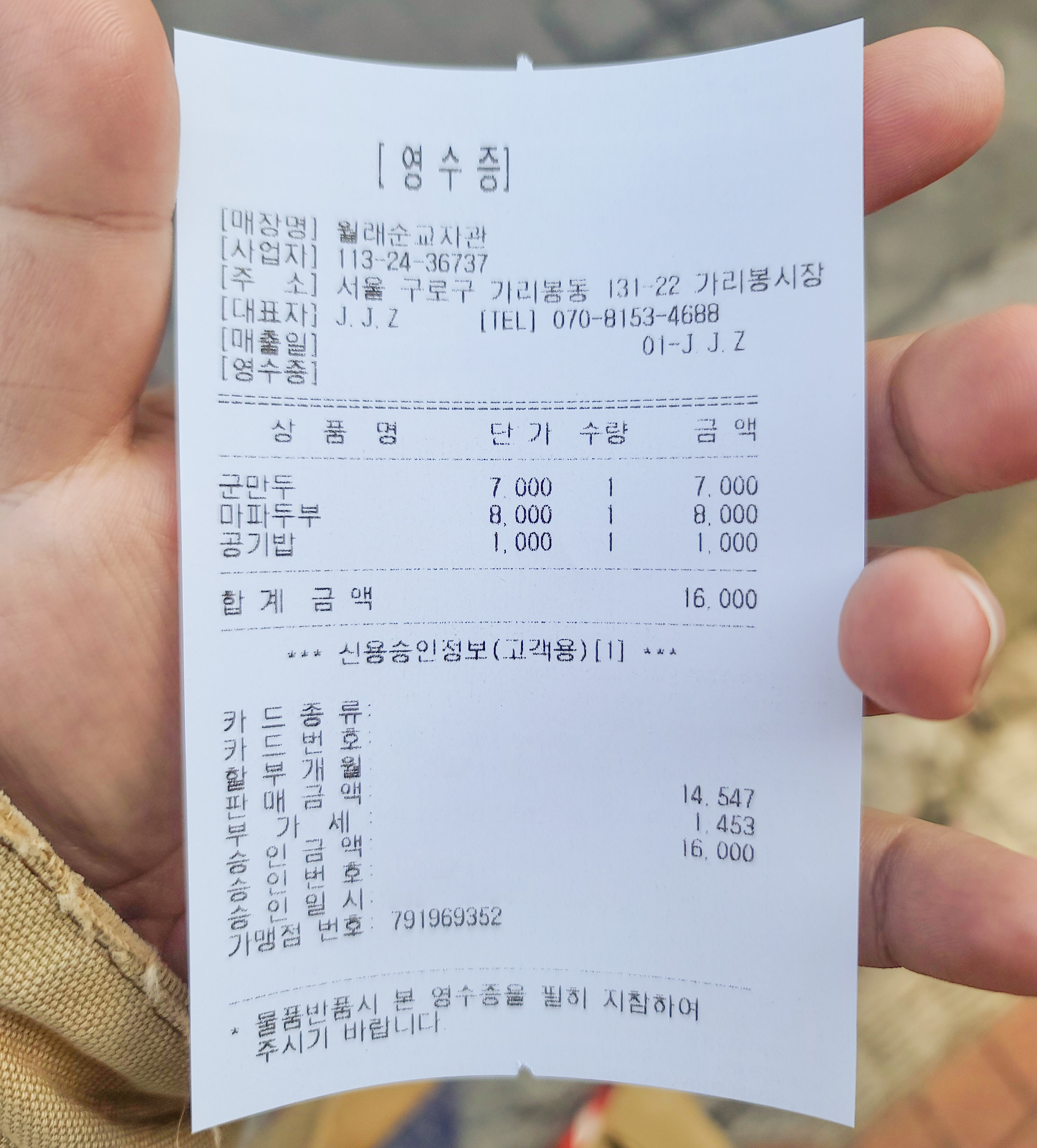 그래도 어찌어찌 모든 메뉴를 다 클리어했고, 식사 비용은 16,000원이 나왔습니다. 월래순교자관의 다른 메뉴들도 맛있을 것 같았는데, 제가 남길 것 같아서 더 못 주문한게 아쉽더라고요. 나중에 다른 사람과 함께 방문하면 만족스럽게 식사할 수 있을 것 같고요. 구로구 가리봉동 중식당 맛집으로 추천드리고 싶은 가게입니다.