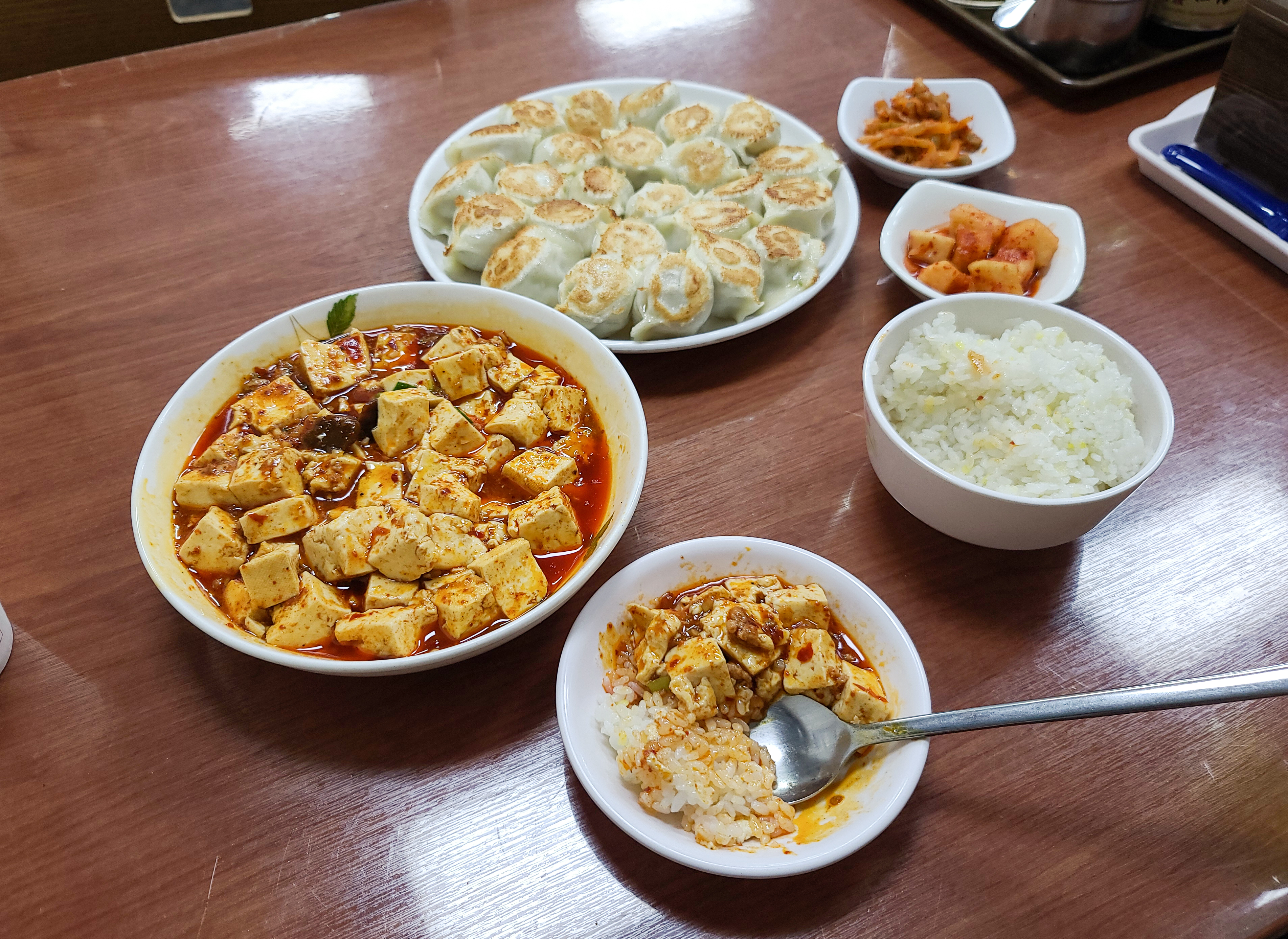 곧이어 제가 주문한 마파두부가 나왔습니다. 마파두부는 고추기름에 매콤하게 볶아내어 맛이 좋았는데, 밥이랑 비벼먹으니 정말 맛있더라고요. 마파두부의 양은 1.5인분 정도 되는 것 같았고, 공기밥은 별도로 주문하도록 되어있어 2인 1메뉴로 주문해도 괜찮을 것 같더라고요. 저는 여기에 군만두까지 주문했는데, 옆 테이블을 보니 군만두 양도 꽤 많이 나오더라고요.