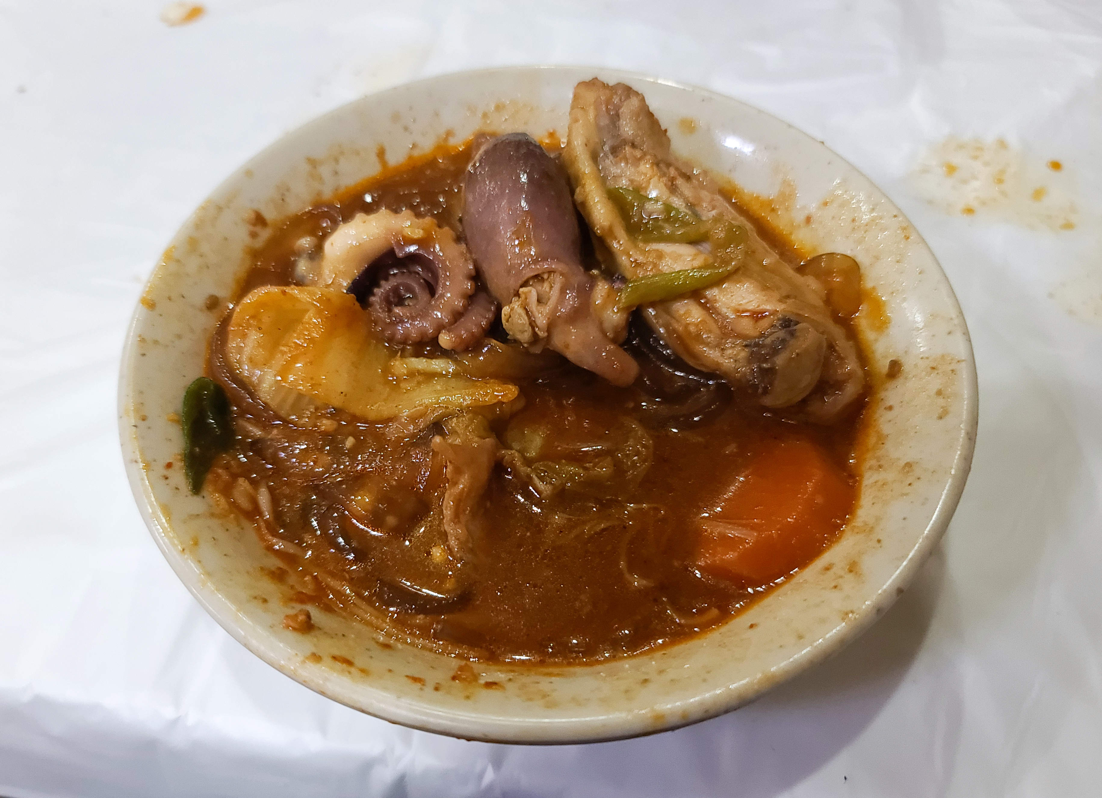 낙지찜닭 국물을 끓여주었습니다. 사장님께서는 중간중간 먹는 방법에 대해 친절하게 소개해주셨고, 허기진 상태에서 방문해서 찜닭에 들어있는 가래떡이나 채소부터 골라서 먹었습니다. 국물은 얼큰하면서도 입에 감기는 감칠맛이 있었습니다.