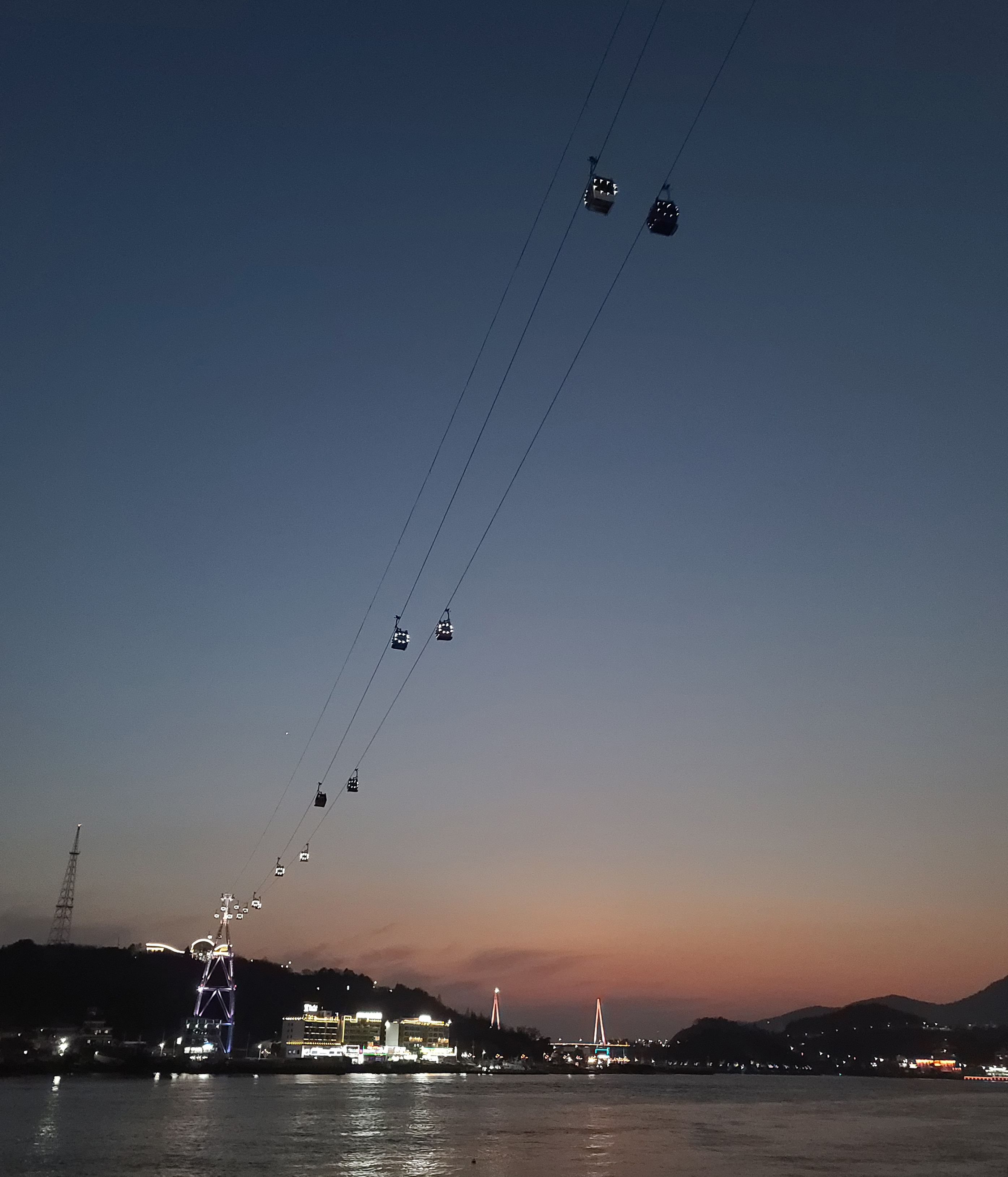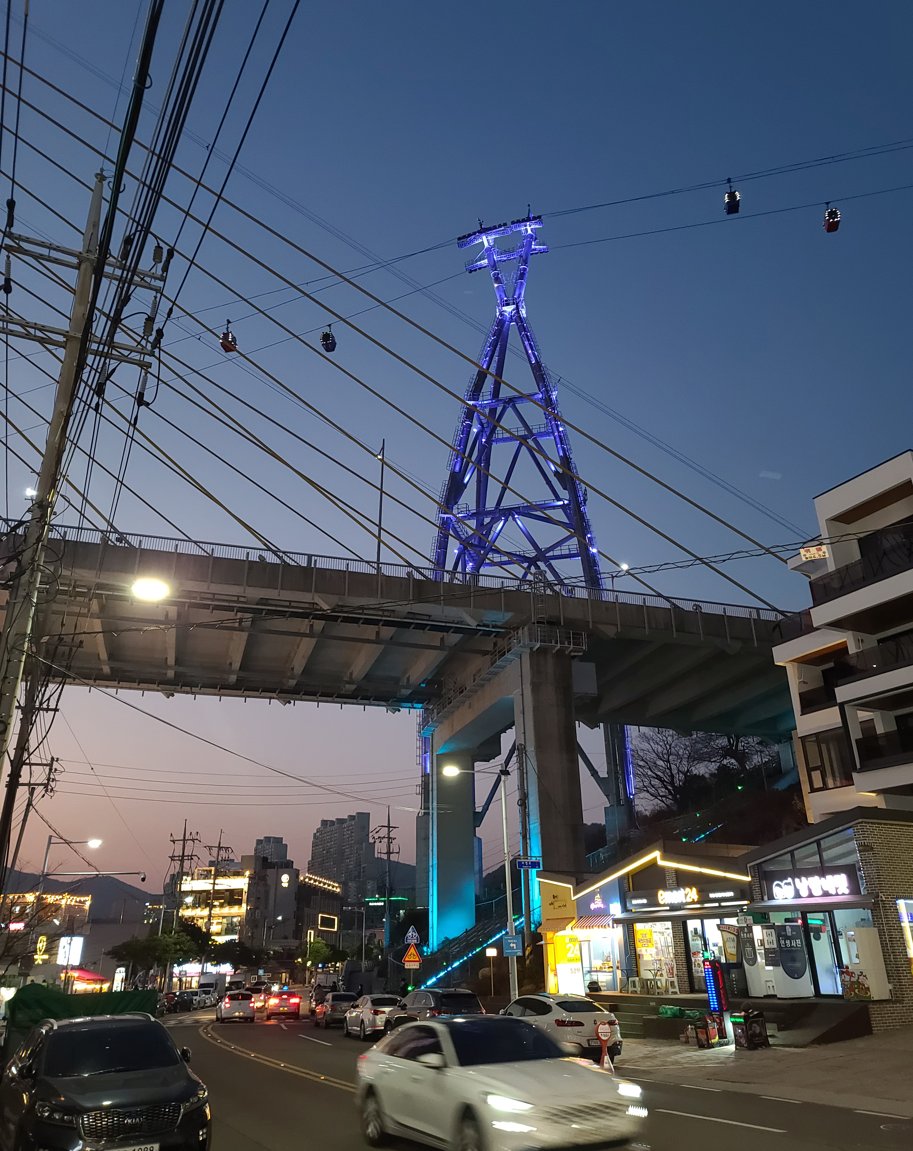 여수낭만포차거리에서 올려다보면 상공을 가로질러가는 여수의 즐길거리 중 하나인 여수해상케이블카의 모습도 볼 수 있었습니다. 연인끼리 왔으면 한 번 이용해볼 만한 것 같더라고요. 여수해상케이블카 관련정보(링크)